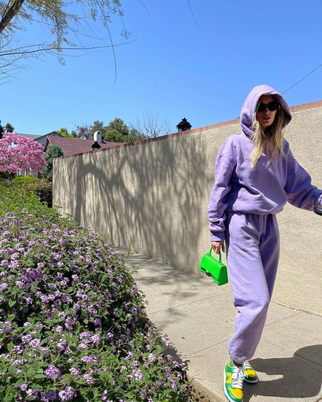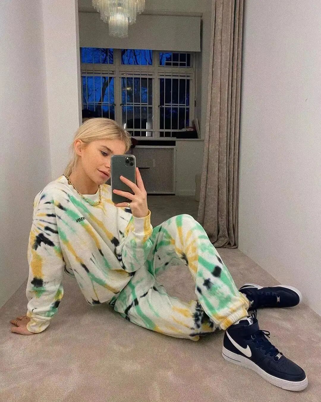 两种浅浅的色系都很适合成套穿,舒适随性又不乏高级感,有着一种清爽干净的sporty气质。只要多加一些配饰点缀,精致细节便能提升整体造型的质感。如果这些基础色穿腻的话,不妨还可以试试祖儿身上这种扎染款式的卫衣,穿起来也很有新鲜感。扎染卫衣根据扎染色彩的不同能表达出不同的风格,可以说是非常能彰显个性和独特风格的选择。除了彩色卫衣外,字母卫衣也是在剧中出镜率比较高的款式。相比起彩色卫衣的亮眼来说,字母卫衣更多了一点装饰性和趣味感。