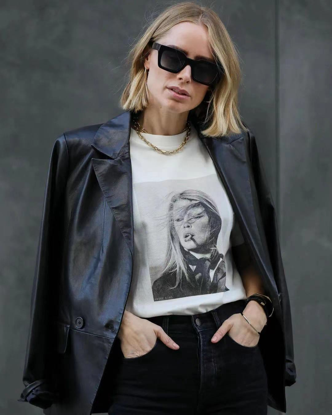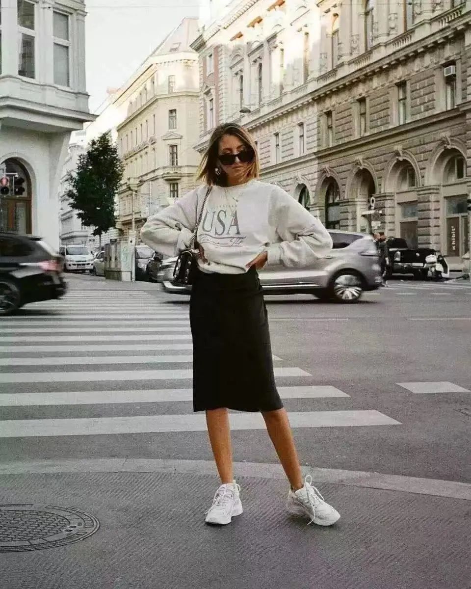 换上一条黑色阔腿裤,踩双球鞋就能美美地出门,简直是不费力赢很大的范本。