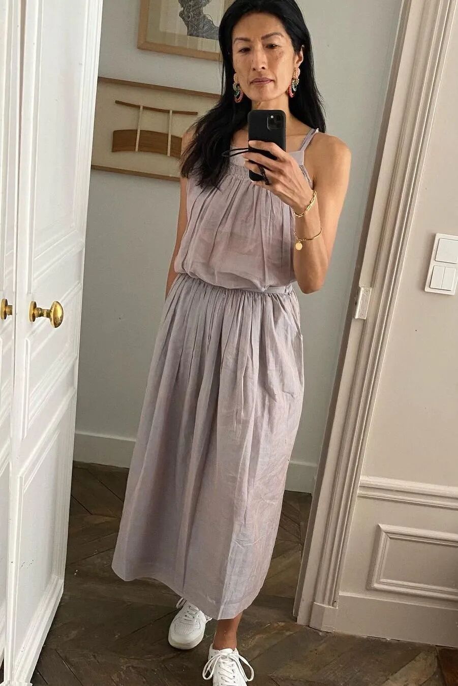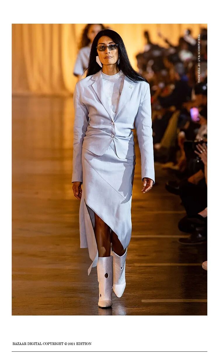 时尚圈从来不缺少豪门爱情故事,嫁入豪门之后的故事总是无人问津,而今天的故事无关爱恨情仇,只是一位中国香港姑娘远嫁巴黎,嫁入豪门30年,一切的幸福顺遂在她50岁那年生活发生了转变……爱人突然离世,让她50岁时选择从零开始,和20岁出头处于黄金期的模特们抢饭吃。最近这位亚洲面孔模特频繁出现在各大品牌秀场和杂志封面中,她就是Suzi de Givenchy。你对她的姓一定很熟悉,奢侈品品牌Givenchy家族成员——Huber de Givenchy是她的丈夫,Givenchy品牌创始人是他的叔叔。世人眼中嫁入豪门的八卦谈资,对于Suzi来说,这只是一个年轻的中国香港姑娘在巴黎度假时遇到人生挚爱,然后走入婚姻殿堂的浪漫故事。"D’abord pour l’amour d’un homme et maintenant pour l’amour d’une façon de vivre à l'européenne."(最初,是因为对一个男人的爱,现在是出于对欧洲生活方式的爱。)因为一个人而爱上一座城的故事,看似老套但在Suzi身上却真实发生着。这一切的转折直到爱人去世,Suzi在低沉过后选择重新整理自己,走出去看看。埃及、柬埔寨,置身更广阔的世界时,更会明白爱与生活的意义。可能正是因为这段时间的休憩,Suzi拥有了开始新生活的信心。知名模特经纪公司Next Model的经纪人在活动中,一眼发现了这个脸上有皱纹、眼中有故事的女人,出色的身材优势让Suzi进入模特行业变得顺理成章。Off-White 2020春夏系列成为她的首秀,生涩的台步掩盖不住她独特的气质,所有人都对这个黑发黄皮肤的女人产生了好奇,这一年她50岁整。等出现在Lemaire秋冬秀场上时,她已经变得气定神闲。什么样的女人会穿Lemaire?那大概就是像Suzi这般,知道自己想要什么适合什么,才能坚定不移做出选择的女人。极简和廓形有时需要的不仅是身材和样貌,一个人通过时装想讲的那个故事才吸引人。看过Suzi的大片,你会发现她格外适合大廓形,甚至有些drama的时装大片。往往“大声”的设计,需要一点安静坚定的力量作为平衡。在众多品牌中,Suzi和Balenciaga的联系分外密切,几乎每场秀都有Suzi的身影。Givenchy先生和Balenciaga创始人Cristobal Balenciaga之间亦师亦友的关系,让Balenciaga找到了和自己品牌精神契合的Suzi,可能这就是冥冥之中微妙的缘分。Balenciaga秀场上许多先锋的理念,或许让你认为这才是属于Z世代的时装。在一众年轻面孔中,Suzi的出现让人感到惊喜却不突兀。这种刻意营造的“格格不入”,在Balenciaga打造的世界中成为刚刚好的契合。这时忽然明白经纪人看到Suzi时说的那句:“ Suzi, tu ne le sais pas mais tu vas changer les choses."(Suzi,你或许还不知道,但你注定会改变一些事情。)Suzi的出现让我们看到时尚更多的可能性,这种无声的语言让不同身材、年龄、人种的人找到了自己。DriesVan Noten 2021~2022AW在AZ Factory巴黎时装周压轴大秀上,44位世界顶尖设计师同台呈现了一场属于Abler的盛世。Balenciaga设计师Demna把最能代表的Balenciaga风格的这件粉红色廓形礼服留给了最爱的Suzi。私服中,Suzi把舒适和取悦自己放在首位。一件穿了25年的GAP牛仔夹克,但她依然爱这种简约的时髦和夹克上承载的记忆。对于她来说,几百块钱的人字拖和上千元的Jimmy Choo一样,都只是装点自己的道具。一件质量上乘的简单白T搭配牛仔裤,她的私服穿搭就是这样简单清爽。