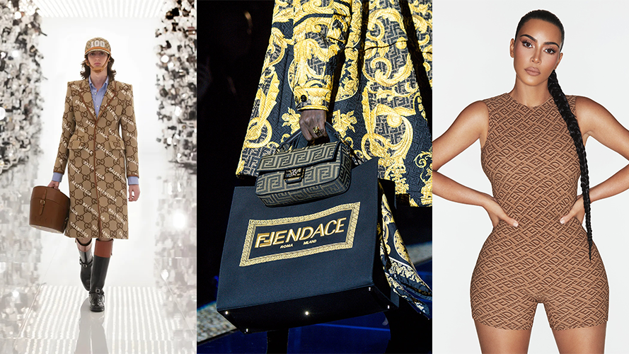 有几个大品牌,2021年异常活跃,重磅炸弹像放烟花似的一个接一个。过一百岁生日的Gucci和重启高定的Balenciaga,联名互印水印;Fendi 不仅牵手了Versace,甚至还和Kim Kardshain的内衣品牌Skim“勾搭”在一起,这些合作,真的称得上跨世纪。