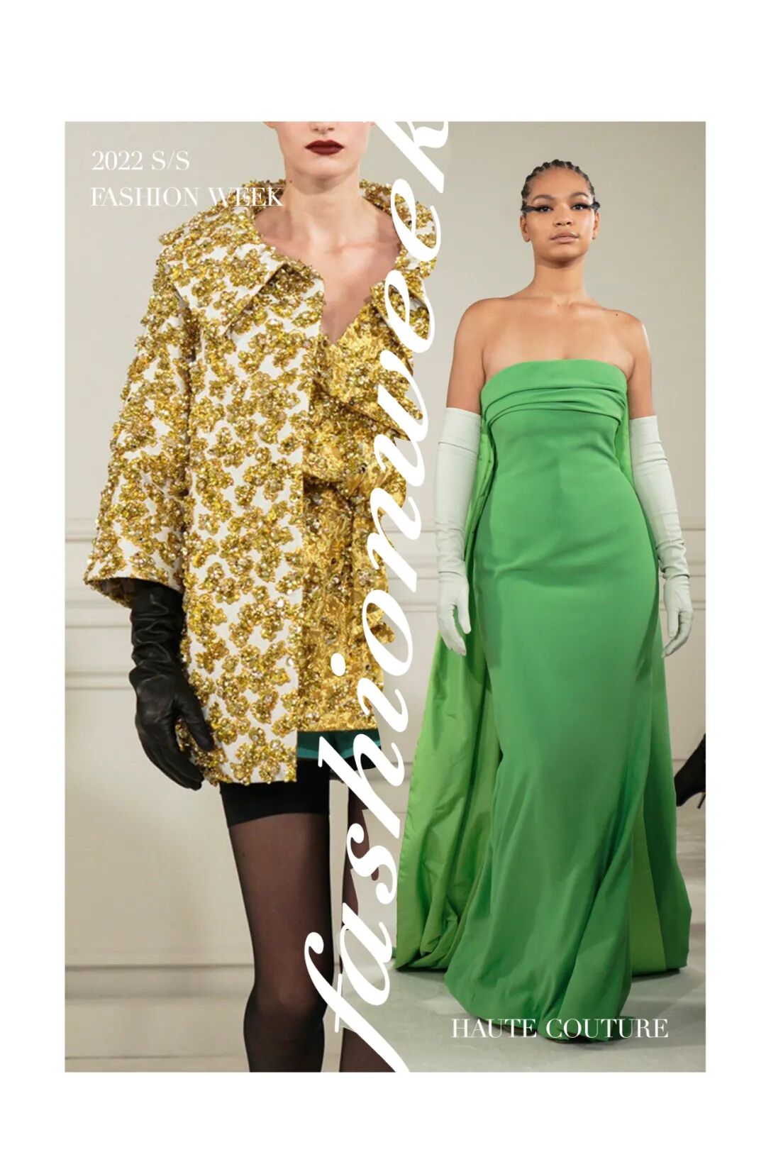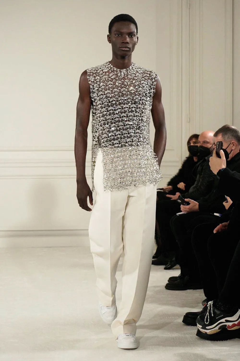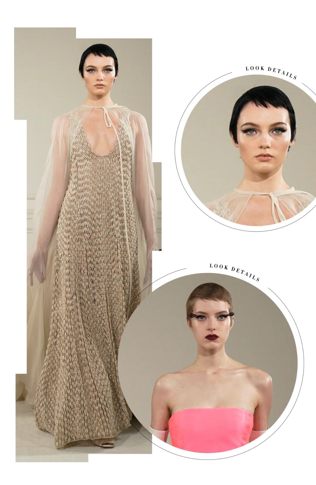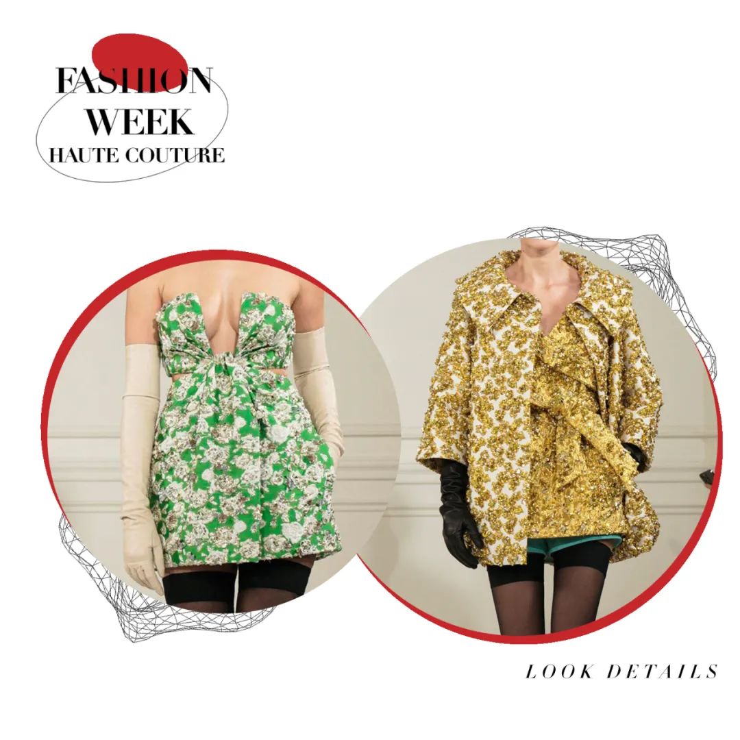 霓虹色的及踝连衣裙通过四层乔其纱的相互作用力创造了一种适合身体的自然弹性,将躯体紧密包裹,柔软飘逸材质与模特身体的互动更体现出身体线条的妙曼迷人。华丽工艺紧紧包裹着身体,无论高矮胖瘦,都能为你贴身重塑出独一无二的轮廓。比如巧克力色的弹力薄纱连衣裙上镶嵌着两公斤重耗时三个月的手工威尼斯玻璃珠刺绣,在服装的加持下,被视作“不够完美”的体态也可以优雅地淋漓尽致。颜色艳丽的罗缎礼服在领口周围制成了巨大的蝴蝶结和荷叶装饰,配合模特丰满的身材让整体看起来充斥着加倍浪漫的气势。高定以更多元的形式展现,华服不再只有长裙,或者可以说不再只有裙子。率性的西服套装,俏皮的超短裙,甚至裤裙搭配都可以成为展现不同风格女性多种姿态的选择。除此之外,Piccioli还把最“普通”的日常服装廓形融入了高级时装姿态,白色T恤与缎面半身裙进行了重新结合,华丽的亮片晚礼服短裙可与日常外套及丝袜搭配出随意切换的日常氛围。尤其是男装,这是品牌第三次推出男装高定,男模也穿上华丽的刺绣套装走上T台。手工刺绣亮片以夸张的密度布满了日常衬衫及西服,男装的美感在华丽工艺的模糊下提升到新的水平。最后几件高定礼服向所有人展示了时装如何在身体周围形成轮廓的精湛技艺,通过面料突出个体形态,并通过缝纫的操纵让服装为躯体服务,勾勒出属于每个个体最独一无二的曲线美。Piccioli说:“这么做是为了让那些正在为体型而苦苦挣扎的年轻人传递一个强有力的信息。如果她(模特们)很漂亮,那么你可以很漂亮。”工艺细节看点十足,手工钉珠亮片与镂空刺绣或薄纱褶皱结合,展现了手工工坊深厚的面料再造工艺,极尽华丽。而低饱和度的色彩更整套look套上一层温柔优雅的氛围感,奢华大气又不失沉稳气质。 而高饱和度的黄绿色系搭配亮片与手工钉珠更加复古亮眼,犹如星光漫溢与缤纷色彩交织而成的华丽复古梦境。本次秀场妆容同样贯穿了低调大气的调性,妆面没有多余夸张的色彩,用黑色上挑的眼线甚至贴在睫毛位置的黑色羽毛来强调眼睛。唇色用裸色系一笔带过或用暗红色增强气场,看似极简的妆容更能体现面容五官的独特性。一字带的高跟鞋和浅口平底鞋贯穿整个秀场。极简的鞋履造型让双脚更加轻盈优雅,随性自在,将视线重点还给服饰造型。鞋子的纯色色彩与服装色彩相呼应,称得上点睛之笔。