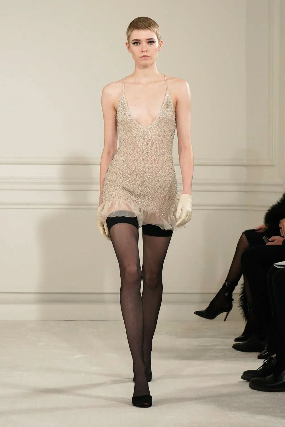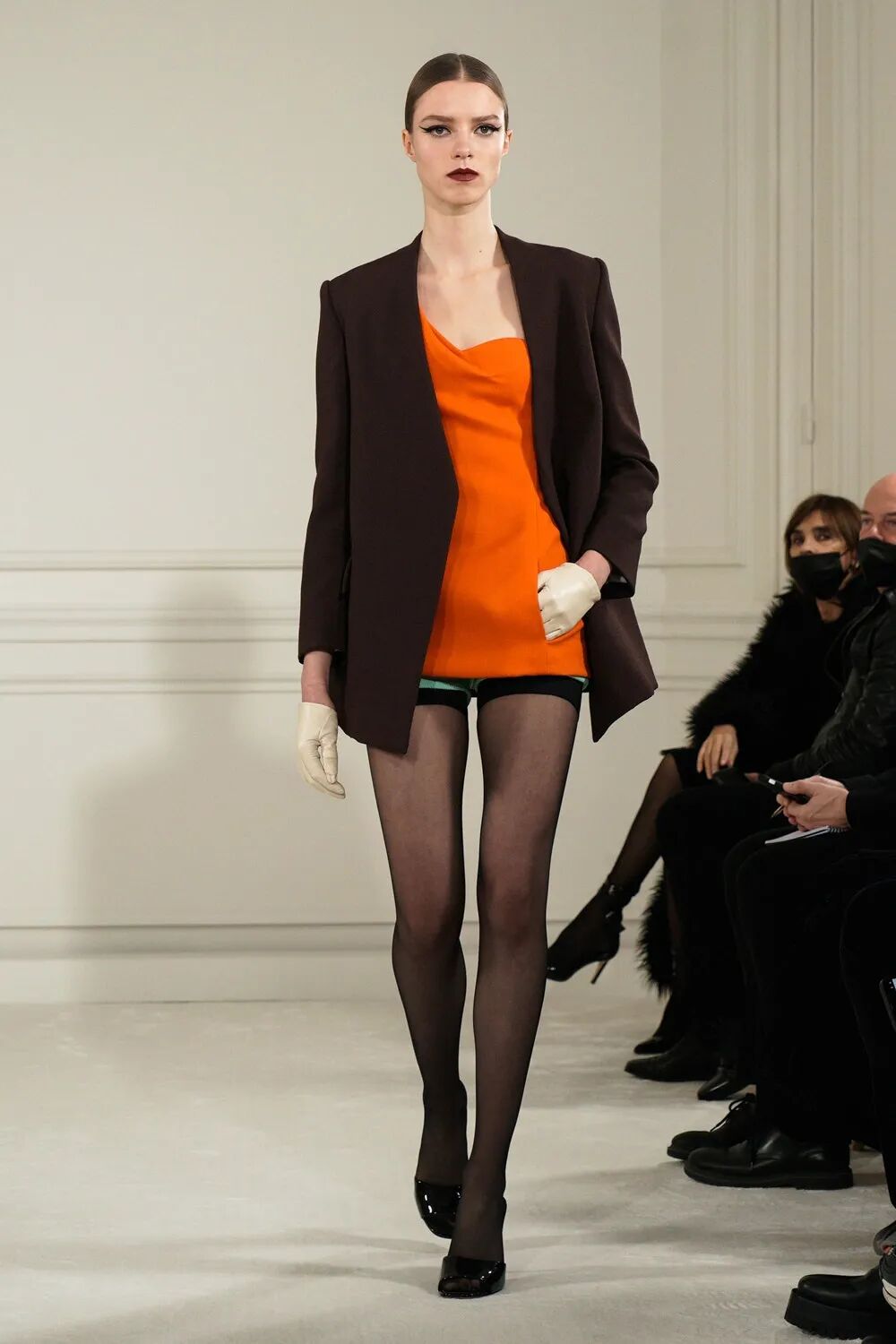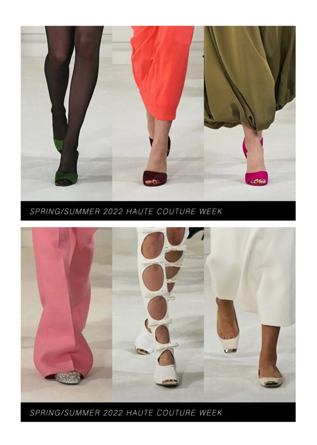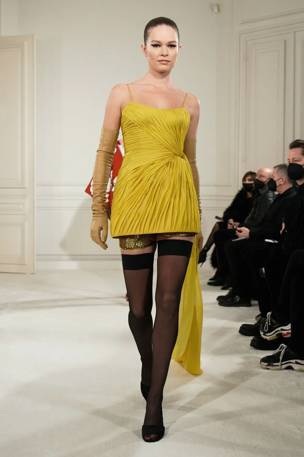 霓虹色的及踝连衣裙通过四层乔其纱的相互作用力创造了一种适合身体的自然弹性,将躯体紧密包裹,柔软飘逸材质与模特身体的互动更体现出身体线条的妙曼迷人。华丽工艺紧紧包裹着身体,无论高矮胖瘦,都能为你贴身重塑出独一无二的轮廓。比如巧克力色的弹力薄纱连衣裙上镶嵌着两公斤重耗时三个月的手工威尼斯玻璃珠刺绣,在服装的加持下,被视作“不够完美”的体态也可以优雅地淋漓尽致。颜色艳丽的罗缎礼服在领口周围制成了巨大的蝴蝶结和荷叶装饰,配合模特丰满的身材让整体看起来充斥着加倍浪漫的气势。高定以更多元的形式展现,华服不再只有长裙,或者可以说不再只有裙子。率性的西服套装,俏皮的超短裙,甚至裤裙搭配都可以成为展现不同风格女性多种姿态的选择。除此之外,Piccioli还把最“普通”的日常服装廓形融入了高级时装姿态,白色T恤与缎面半身裙进行了重新结合,华丽的亮片晚礼服短裙可与日常外套及丝袜搭配出随意切换的日常氛围。尤其是男装,这是品牌第三次推出男装高定,男模也穿上华丽的刺绣套装走上T台。手工刺绣亮片以夸张的密度布满了日常衬衫及西服,男装的美感在华丽工艺的模糊下提升到新的水平。最后几件高定礼服向所有人展示了时装如何在身体周围形成轮廓的精湛技艺,通过面料突出个体形态,并通过缝纫的操纵让服装为躯体服务,勾勒出属于每个个体最独一无二的曲线美。Piccioli说:“这么做是为了让那些正在为体型而苦苦挣扎的年轻人传递一个强有力的信息。如果她(模特们)很漂亮,那么你可以很漂亮。”工艺细节看点十足,手工钉珠亮片与镂空刺绣或薄纱褶皱结合,展现了手工工坊深厚的面料再造工艺,极尽华丽。而低饱和度的色彩更整套look套上一层温柔优雅的氛围感,奢华大气又不失沉稳气质。 而高饱和度的黄绿色系搭配亮片与手工钉珠更加复古亮眼,犹如星光漫溢与缤纷色彩交织而成的华丽复古梦境。本次秀场妆容同样贯穿了低调大气的调性,妆面没有多余夸张的色彩,用黑色上挑的眼线甚至贴在睫毛位置的黑色羽毛来强调眼睛。唇色用裸色系一笔带过或用暗红色增强气场,看似极简的妆容更能体现面容五官的独特性。一字带的高跟鞋和浅口平底鞋贯穿整个秀场。极简的鞋履造型让双脚更加轻盈优雅,随性自在,将视线重点还给服饰造型。鞋子的纯色色彩与服装色彩相呼应,称得上点睛之笔。