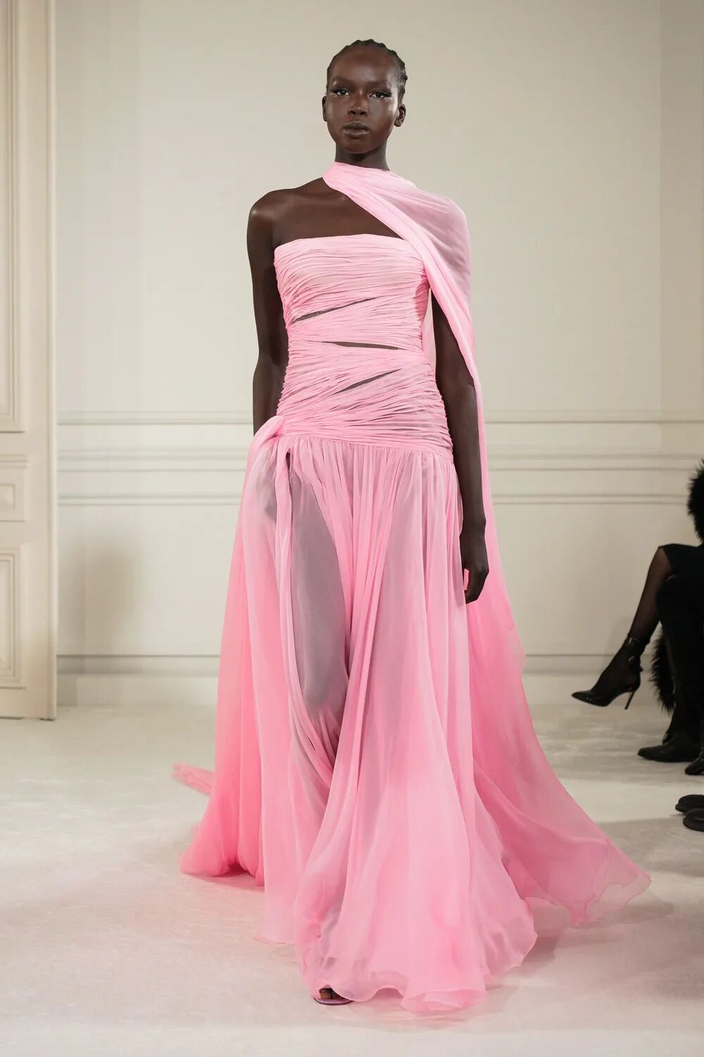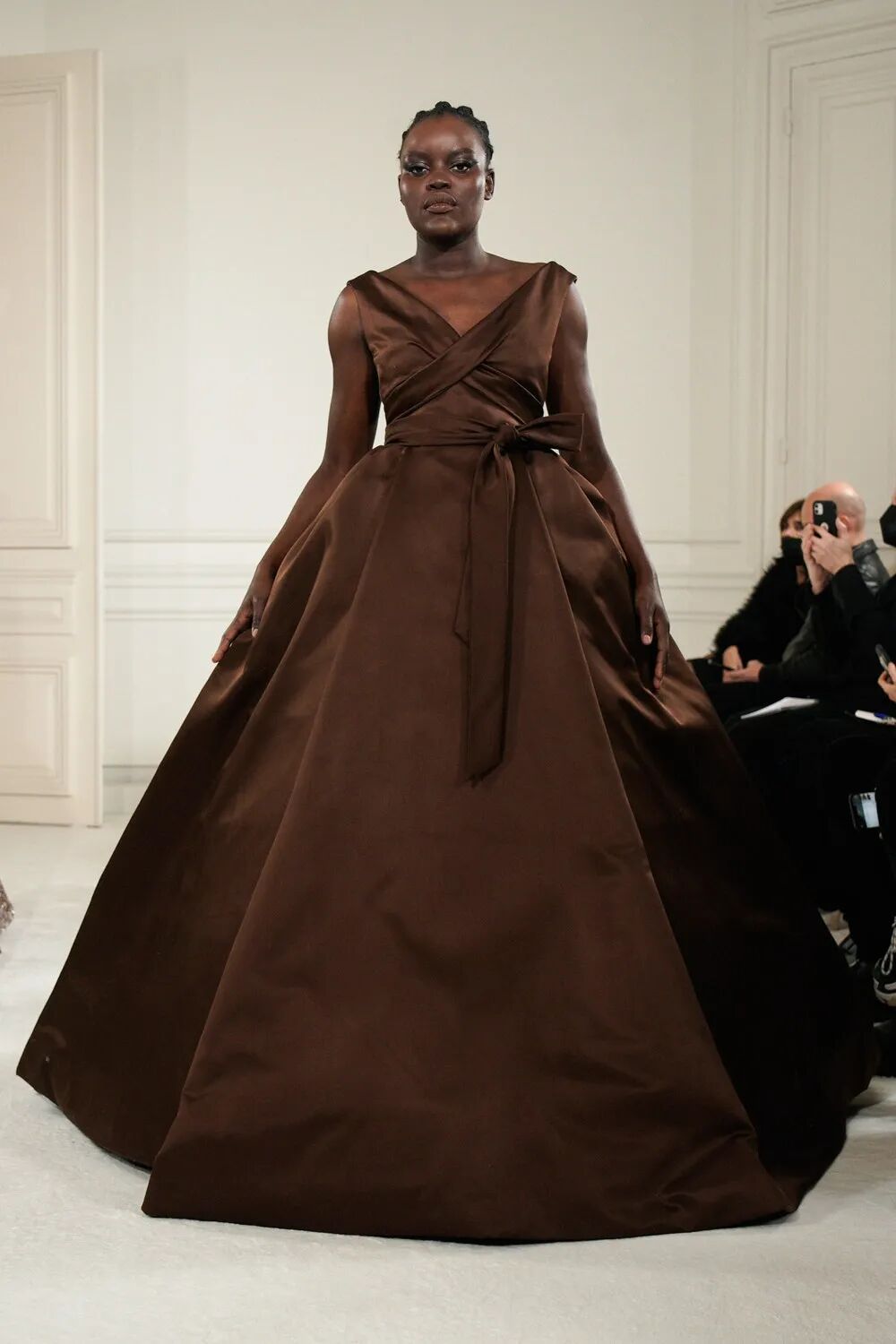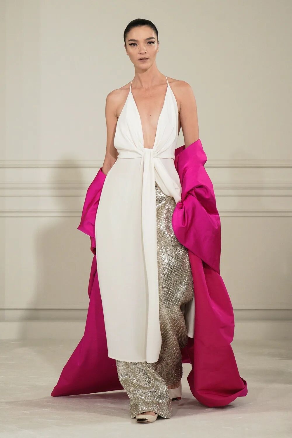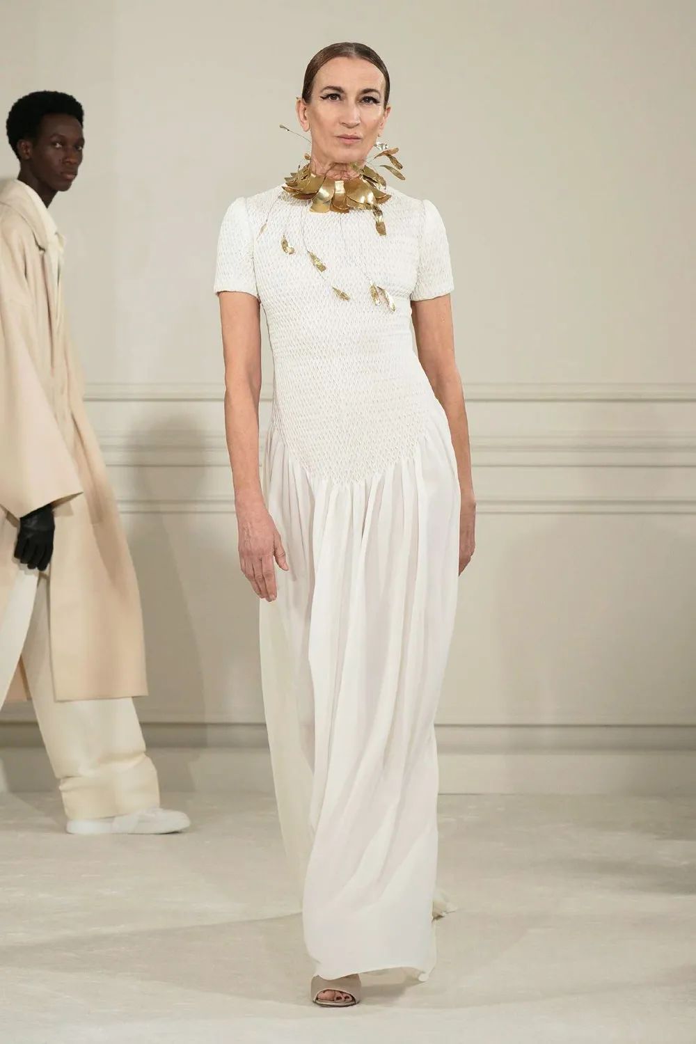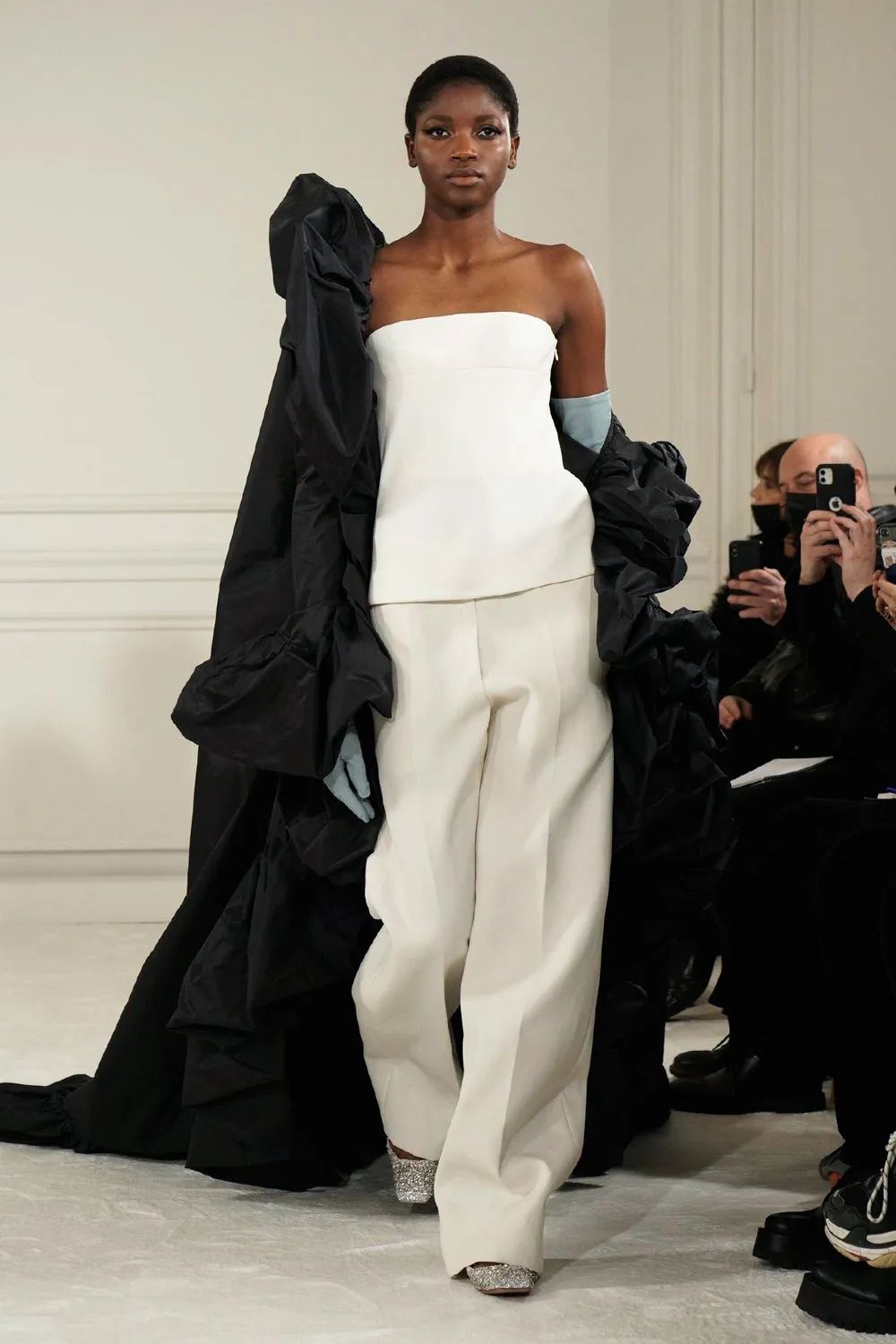 令人惊喜的是,体型各异,肤色不同,甚至比时装秀平均水平年长的模特并没有显得格格不入,高级定制服装的风格没有因为身体各具姿态而分崩离析,反而从不同体态构成的对话中重新确立,撷取到一个连贯的见解和主张。衣服就像是建筑,一种尺寸并不适用于所有人,简单的成比例放大或缩小也无法做到完全合适。而高定工艺对躯体美的塑造此刻在形态各异的模特身上被淋漓尽致地展现出来。