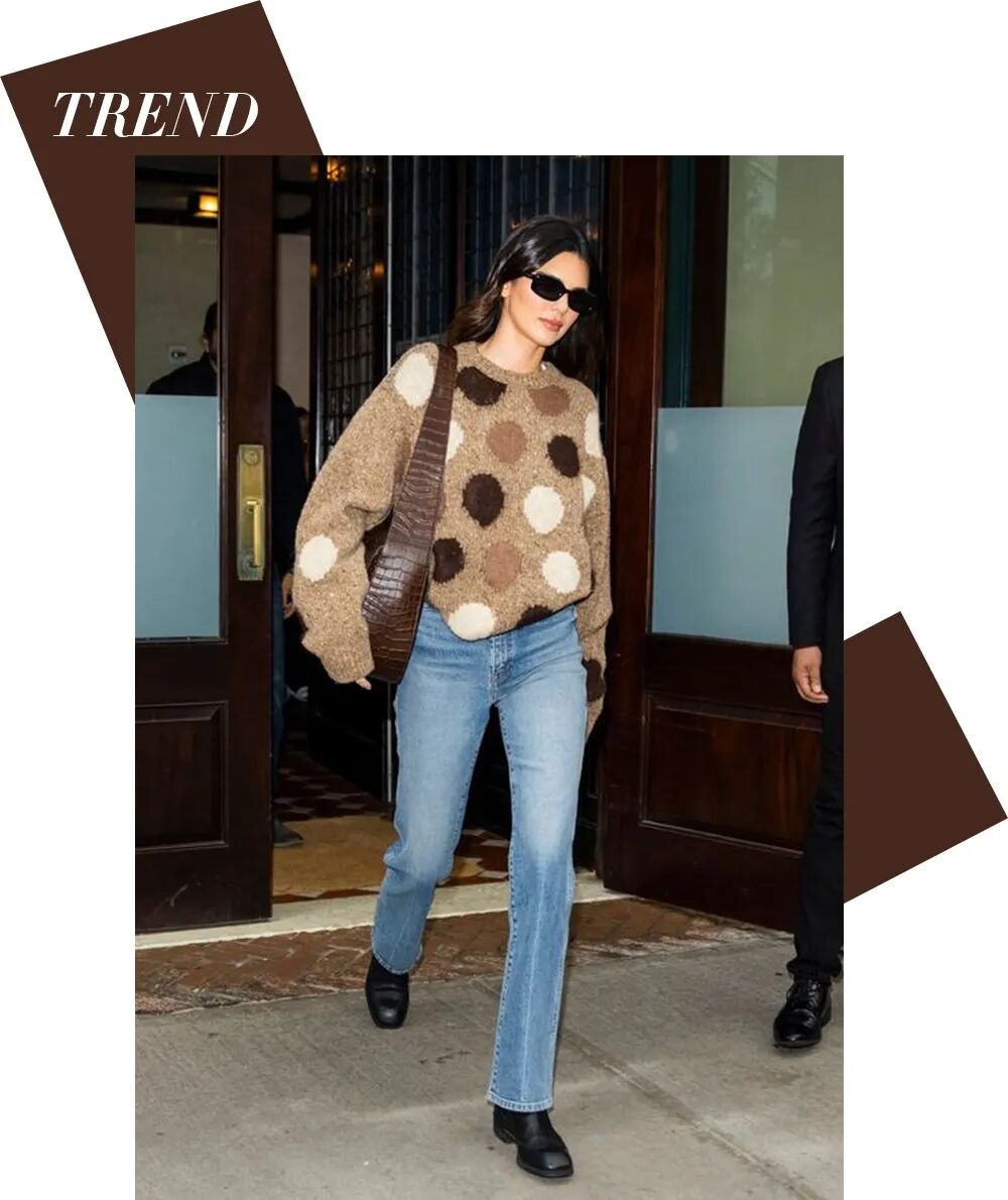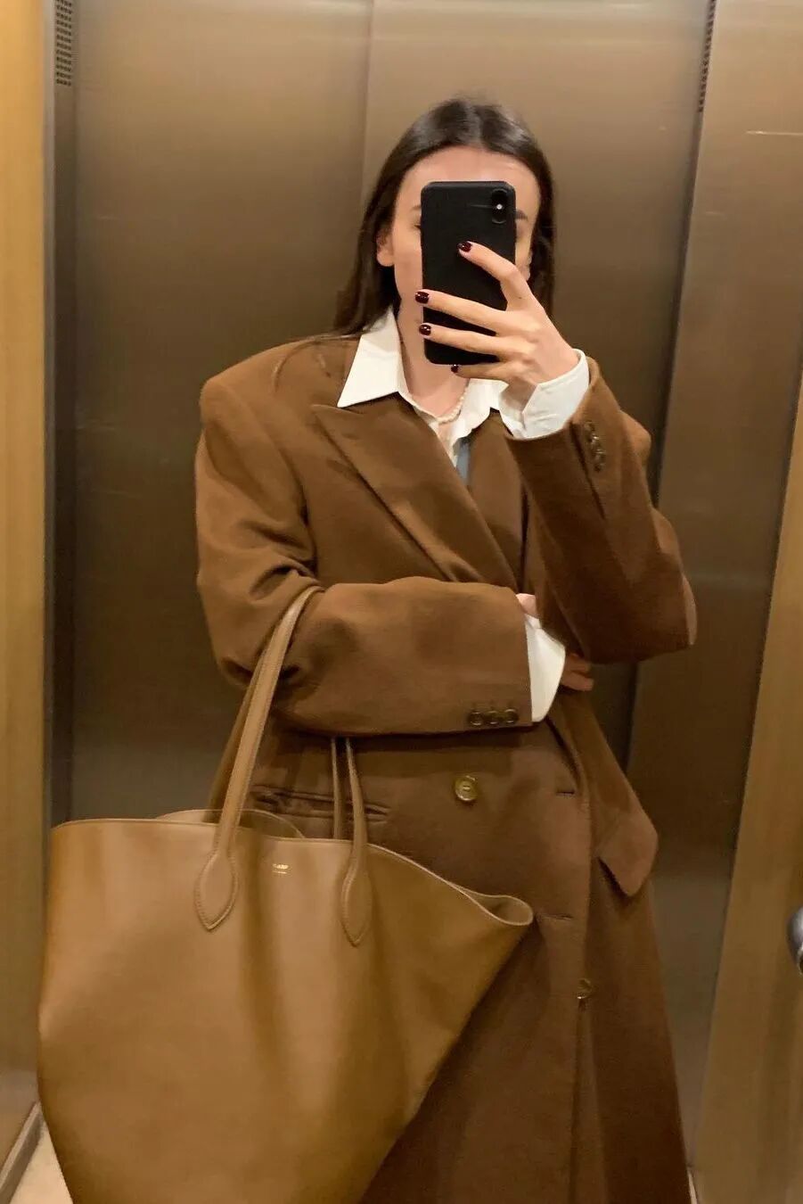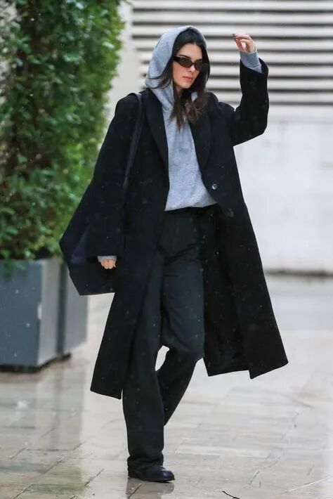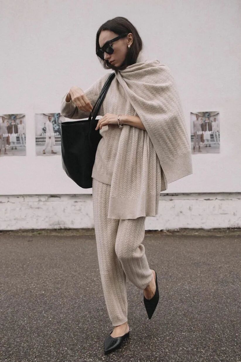 秋冬时期,搭配大包的服装一定不要太过膨胀,比如羽绒服、棉服等,有板型的西装大衣和柔软贴身的针织是更好的选择。