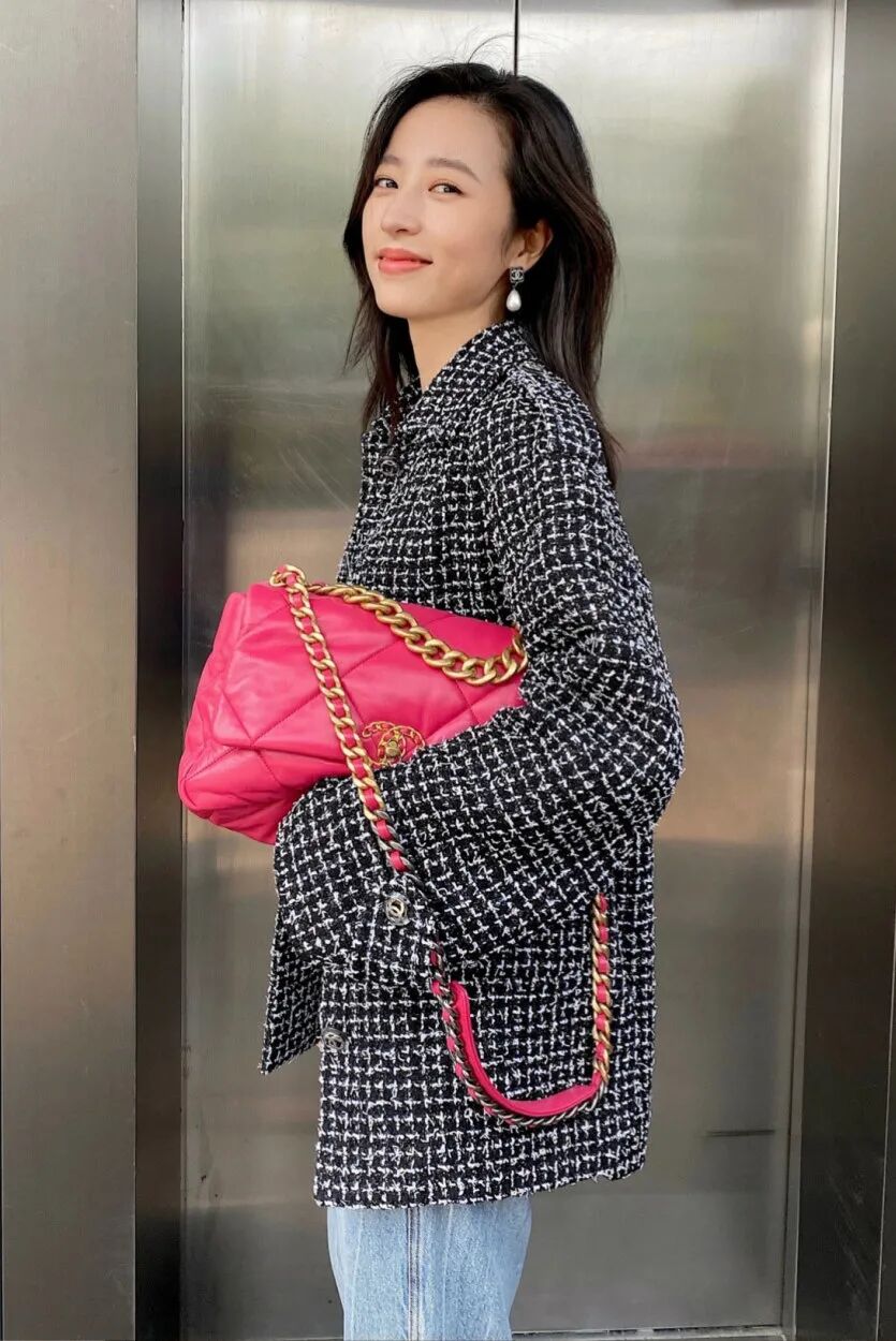 所以想要不被大包“压垮”,包包的位置就要尽量高,但如果遇到像Chanel 19这样,本身包带不可调节的包款,比起单肩背更推荐斜挎或是手持的方法。