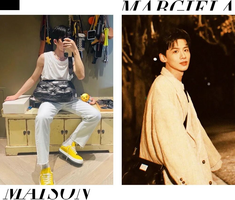 和他在社交平台互动频繁的白敬亭,对于穿搭也有一番自己的见解。两个人同时都选择的Maison Margiela Glam Slam枕头包,果然帅哥的品味都是相似的。