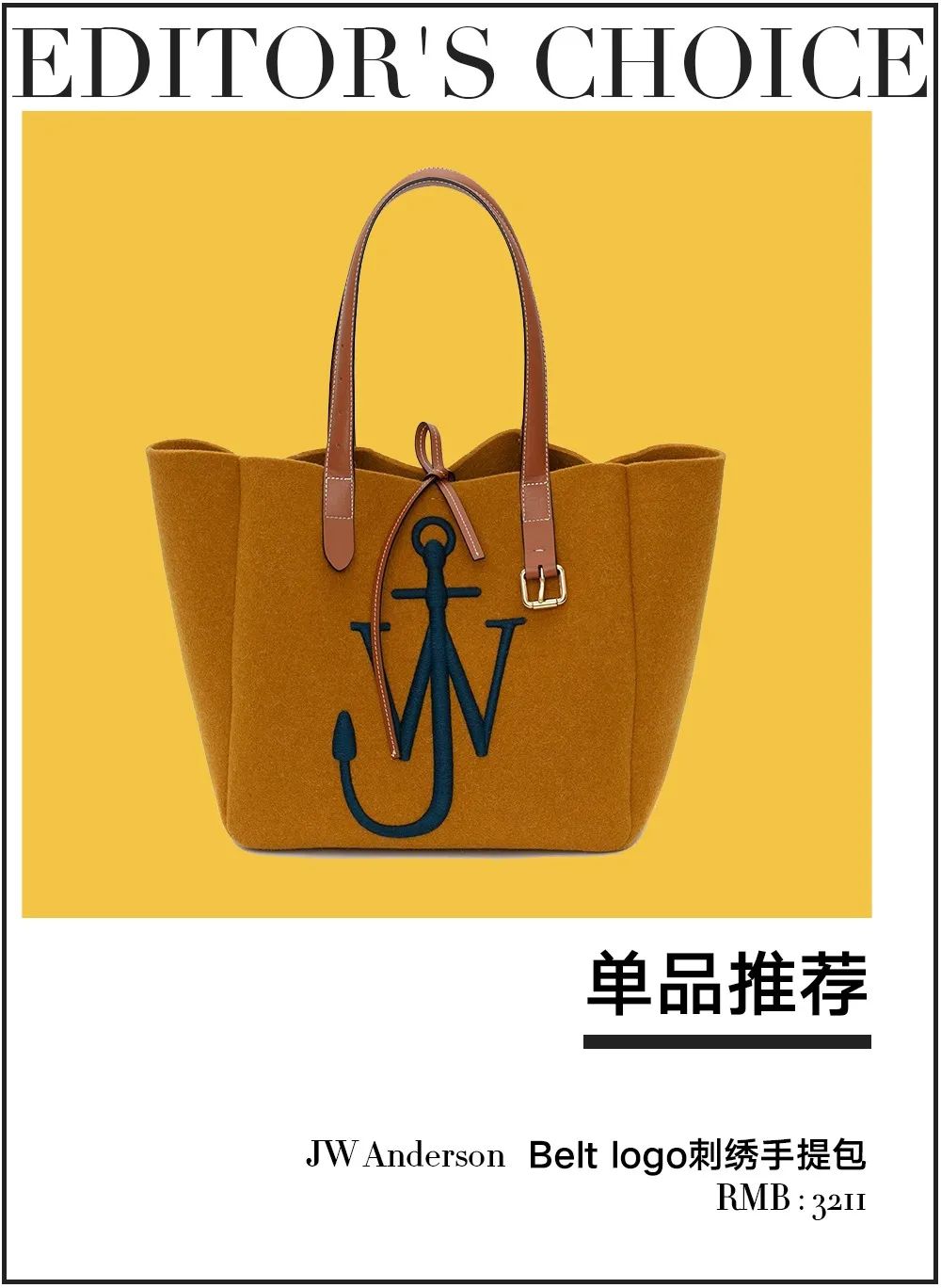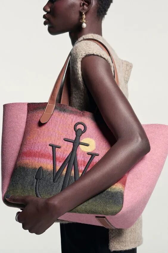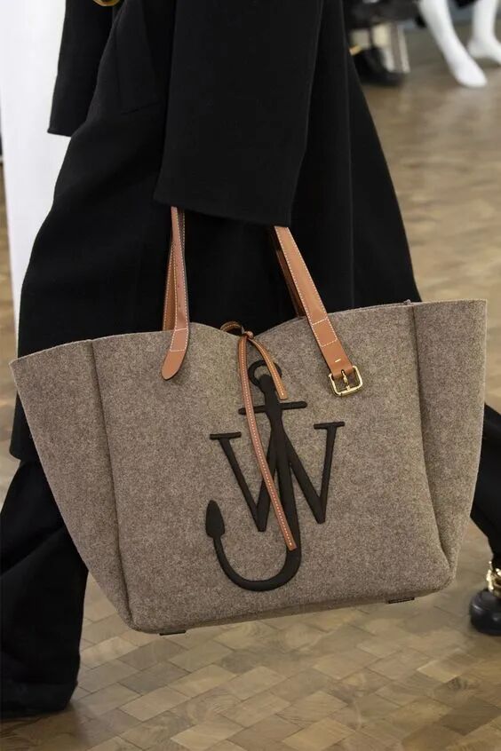 除了皮质,托特包的材质还可以有很多选择,JW Anderson的这款毛毡托特包,在背带的部分保留了皮质的设计,而包身运用了毛毡材质,无论是手提还是肩背都是不错的选择。