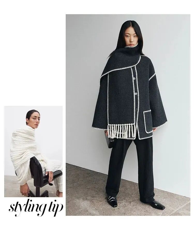 在精心搭配的造型上再围起一条宽大温暖的羊绒围巾,冬季的每日穿搭才算完整。