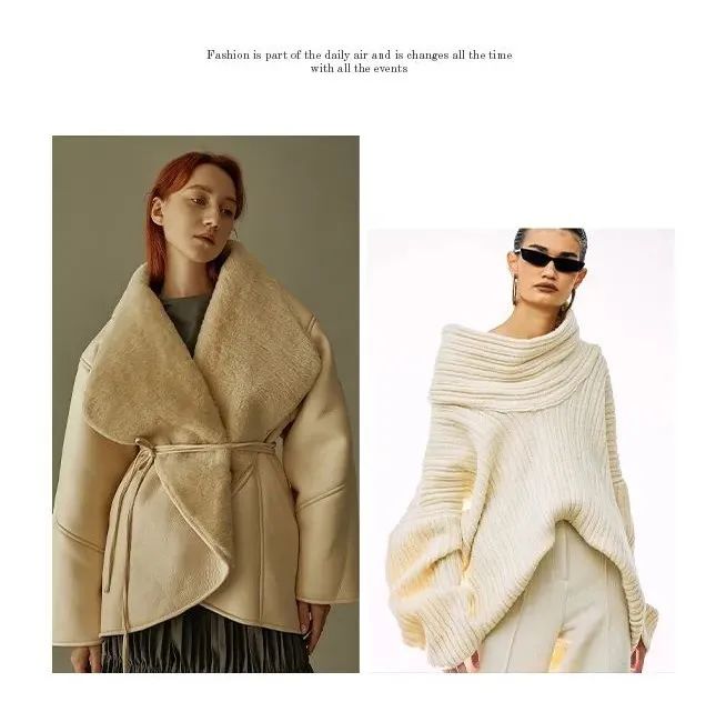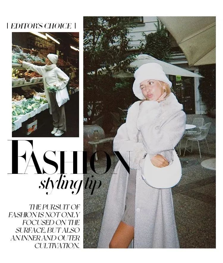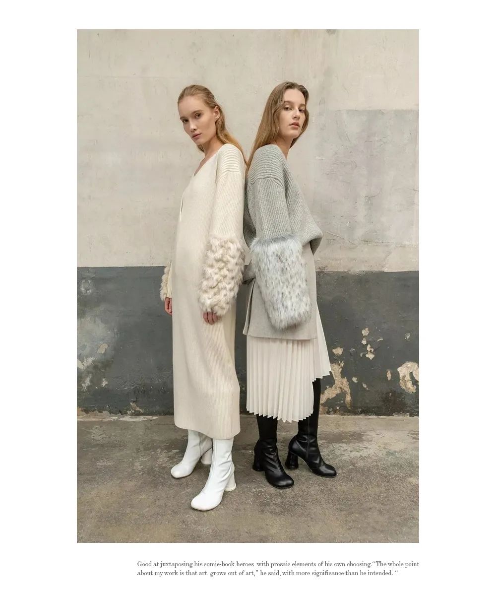 皮毛一体的夹克、异形羊绒上衣,轻松打造奢华时髦感。浅灰色和米白色羊绒套装与黑白长靴则组成了跨季色彩CP。