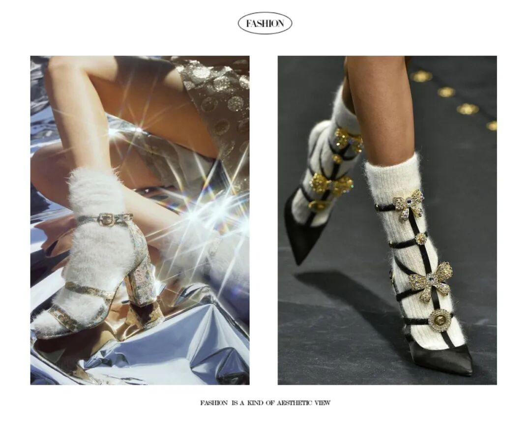 更明艳一些的紫色羊绒中筒袜和粗跟单鞋组合也十分吸睛,穿上立马变身鬼马少女。