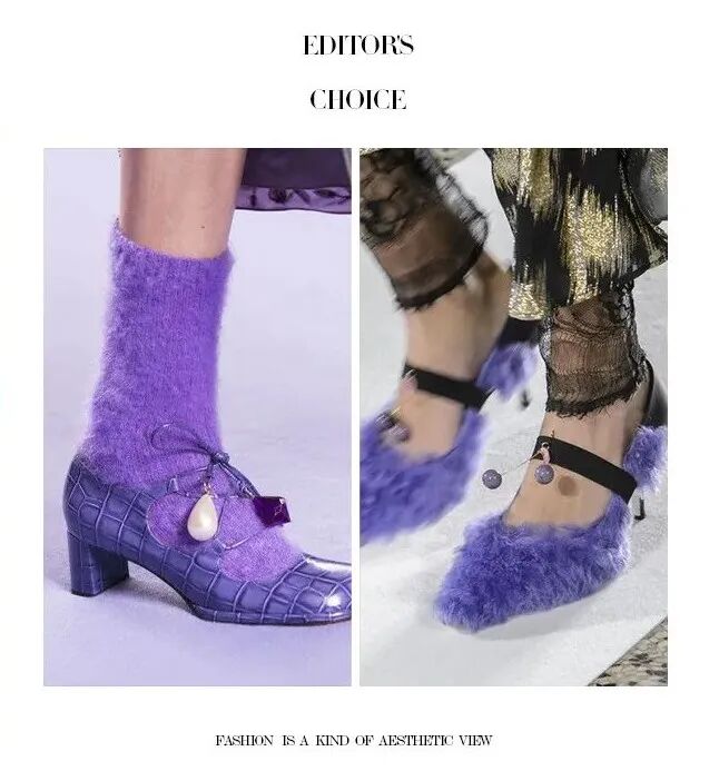 说到脚下物,Pantone2022年流行色长春花蓝打头阵。鞋面布满蓝紫色羊绒的黑色松紧带高跟鞋十分惹眼,带子上两颗紫色珠球增加俏皮感。尽管这双绒绒鞋就算买了也不会舍得穿上街,但也让我忍不住想要为它花钱!