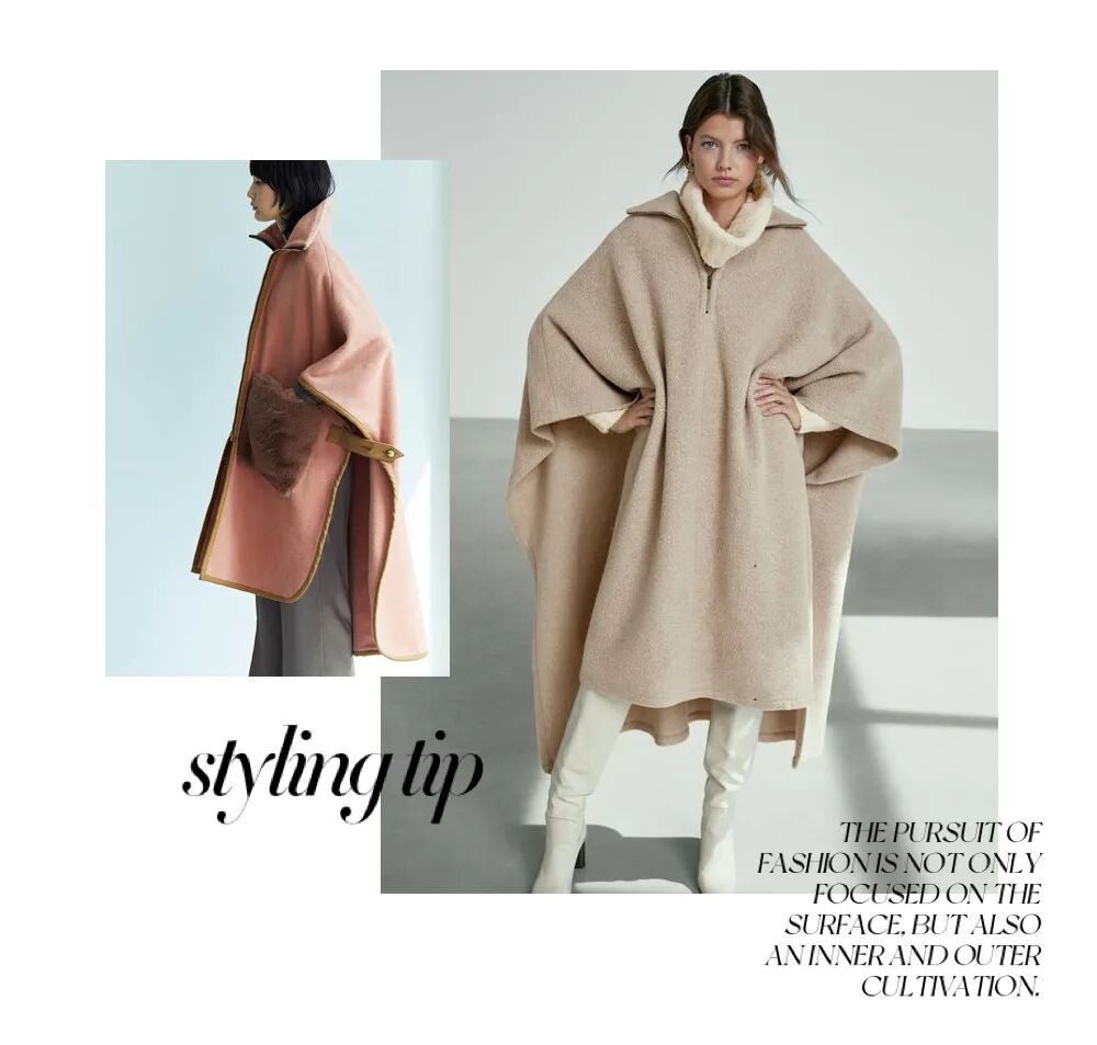 若论起保暖指数,一件走路带风轻飘飘的斗篷肯定比不上厚实的棉服羽绒外套,但时尚指数却差了十万八千里。