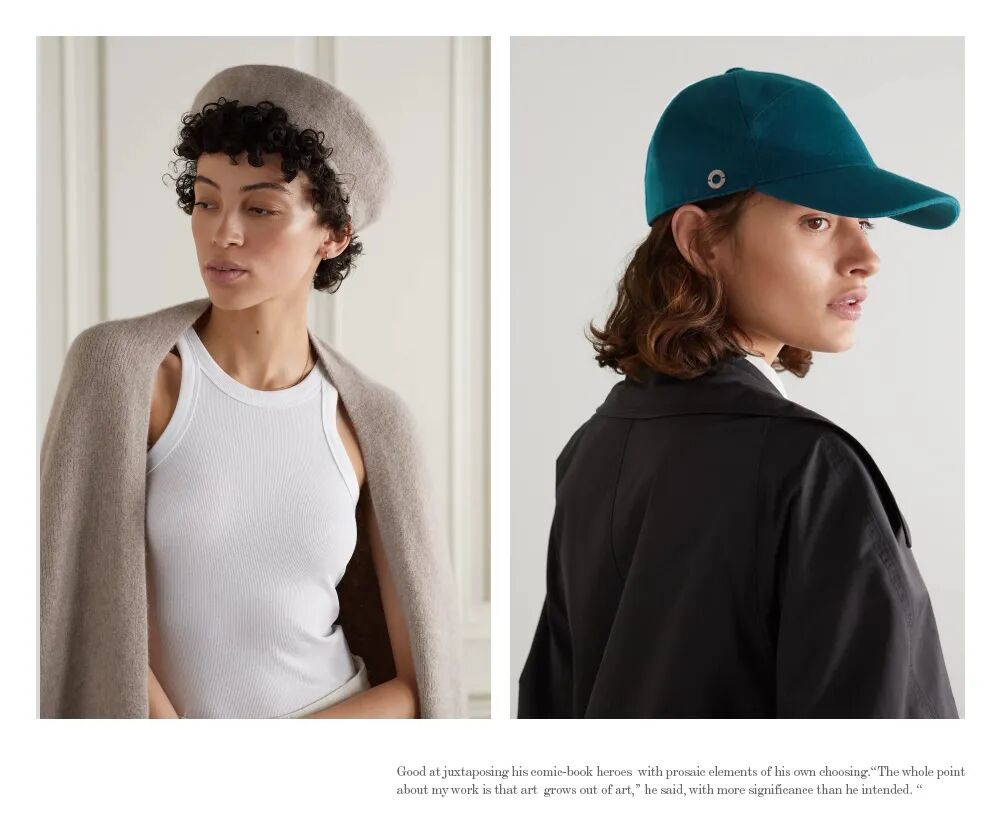 运动风的棒球帽也可以拥有羊绒质感,Loro Piana这顶帽子由蓝绿色羊绒制成,十分轻盈,不同于羊羔绒棒球帽那般厚重。外形硬朗、羊毛内衬柔软温暖,是冬日远足、运动时的不错选择。Lauren Manoogian这顶羊绒贝雷帽同样具有轻盈感,即便是常见的浅棕色,也因其柔软质地和轻便俏皮的帽型,让你能够在沉寂冬日里彰显时髦型格。