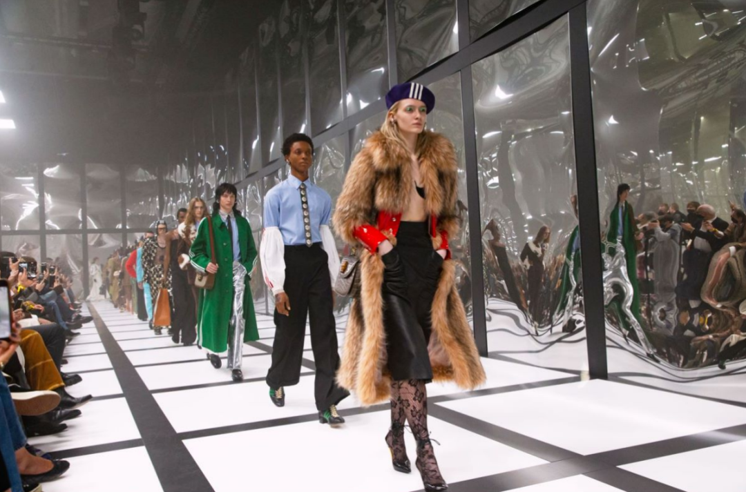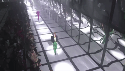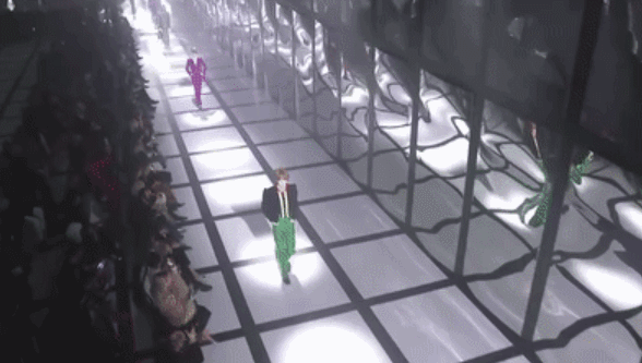 Alessandro Michele在本季秀场布置满了表面扭曲的镜子,在现场迷离的光线下显得尤为魔幻。
