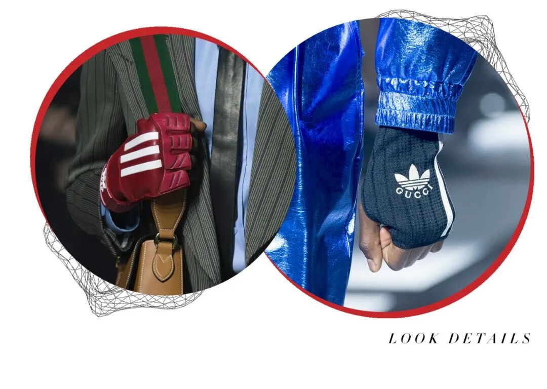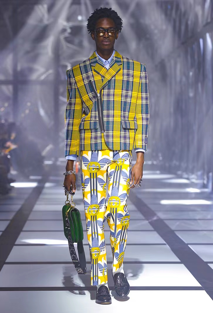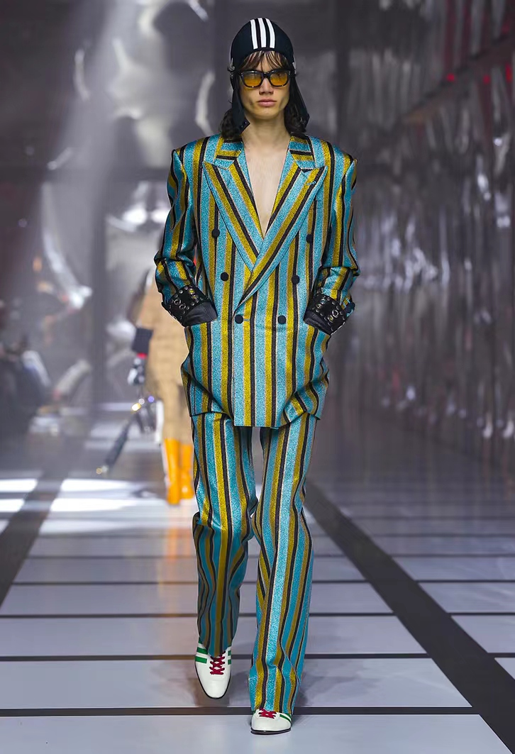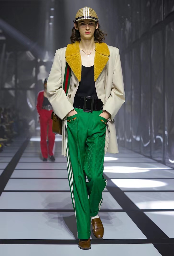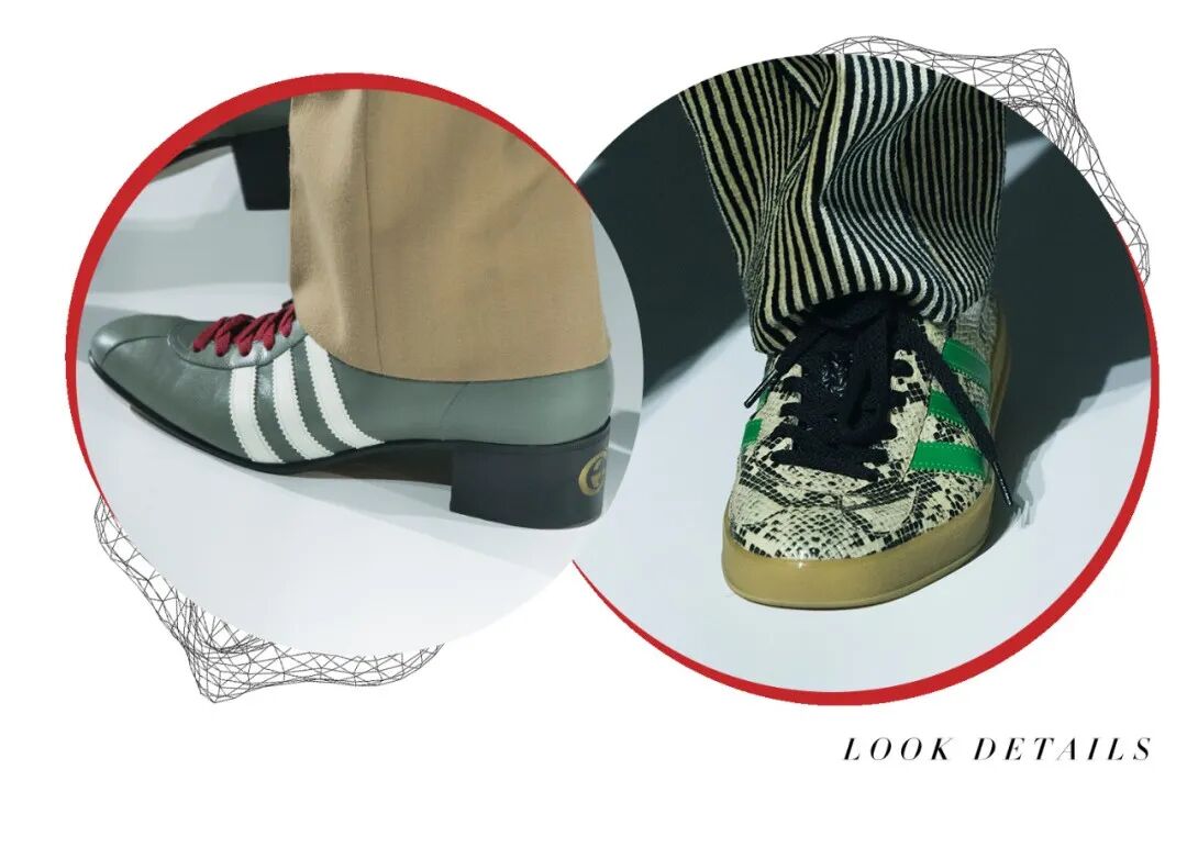 鞋履方面,将运动品牌的经典三道杠元素与Gucci结合起来,Alessandro Michele在这一季探索潮流与时装文化边界的创造力依然在线。