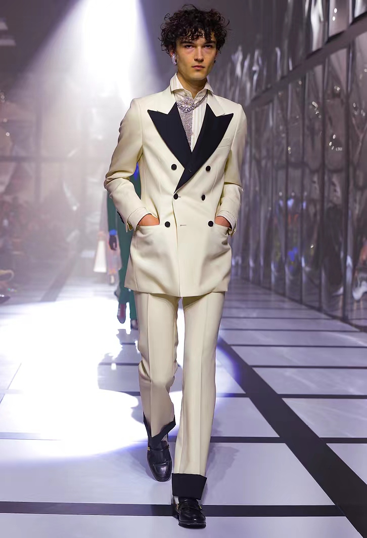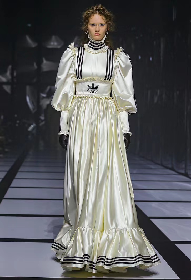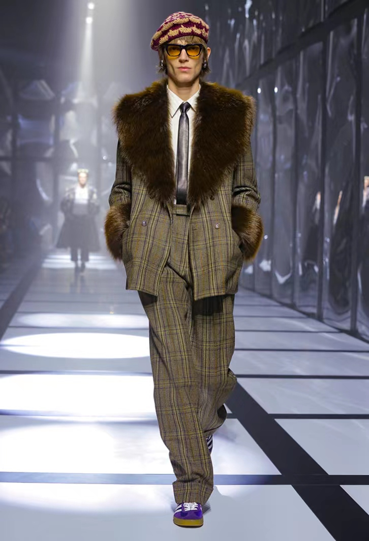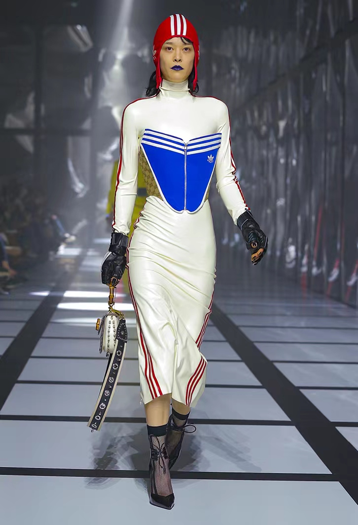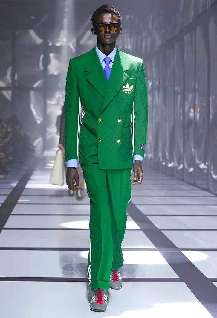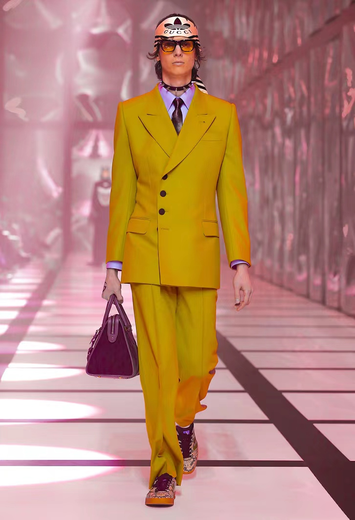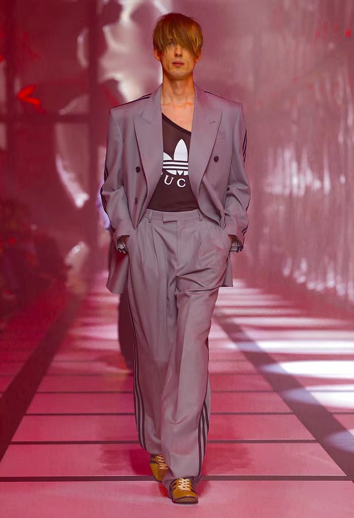 性别的模糊依旧是本季讨论的中心,男女装的概念被无限弱化。同时,传统时装的剪裁方式与轻松的运动单品剪裁相结合,对剪裁的强调让整个系列的日常实穿性更强。早在Alessandro Michele 于2015年执掌Gucci的首秀中,就表示不会再拘泥于当下的坚持,而是去探索“不再重复”与“尚未发生”之间的模糊地带,本季也是如此。开场模特身着海军双排扣西服套装,肩部的坚挺廓形和腰部的纤细剪裁重现品牌经典轮廓。接下来轮番上场的西装单品材质更加丰富,水晶装饰的天鹅绒、灯芯绒、亮片、格纹……都让单调的男士西服更具设计感。或许,男士西服应该换个叫法了?在“Fashion,is for everyone”的时代,性别早已不是决定你穿什么的首要因素,女士可以享受被包裹在硬朗的外套中,男士亦可以拥有精致柔和的腰线。联名盛行的今天,跨界已经成为了品牌打破自我风格,寻求突破的一个入口。本季秀场中,AdidasOriginals的经典三叶草跟Gucci的Logo一起出现,有趣的是,两者的标志性元素有共通之处,同样都是条纹,所以在融合时相处得格外融洽。两者的合作不仅仅体现在经典元素的交融,还有经过重新剪裁的巴洛克风格连衣裙和紧身塑身衣,趣味和设计性兼具,像是疫情时期在Instagram中流行的DIY改造升级版。时装能够在一个扩展和变形的维度上反映我们的形象,就像一个多镜面剧场,衣服提供了多元创造的可能。穿着它们跨过一个转变的界限,在那里我们成为另一种存在,意味着我们能够以另一种方式加强与阐明自我认知表达。