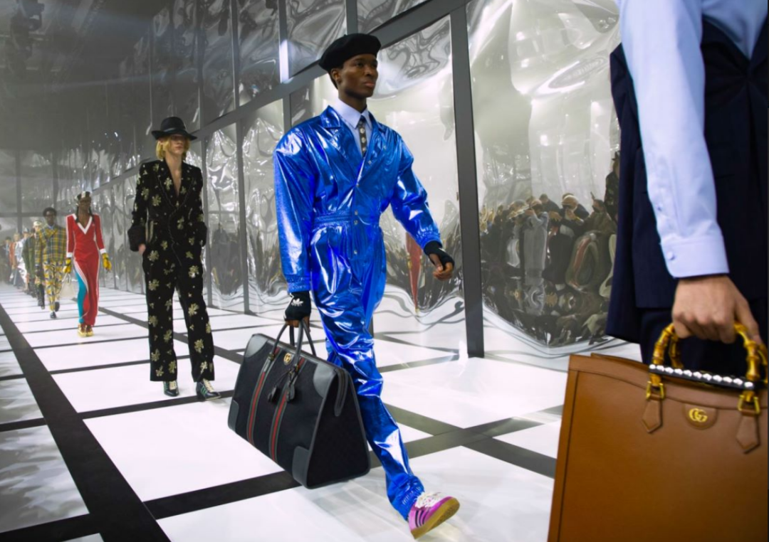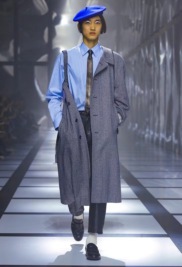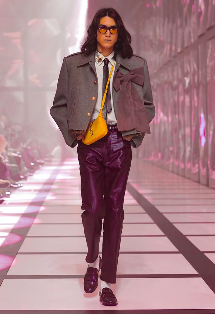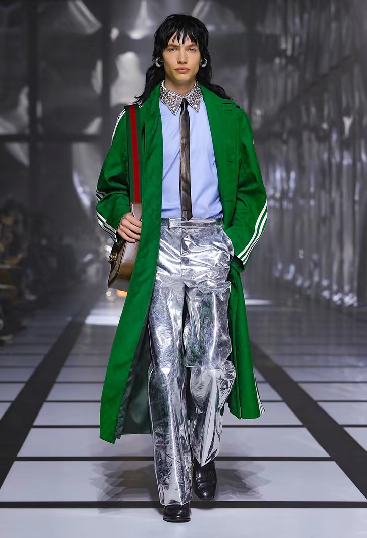 本季,Gucci 加入了大量运动元素,打破了固有的穿衣和性别概念,织物的拼接、剪裁,最终在镜面大厅中呈现出绝妙的姿态,现实与镜像重叠出多个空间。
