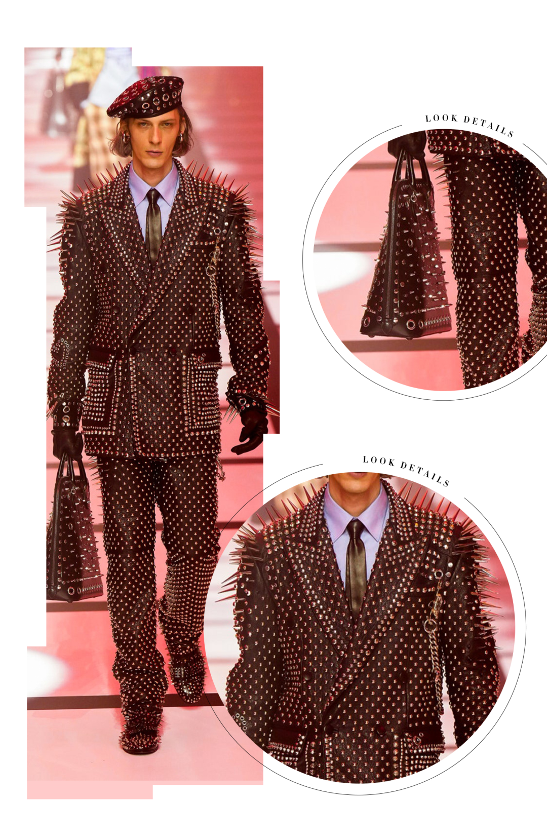 因此,这一次我们能看到不少拼接的出现。比如不同的材质之间,将硬挺的套装面料与柔软的皮草融合在一起,共生出复古、华丽的风情,同时也引导观者们重新审视时装中整体与细节的关系。另外还有元素之间的碰撞,大轮廓的超现实元素与严肃正经的正装放在一起,时髦的前瞻性可见一斑。本季包袋在皮质上加入了锋利的金属铆钉,与成衣中的元素呼应,“大杀四方”的气场扑面而来。
