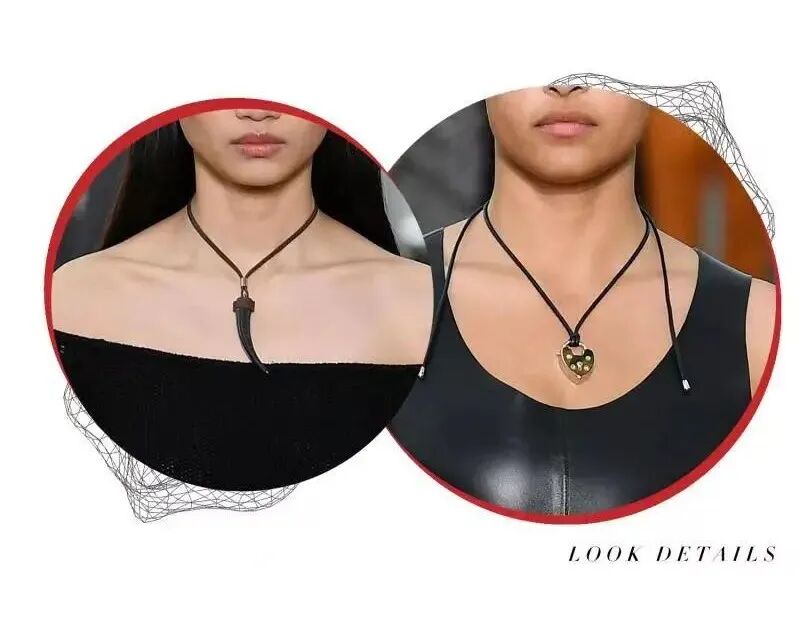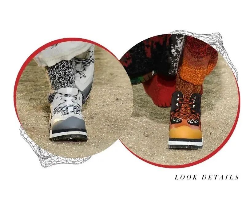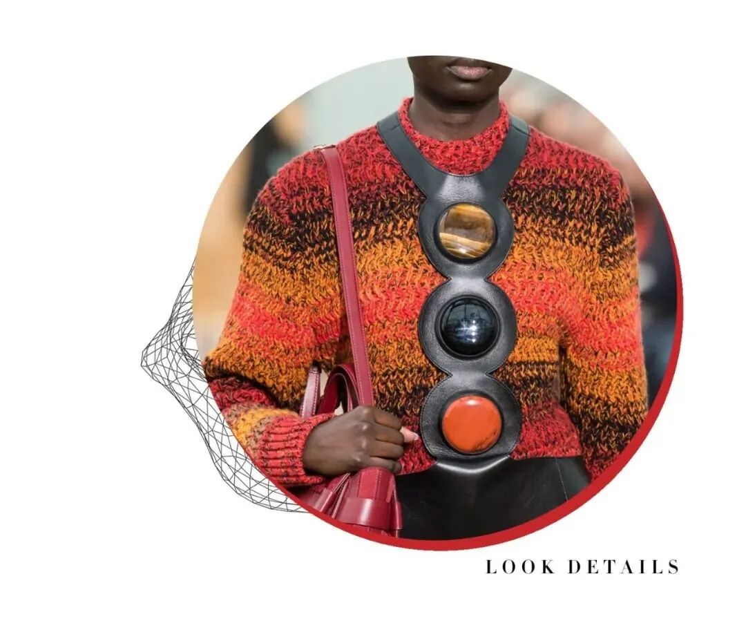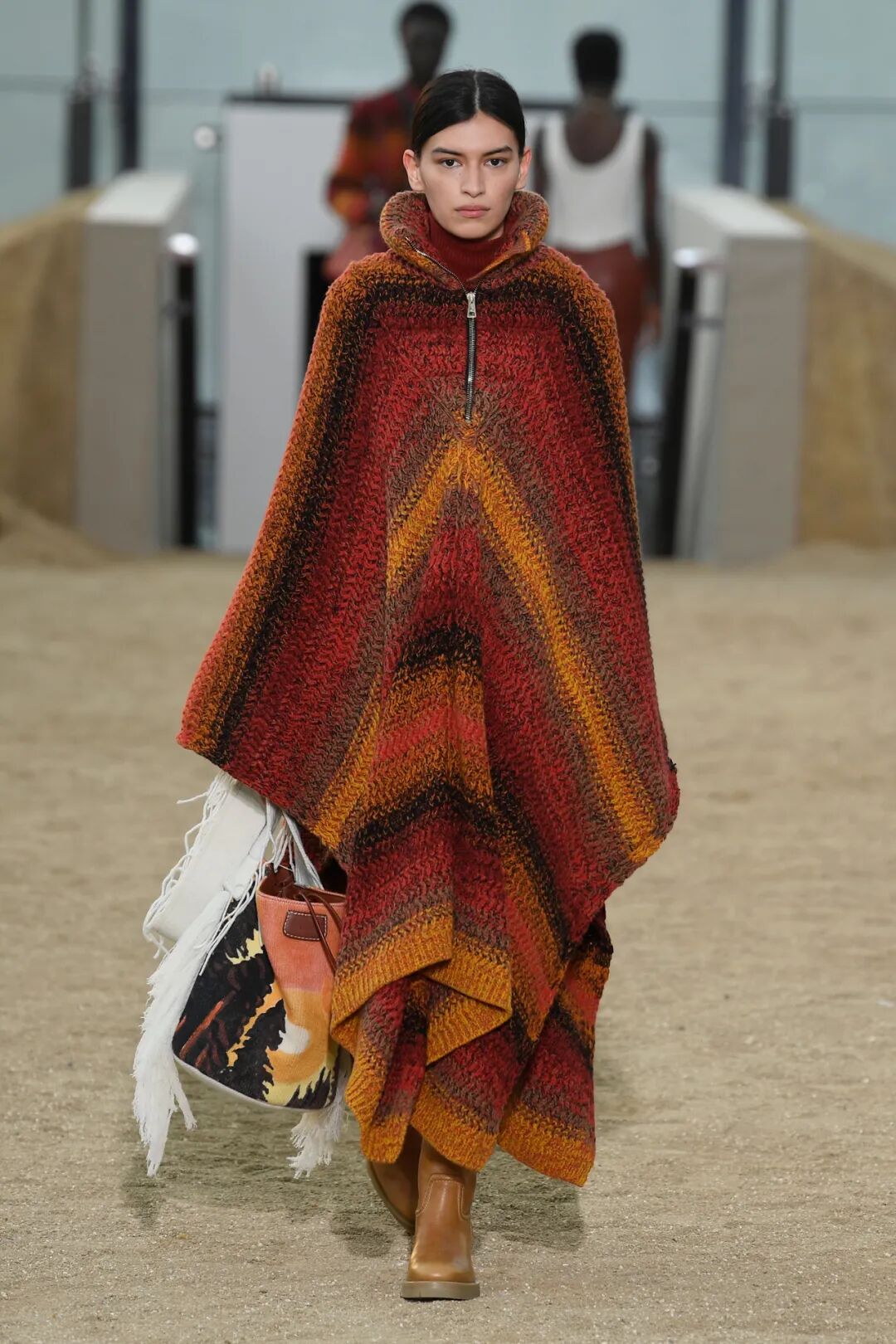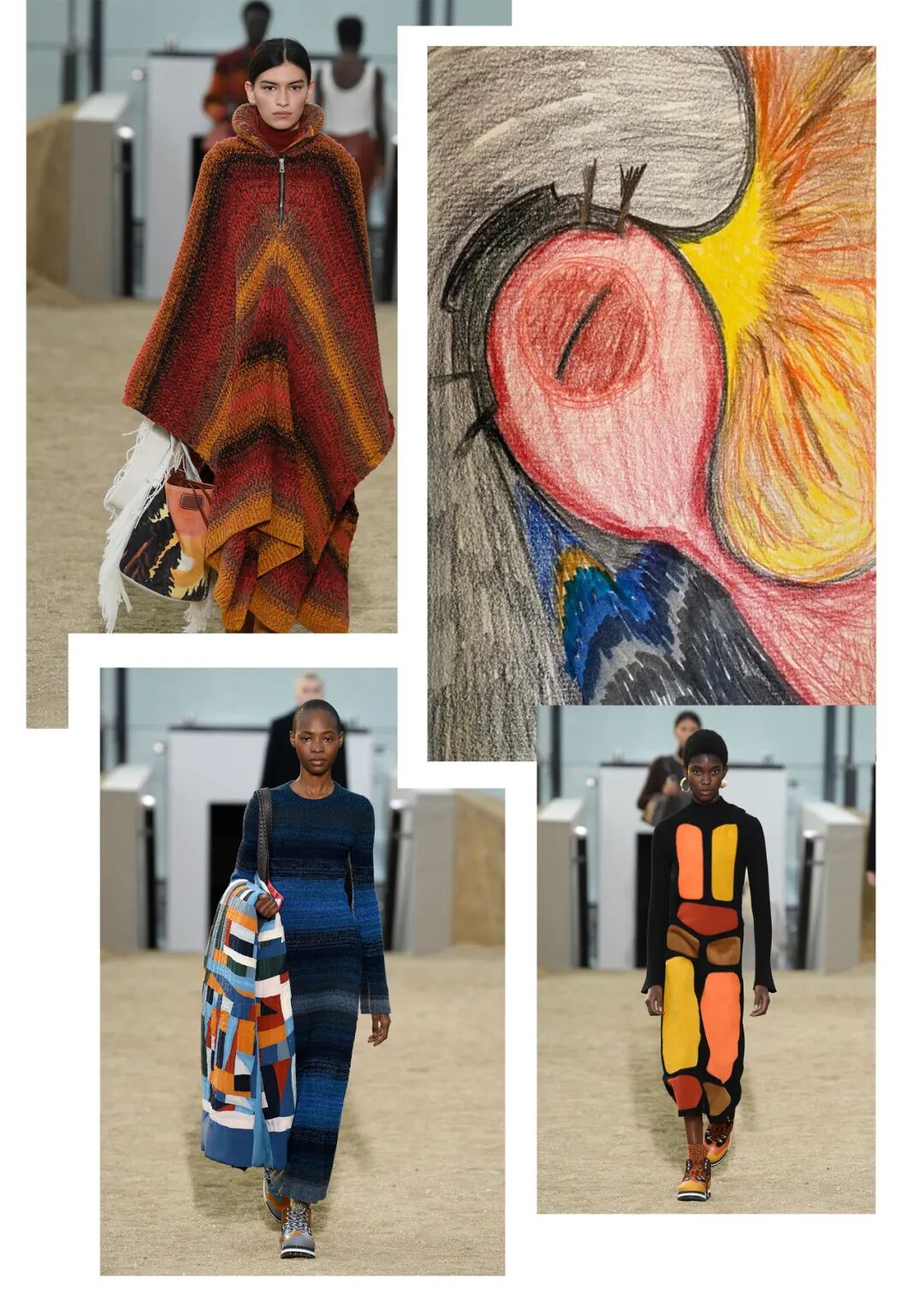 流行许久的灯笼袖在系列中呈现各种大小不一的廓形设计,舒适且大方,如果要在本季选出简约而又兼具贵气优雅的单品,那它无疑是其中之一。材质上的拼接还可以碰撞出更多不一样的气质,皮革与针织裁片结合以及加入仿照撑骨结构的精致缝线,勾勒出简约又休闲的腰线轮廓。秋冬季也并不只有厚重,系列中由皮革到柔美材质裙装的过渡有着鲜明的对比,其中呈现的连衣裙和套装以羊毛精制,精细的质地给人以乔其纱一样轻盈的视觉体验,呈现出介乎稳重与飘逸间的奇妙气质。秋冬日里最令人舒适自在的单品清单里一定有斗篷,保暖且富有现代感的puffcho斗篷与针织渐变的蓝色或红色结合出充满张力、随性的风格。面料上也有新的尝试,品牌本季的外套和背心在选材视觉上令人耳目一新,乍看之下如羊毛皮,实则是纹理丰富的羊绒。在系列的尾声,Hearst把高光留给了更具象的气候图景,将气候灾难时的景观(森林火灾、冰川融化、干旱)与气候成功之景形成鲜明对比,这些图像通过印花和再生羊绒针织嵌花的方式点缀于时装上。本季在面料选材及手法上都从始至终贯彻着环保的理念,Amber Valletta演绎的闭秀look中这件绗缝造型大衣采用了品牌过往的面料碎片拼接而成,巧妙地尽力让每一块面料都不被浪费。Gabriela Hearst最擅长的事就是“爆款手袋”,众多名人都是它的拥趸,2022秋冬系列中,同样也有潜力手袋的身影:Edith手袋以更为流畅的线条美学呈现,皮革手袋融入皮革锁缝细节,还有描绘着美好气候笔触的涂鸦包包。一系列大地色调的鞋履富有暖意,环保鞋底的登山靴、混合风格木底袜靴,以及首次亮相于2022春季系列的Nama运动鞋,它们几乎适用于每个女孩的生活场景。尖头短靴相对更具时髦气场,与针织或皮革材质都能产生奇妙的化学反应,是秋冬季节中提神的百搭单品。造型中还有许多颇具自然风格的配饰出现,多数首饰、配饰甚至时装本身也都饰有如紫水晶、拉长石、红碧玉和玫瑰石等天然宝石,自带天然的神秘感与高贵。创意总监Gabriela Hearst在Chloé 2022秋冬系列中的一系列实践印证了品牌应对气候的坚定决心,更与Chloé的美学构思遥相呼应,美好的自然氛围在此焕发生机。