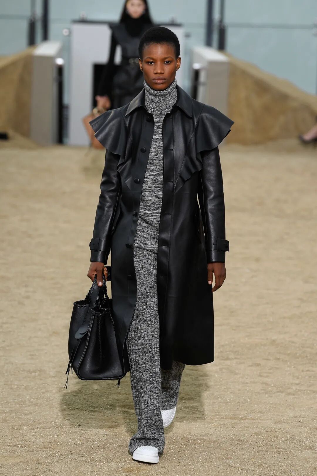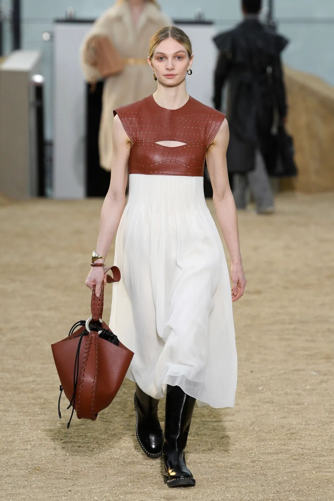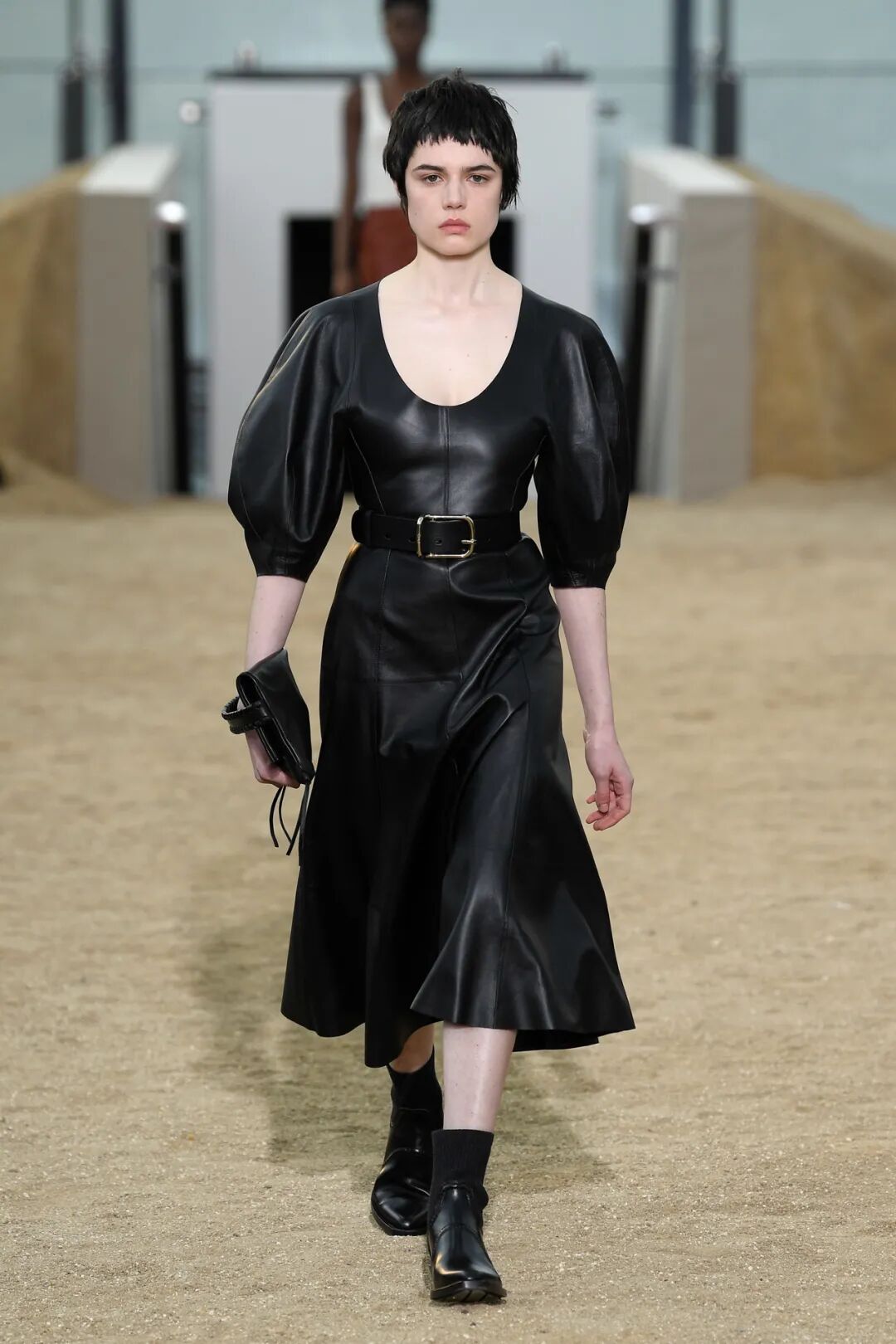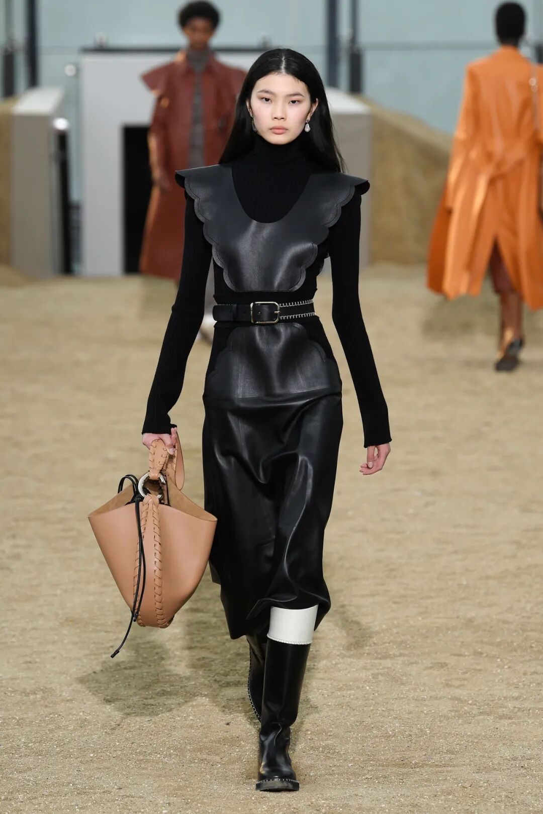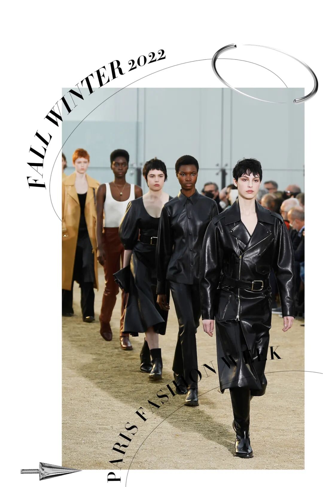 许多语境里的“回归”都是美好的,关于自然也不例外。当植被重新覆盖大地、海洋和天空回归原有的色彩,让自然以自有方式塑造陆地和海洋……赋予自然尽可能多的自由,美好广阔的世界就能在此呈现。Chloé 于3月3日发布的2022秋冬系列就描绘了这样一幅图景,品牌创意总监Gabriela Hearst认为,尽管人们对气候危机的概念都十分了解,但在这一问题上仍然需要更多人携力共进,同时视觉宣传也必不可少。将自然归还自然,品牌着眼于这种叫作“Rewilding野化”的气候解决方案,并在新系列中呈现:Hearst用回收的羊绒针织毛衣和裙子做了这件事,时装的正面是融化的冰川、干旱和燃烧的景观,背面是绿色山脉、森林和北极熊。她相信,只要人类能够想象,我们就能实现。系列以黑色、暖橘、暗红、深蓝等质感沉稳高级的色彩为主,它们源于Hearst绘制的一幅画作,融于优雅的法兰西格调,和秋冬日的氛围相辅相成。本季的美学设计还借鉴了意大利导演Franco Zeffirelli执导的电影《太阳神父月亮修女》(1973),其中记录了生态学家的守护神——阿西西的圣弗朗西斯的生平事迹。整部电影画面达到了胶片写实摄影的巅峰,关于田园的画面如诗般美好,我们也可以在此隐约看见系列中简约的风格以及色彩基调。发布现场铺满了沙砾,在还原“大地”质朴自然的气氛中,Chloé女孩们在这里展示着新系列去除修饰、真实踏地的美。剪裁利落的皮革造型、率性大方的质感大衣、软糯温暖的羊绒与针织、时髦的西服套装……本季实穿大方的造型不但突显出女性线条美,还运用巧思对其进行美化,率性且兼备优雅气质。作为IT bag制造机的Gabriela Hearst在这一季中还呈现了许多精美包袋。不管你是偏爱浪漫的少女,还是干练的都市女性,大概都会无一例外地挑花眼~硬朗的皮革元素是本系列前半部分的常客,当它们和本该优雅的收腰衬衣、泡泡袖连衣裙结合后就带着点玩味的俏皮酷感,是质感上乘的All Black造型巧思。与许多环保理念设计师不同的是,在皮革的使用方面,GabrielaHearst并没有采用“纯素皮革”或其任何替代品,而是真正的光滑皮革。Hearst认为皮革是肉类工业的副产品,她选取的皮革鞣制工艺符合欧洲环境标准,相比人造皮革更加绿色环保。皮革也不一定指代着冷酷,加入暖色系更能焕发不一样的活力,多种层次的橘和黄与细腻皮革材质的结合下更加契合秋冬氛围。肩部荷叶边是皮革面料单品的一抹甜,与软糯的针织面料搭配更显柔美气质,甜美和率性可以兼得,也为更多轻熟少女提供穿衣思路。