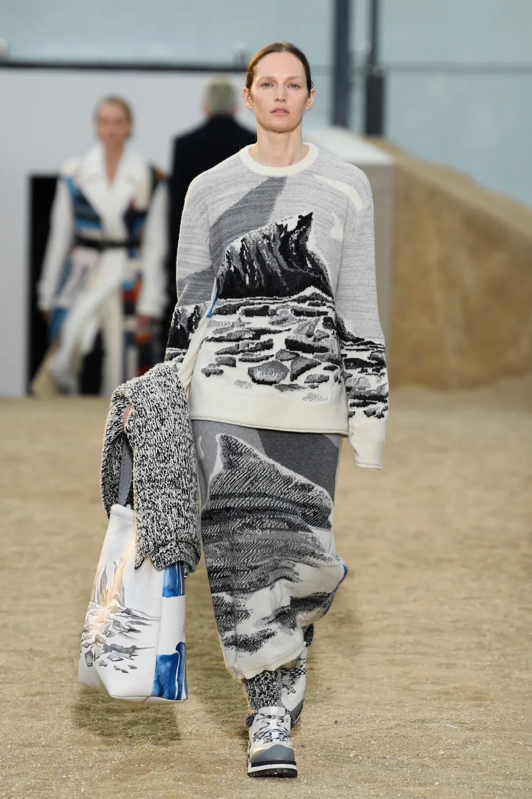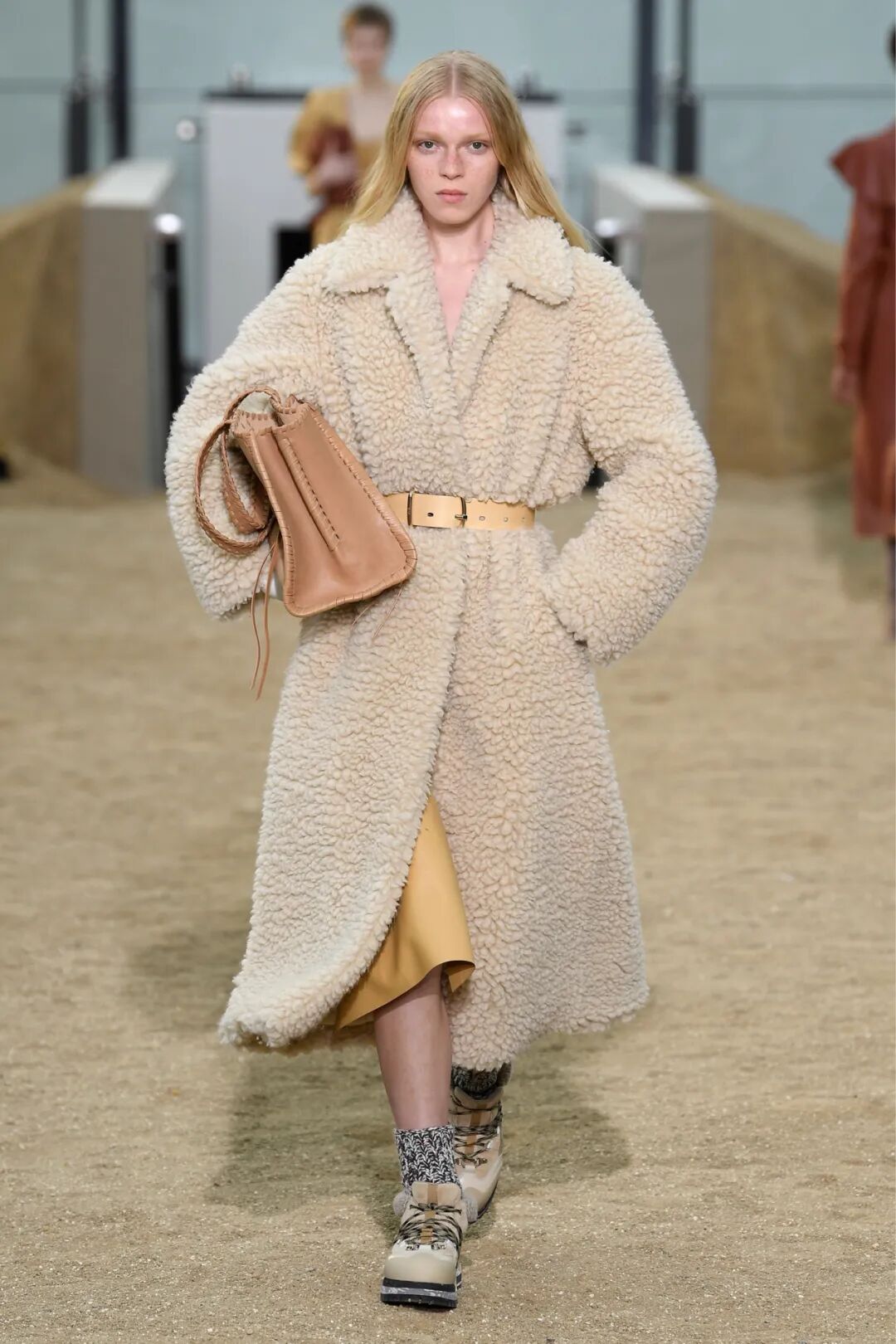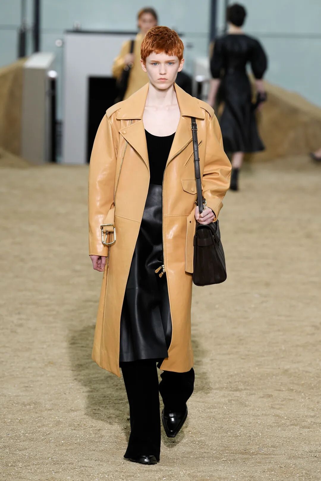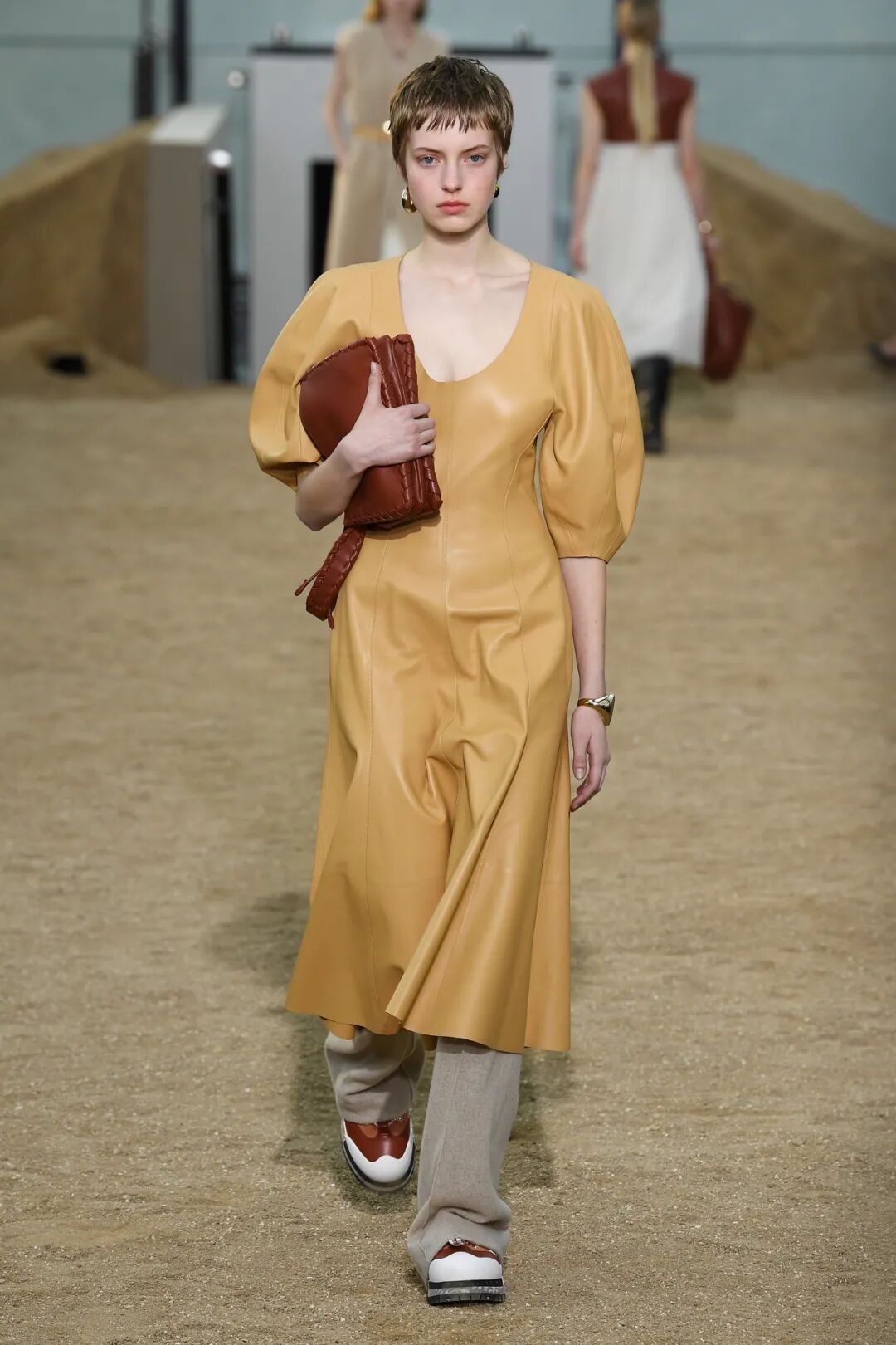 许多语境里的“回归”都是美好的,关于自然也不例外。当植被重新覆盖大地、海洋和天空回归原有的色彩,让自然以自有方式塑造陆地和海洋……赋予自然尽可能多的自由,美好广阔的世界就能在此呈现。Chloé 于3月3日发布的2022秋冬系列就描绘了这样一幅图景,品牌创意总监Gabriela Hearst认为,尽管人们对气候危机的概念都十分了解,但在这一问题上仍然需要更多人携力共进,同时视觉宣传也必不可少。将自然归还自然,品牌着眼于这种叫作“Rewilding野化”的气候解决方案,并在新系列中呈现:Hearst用回收的羊绒针织毛衣和裙子做了这件事,时装的正面是融化的冰川、干旱和燃烧的景观,背面是绿色山脉、森林和北极熊。她相信,只要人类能够想象,我们就能实现。系列以黑色、暖橘、暗红、深蓝等质感沉稳高级的色彩为主,它们源于Hearst绘制的一幅画作,融于优雅的法兰西格调,和秋冬日的氛围相辅相成。本季的美学设计还借鉴了意大利导演Franco Zeffirelli执导的电影《太阳神父月亮修女》(1973),其中记录了生态学家的守护神——阿西西的圣弗朗西斯的生平事迹。整部电影画面达到了胶片写实摄影的巅峰,关于田园的画面如诗般美好,我们也可以在此隐约看见系列中简约的风格以及色彩基调。发布现场铺满了沙砾,在还原“大地”质朴自然的气氛中,Chloé女孩们在这里展示着新系列去除修饰、真实踏地的美。剪裁利落的皮革造型、率性大方的质感大衣、软糯温暖的羊绒与针织、时髦的西服套装……本季实穿大方的造型不但突显出女性线条美,还运用巧思对其进行美化,率性且兼备优雅气质。作为IT bag制造机的Gabriela Hearst在这一季中还呈现了许多精美包袋。不管你是偏爱浪漫的少女,还是干练的都市女性,大概都会无一例外地挑花眼~硬朗的皮革元素是本系列前半部分的常客,当它们和本该优雅的收腰衬衣、泡泡袖连衣裙结合后就带着点玩味的俏皮酷感,是质感上乘的All Black造型巧思。与许多环保理念设计师不同的是,在皮革的使用方面,GabrielaHearst并没有采用“纯素皮革”或其任何替代品,而是真正的光滑皮革。Hearst认为皮革是肉类工业的副产品,她选取的皮革鞣制工艺符合欧洲环境标准,相比人造皮革更加绿色环保。皮革也不一定指代着冷酷,加入暖色系更能焕发不一样的活力,多种层次的橘和黄与细腻皮革材质的结合下更加契合秋冬氛围。肩部荷叶边是皮革面料单品的一抹甜,与软糯的针织面料搭配更显柔美气质,甜美和率性可以兼得,也为更多轻熟少女提供穿衣思路。