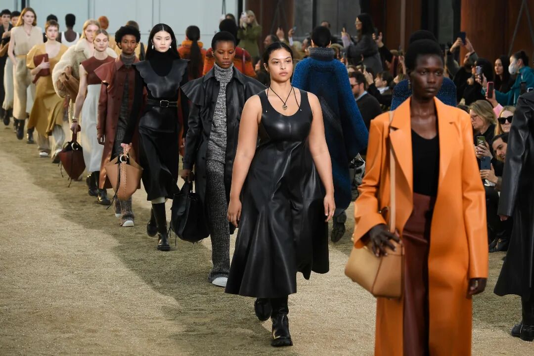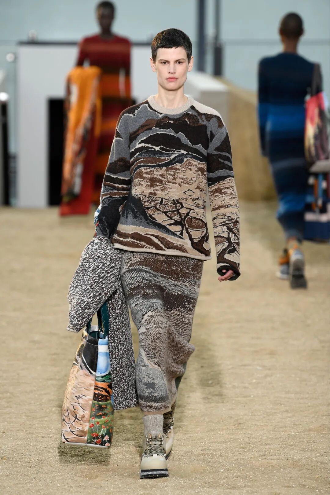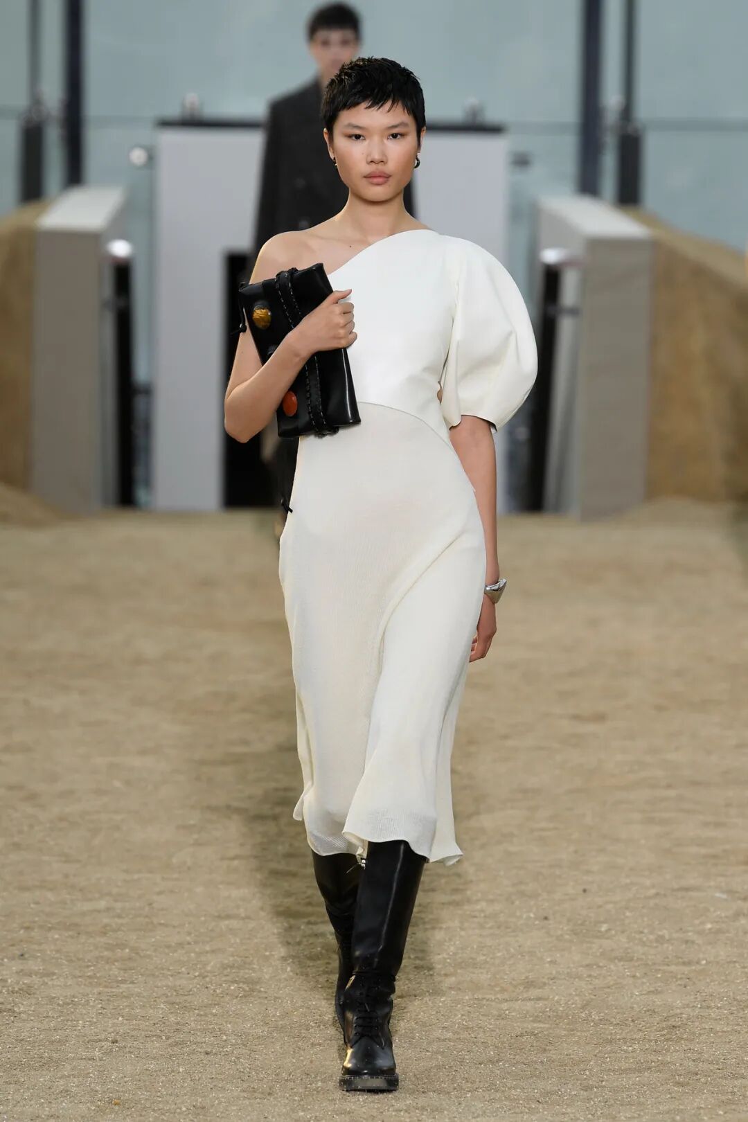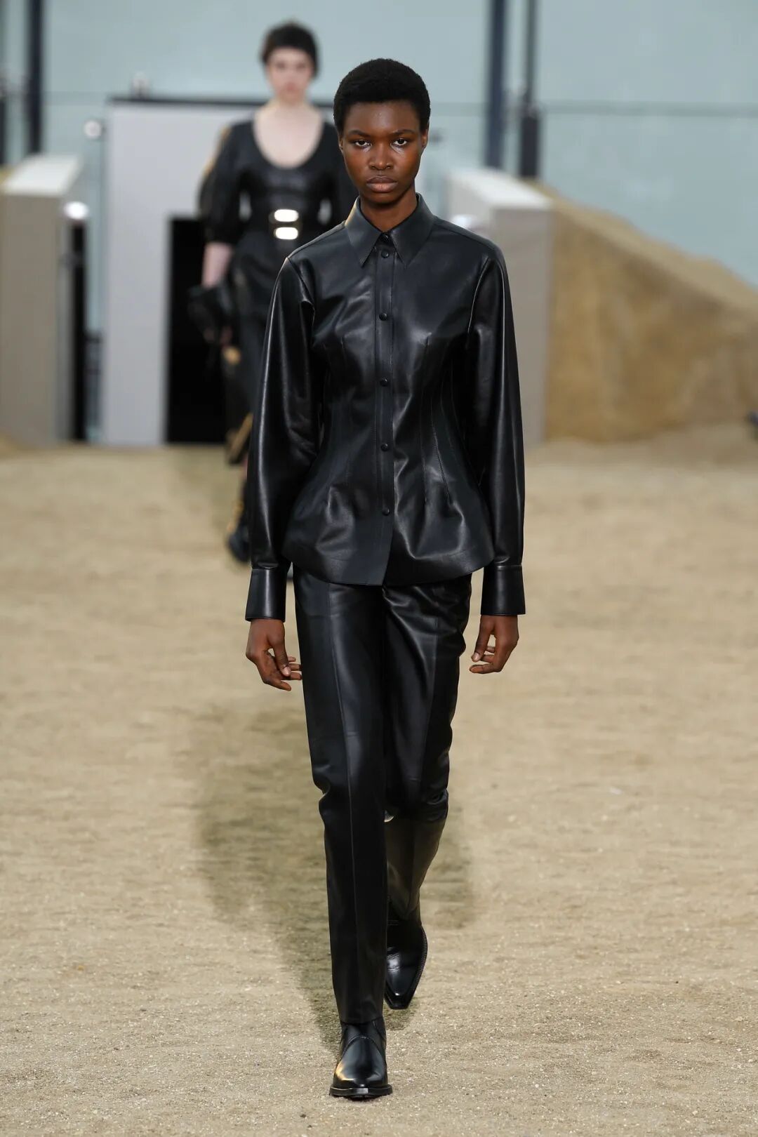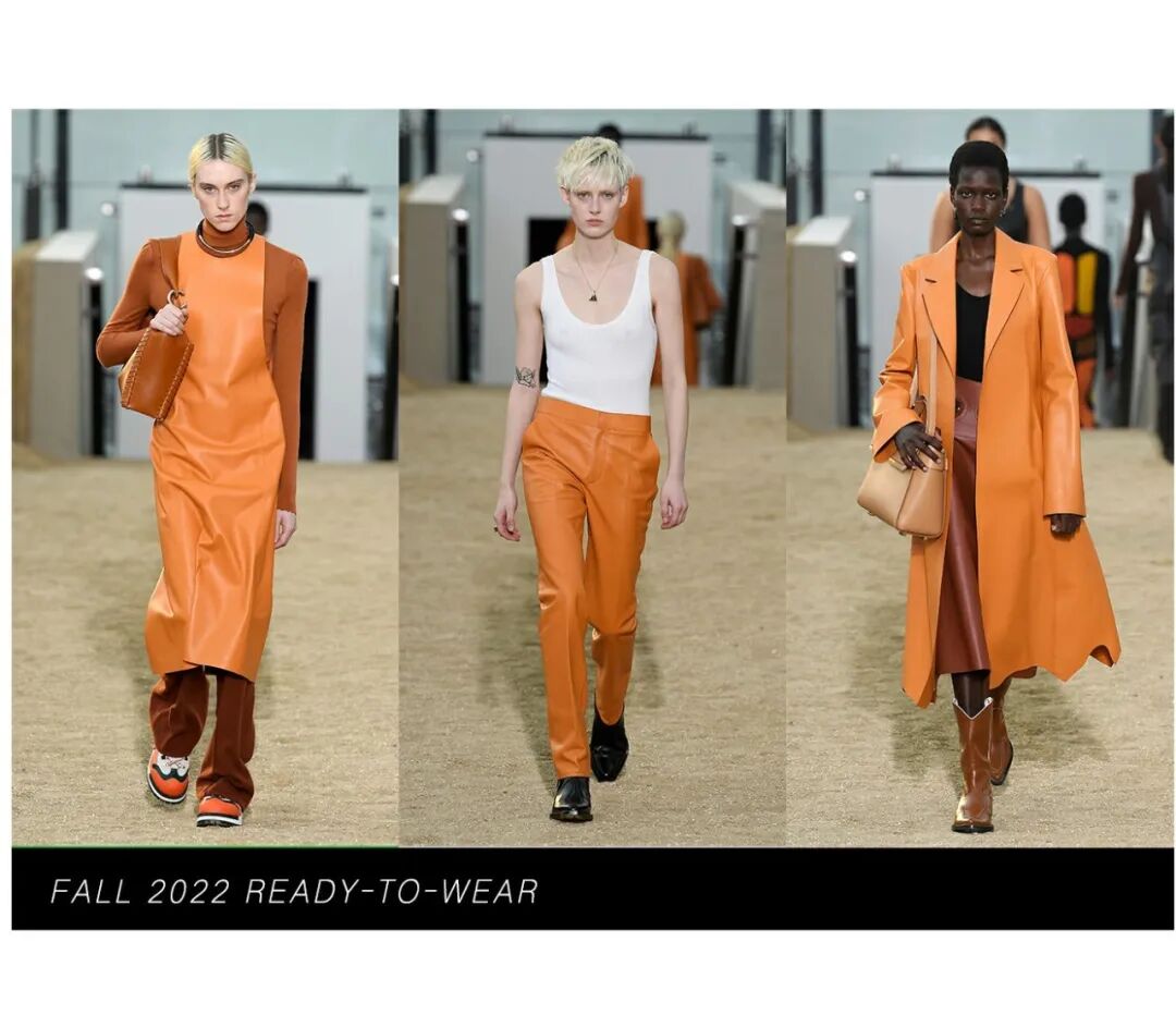 许多语境里的“回归”都是美好的,关于自然也不例外。当植被重新覆盖大地、海洋和天空回归原有的色彩,让自然以自有方式塑造陆地和海洋……赋予自然尽可能多的自由,美好广阔的世界就能在此呈现。Chloé 于3月3日发布的2022秋冬系列就描绘了这样一幅图景,品牌创意总监Gabriela Hearst认为,尽管人们对气候危机的概念都十分了解,但在这一问题上仍然需要更多人携力共进,同时视觉宣传也必不可少。将自然归还自然,品牌着眼于这种叫作“Rewilding野化”的气候解决方案,并在新系列中呈现:Hearst用回收的羊绒针织毛衣和裙子做了这件事,时装的正面是融化的冰川、干旱和燃烧的景观,背面是绿色山脉、森林和北极熊。她相信,只要人类能够想象,我们就能实现。系列以黑色、暖橘、暗红、深蓝等质感沉稳高级的色彩为主,它们源于Hearst绘制的一幅画作,融于优雅的法兰西格调,和秋冬日的氛围相辅相成。本季的美学设计还借鉴了意大利导演Franco Zeffirelli执导的电影《太阳神父月亮修女》(1973),其中记录了生态学家的守护神——阿西西的圣弗朗西斯的生平事迹。整部电影画面达到了胶片写实摄影的巅峰,关于田园的画面如诗般美好,我们也可以在此隐约看见系列中简约的风格以及色彩基调。发布现场铺满了沙砾,在还原“大地”质朴自然的气氛中,Chloé女孩们在这里展示着新系列去除修饰、真实踏地的美。剪裁利落的皮革造型、率性大方的质感大衣、软糯温暖的羊绒与针织、时髦的西服套装……本季实穿大方的造型不但突显出女性线条美,还运用巧思对其进行美化,率性且兼备优雅气质。作为IT bag制造机的Gabriela Hearst在这一季中还呈现了许多精美包袋。不管你是偏爱浪漫的少女,还是干练的都市女性,大概都会无一例外地挑花眼~硬朗的皮革元素是本系列前半部分的常客,当它们和本该优雅的收腰衬衣、泡泡袖连衣裙结合后就带着点玩味的俏皮酷感,是质感上乘的All Black造型巧思。与许多环保理念设计师不同的是,在皮革的使用方面,GabrielaHearst并没有采用“纯素皮革”或其任何替代品,而是真正的光滑皮革。Hearst认为皮革是肉类工业的副产品,她选取的皮革鞣制工艺符合欧洲环境标准,相比人造皮革更加绿色环保。皮革也不一定指代着冷酷,加入暖色系更能焕发不一样的活力,多种层次的橘和黄与细腻皮革材质的结合下更加契合秋冬氛围。肩部荷叶边是皮革面料单品的一抹甜,与软糯的针织面料搭配更显柔美气质,甜美和率性可以兼得,也为更多轻熟少女提供穿衣思路。