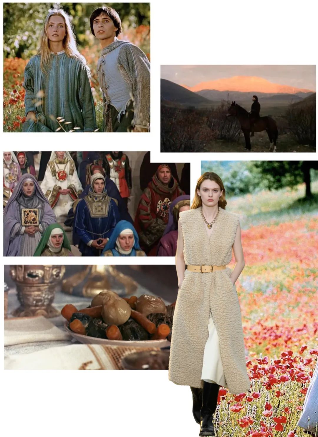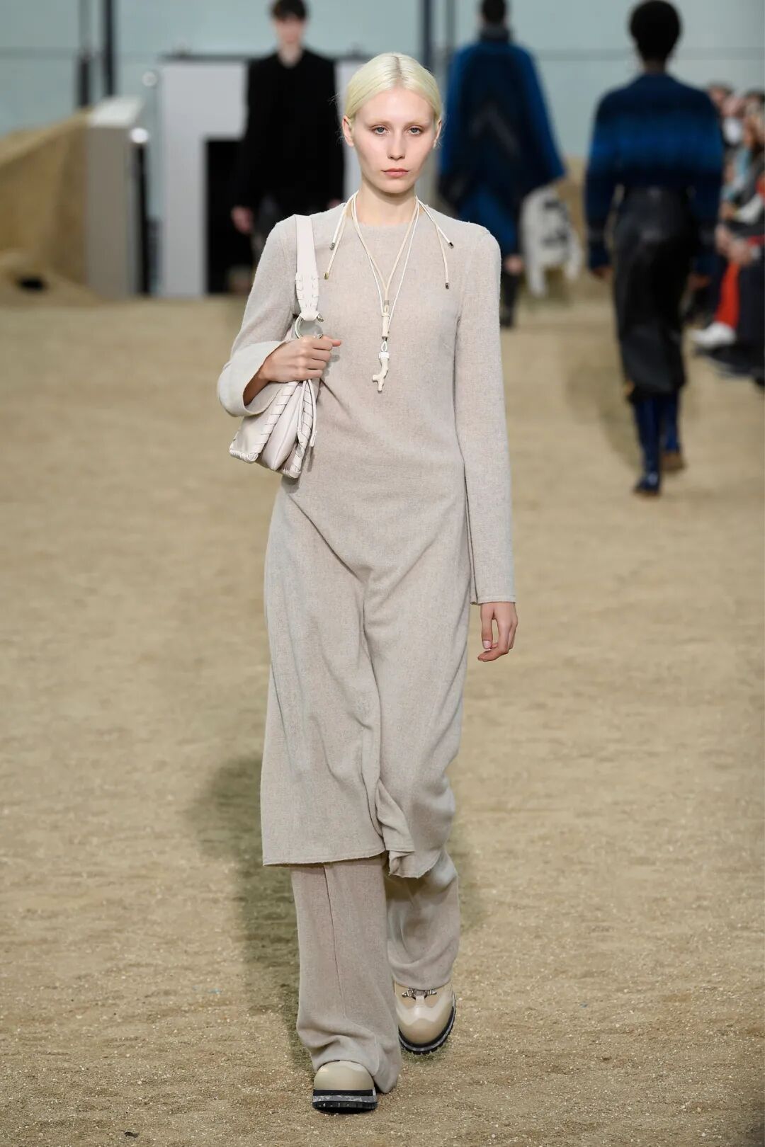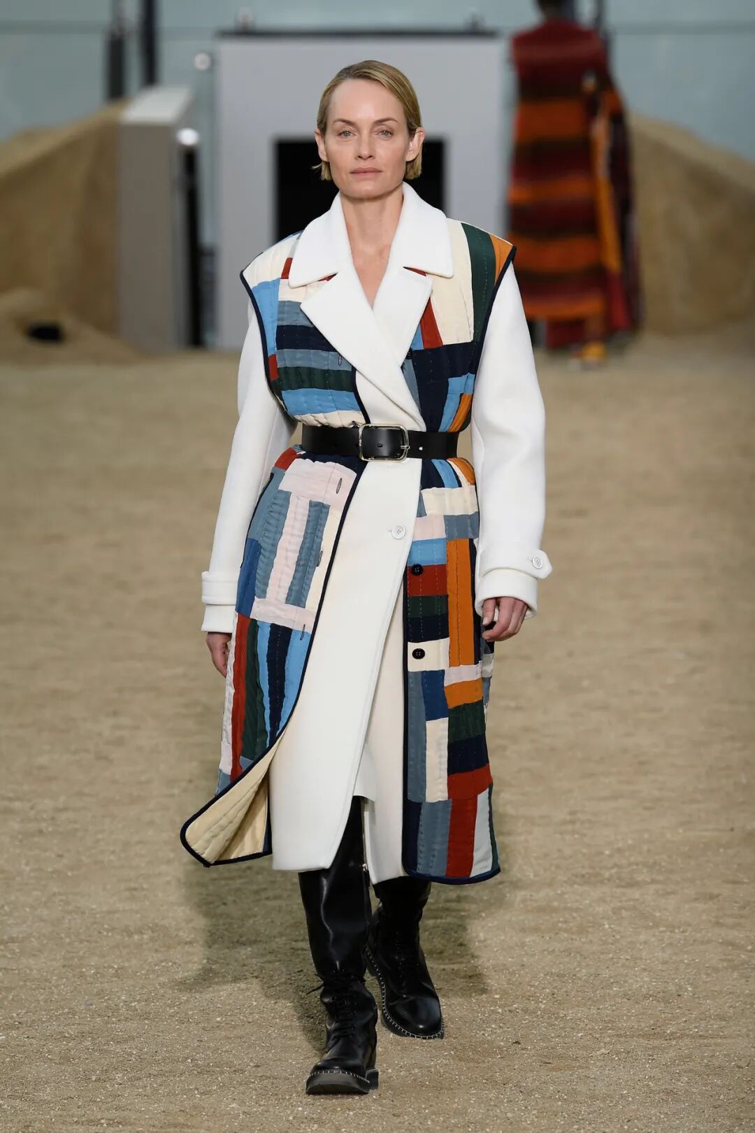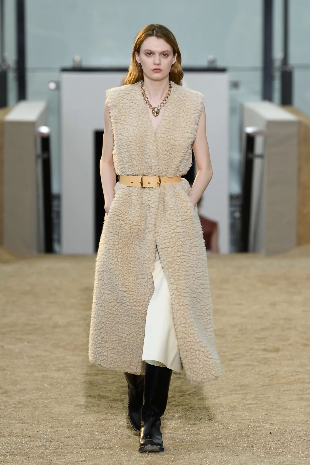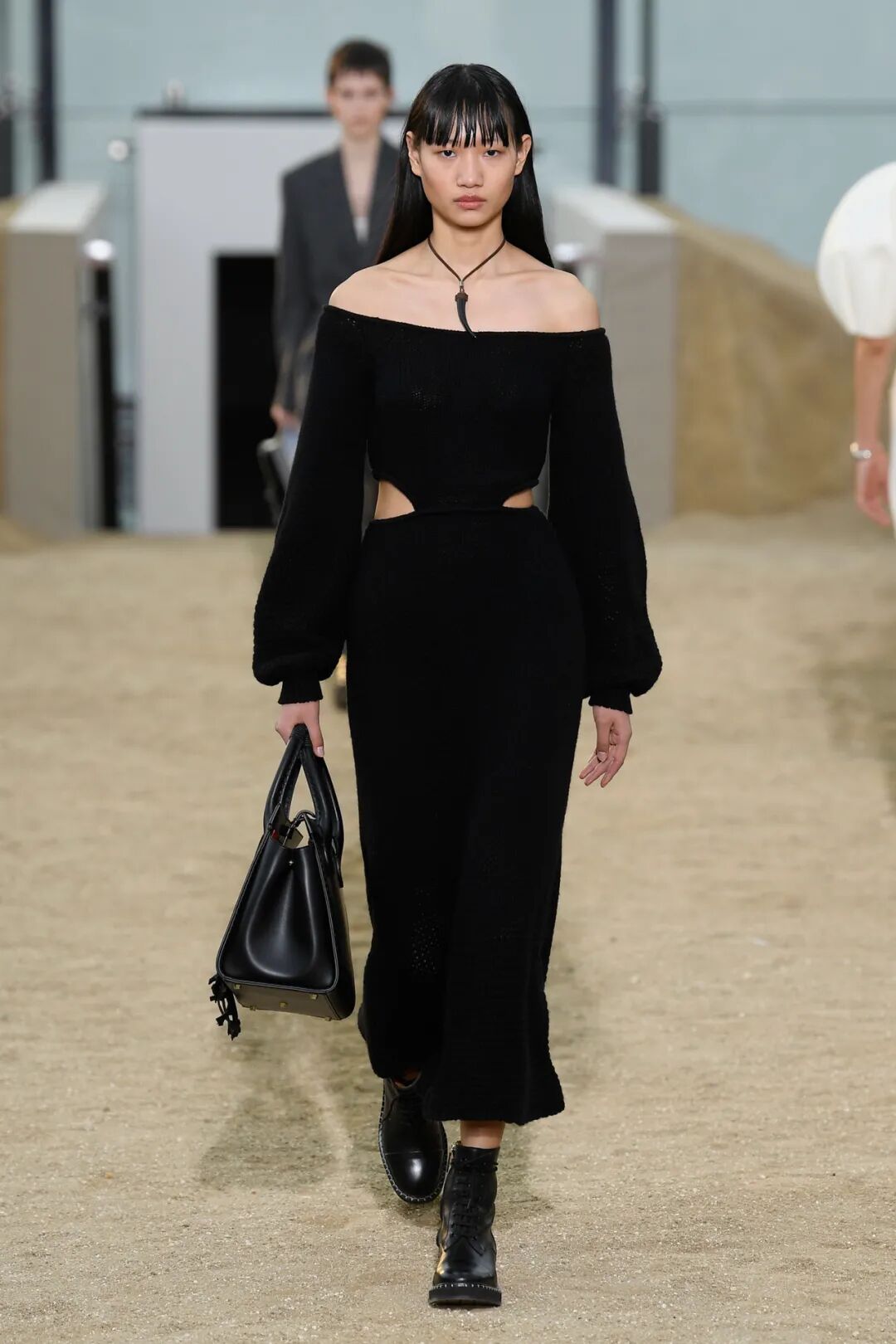 许多语境里的“回归”都是美好的,关于自然也不例外。当植被重新覆盖大地、海洋和天空回归原有的色彩,让自然以自有方式塑造陆地和海洋……赋予自然尽可能多的自由,美好广阔的世界就能在此呈现。Chloé 于3月3日发布的2022秋冬系列就描绘了这样一幅图景,品牌创意总监Gabriela Hearst认为,尽管人们对气候危机的概念都十分了解,但在这一问题上仍然需要更多人携力共进,同时视觉宣传也必不可少。将自然归还自然,品牌着眼于这种叫作“Rewilding野化”的气候解决方案,并在新系列中呈现:Hearst用回收的羊绒针织毛衣和裙子做了这件事,时装的正面是融化的冰川、干旱和燃烧的景观,背面是绿色山脉、森林和北极熊。她相信,只要人类能够想象,我们就能实现。系列以黑色、暖橘、暗红、深蓝等质感沉稳高级的色彩为主,它们源于Hearst绘制的一幅画作,融于优雅的法兰西格调,和秋冬日的氛围相辅相成。本季的美学设计还借鉴了意大利导演Franco Zeffirelli执导的电影《太阳神父月亮修女》(1973),其中记录了生态学家的守护神——阿西西的圣弗朗西斯的生平事迹。整部电影画面达到了胶片写实摄影的巅峰,关于田园的画面如诗般美好,我们也可以在此隐约看见系列中简约的风格以及色彩基调。发布现场铺满了沙砾,在还原“大地”质朴自然的气氛中,Chloé女孩们在这里展示着新系列去除修饰、真实踏地的美。剪裁利落的皮革造型、率性大方的质感大衣、软糯温暖的羊绒与针织、时髦的西服套装……本季实穿大方的造型不但突显出女性线条美,还运用巧思对其进行美化,率性且兼备优雅气质。作为IT bag制造机的Gabriela Hearst在这一季中还呈现了许多精美包袋。不管你是偏爱浪漫的少女,还是干练的都市女性,大概都会无一例外地挑花眼~硬朗的皮革元素是本系列前半部分的常客,当它们和本该优雅的收腰衬衣、泡泡袖连衣裙结合后就带着点玩味的俏皮酷感,是质感上乘的All Black造型巧思。与许多环保理念设计师不同的是,在皮革的使用方面,GabrielaHearst并没有采用“纯素皮革”或其任何替代品,而是真正的光滑皮革。Hearst认为皮革是肉类工业的副产品,她选取的皮革鞣制工艺符合欧洲环境标准,相比人造皮革更加绿色环保。皮革也不一定指代着冷酷,加入暖色系更能焕发不一样的活力,多种层次的橘和黄与细腻皮革材质的结合下更加契合秋冬氛围。肩部荷叶边是皮革面料单品的一抹甜,与软糯的针织面料搭配更显柔美气质,甜美和率性可以兼得,也为更多轻熟少女提供穿衣思路。