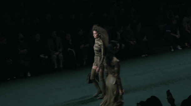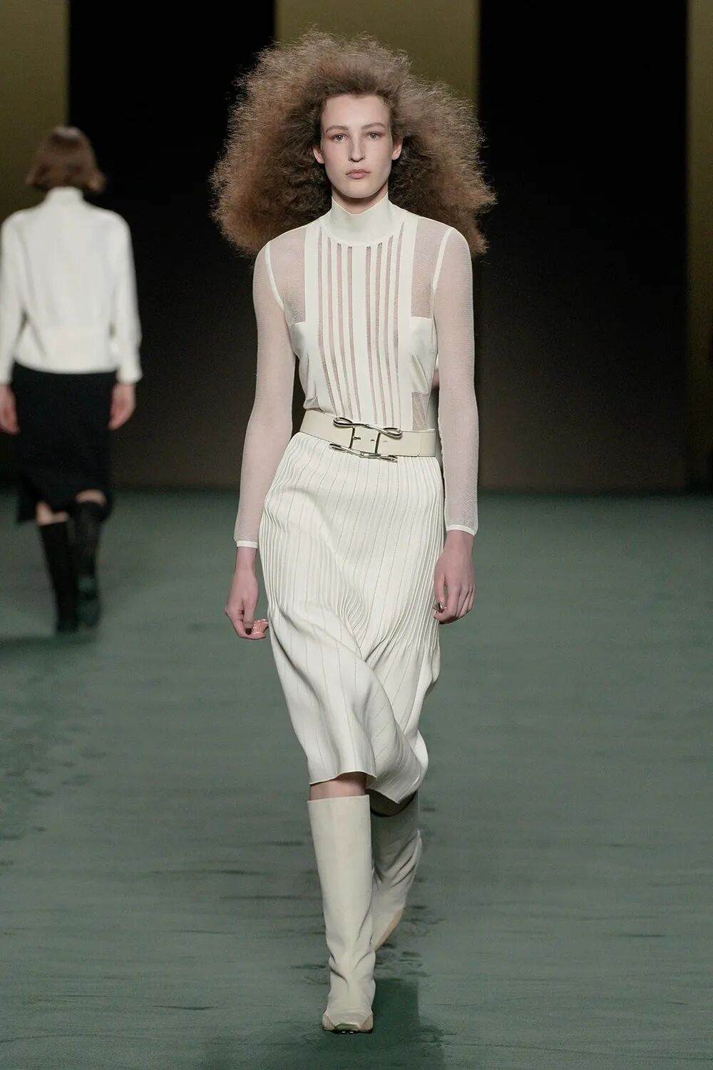 北京时间3月5日夜晚,爱马仕2022秋冬女装系列踏着轻盈的步伐缓缓而至。随着一阵隐隐作响的铃声传来,古老的技艺与未来时光逐渐重合——一种全新的马术风格由此展开。长久以来,爱马仕都与马术风格紧紧联系在一起,但在本季,不少原有的标签被撕掉,千篇一律的规则被摒弃。女性的自我蜕变和自我成就通过一系列提花大衣、皮革腰带、条纹透视衣等一一展现。爱马仕艺术总监Nadège Vanhee-Cybulski发现了女性身上恰如其分的不确定之美,自此激发灵感,继而通过精湛工艺表达其内心的力量。本季的关键词为“轻盈的心”,爱马仕女性化身龙狮、炼金师、亚马逊女战士,她目光如炬,心情愉悦,步履轻盈,强大力量呼应内心激情;她们不羁,且艺术天赋极强,与世俗期待背道而驰;她们或特立独行,或归属群体,但终将颠覆常规。这个系列中,爱马仕用流畅的线条勾勒出充满力量又内心叛逆的女性,模特们在规则的明暗光影中穿梭,营造出时光流逝感,一如大量应用在服装上的条纹,立体感强烈又轻盈有活力。各种面料的混搭和朦胧的印象派画作色彩再次撩人心弦。刻在身体里的浪漫情绪,是爱马仕女性强大的服装语言。