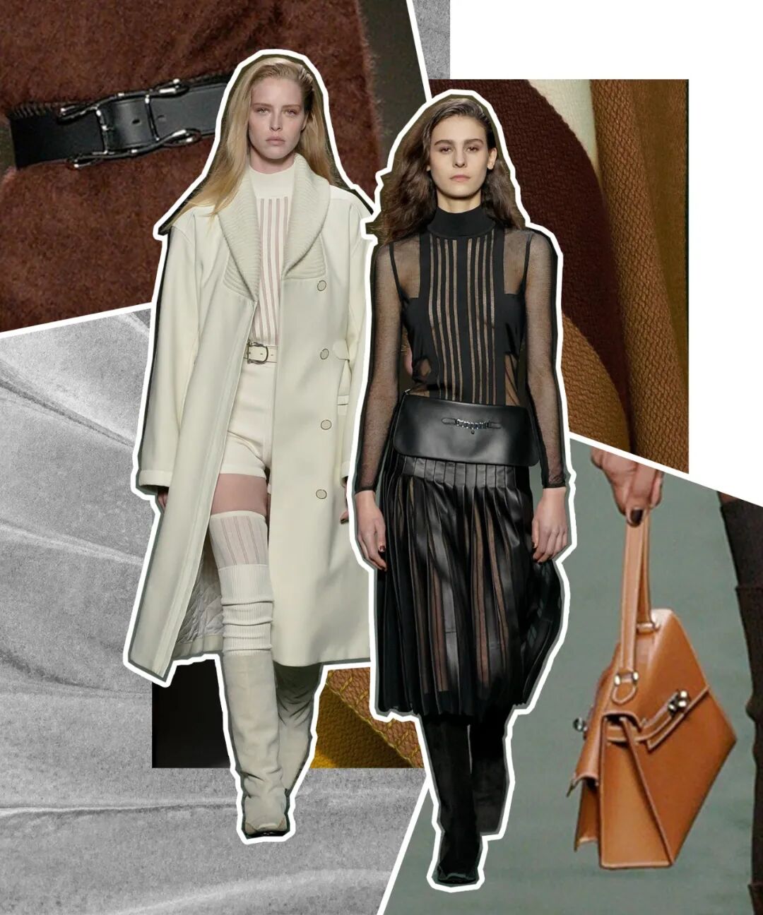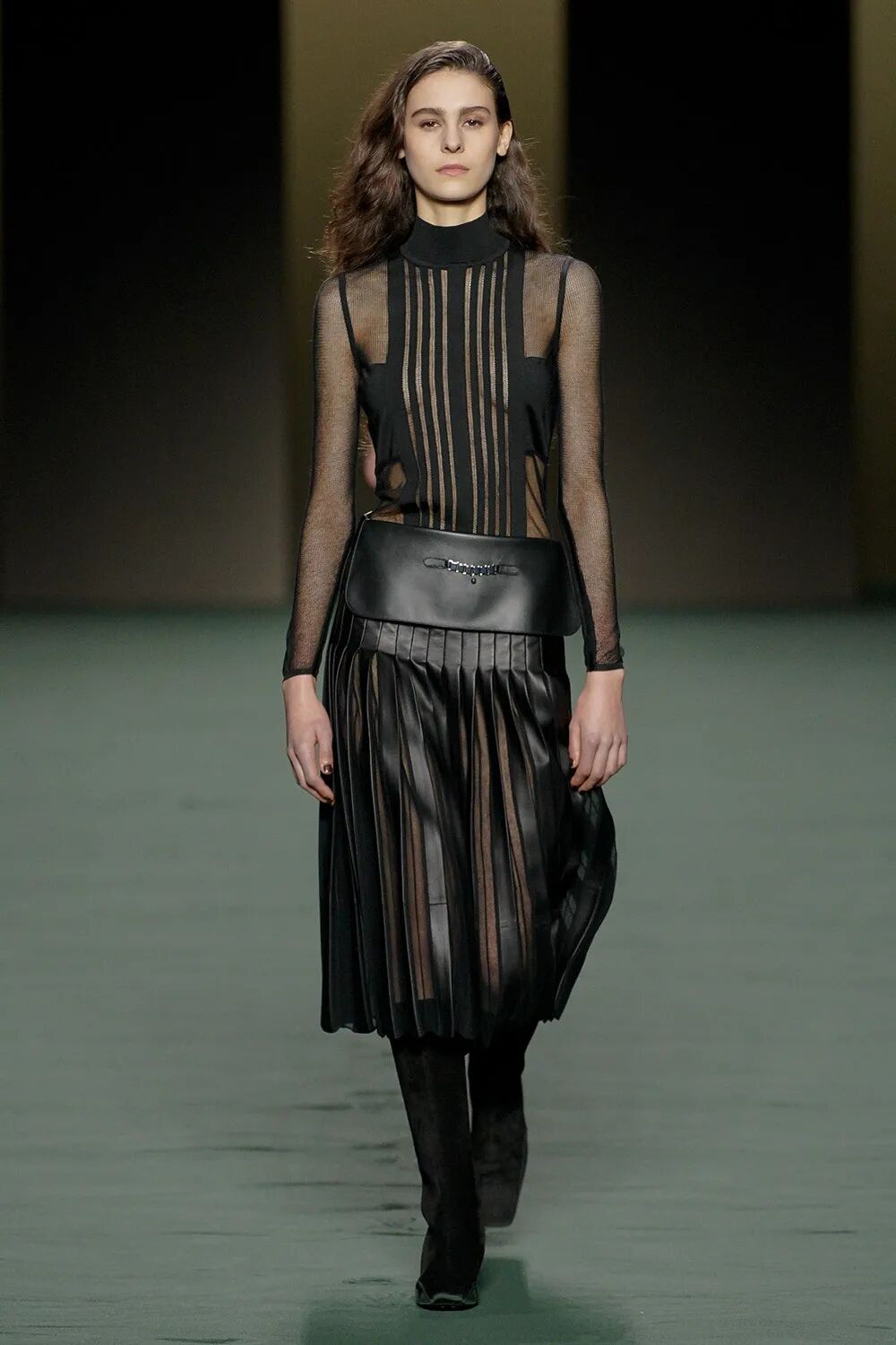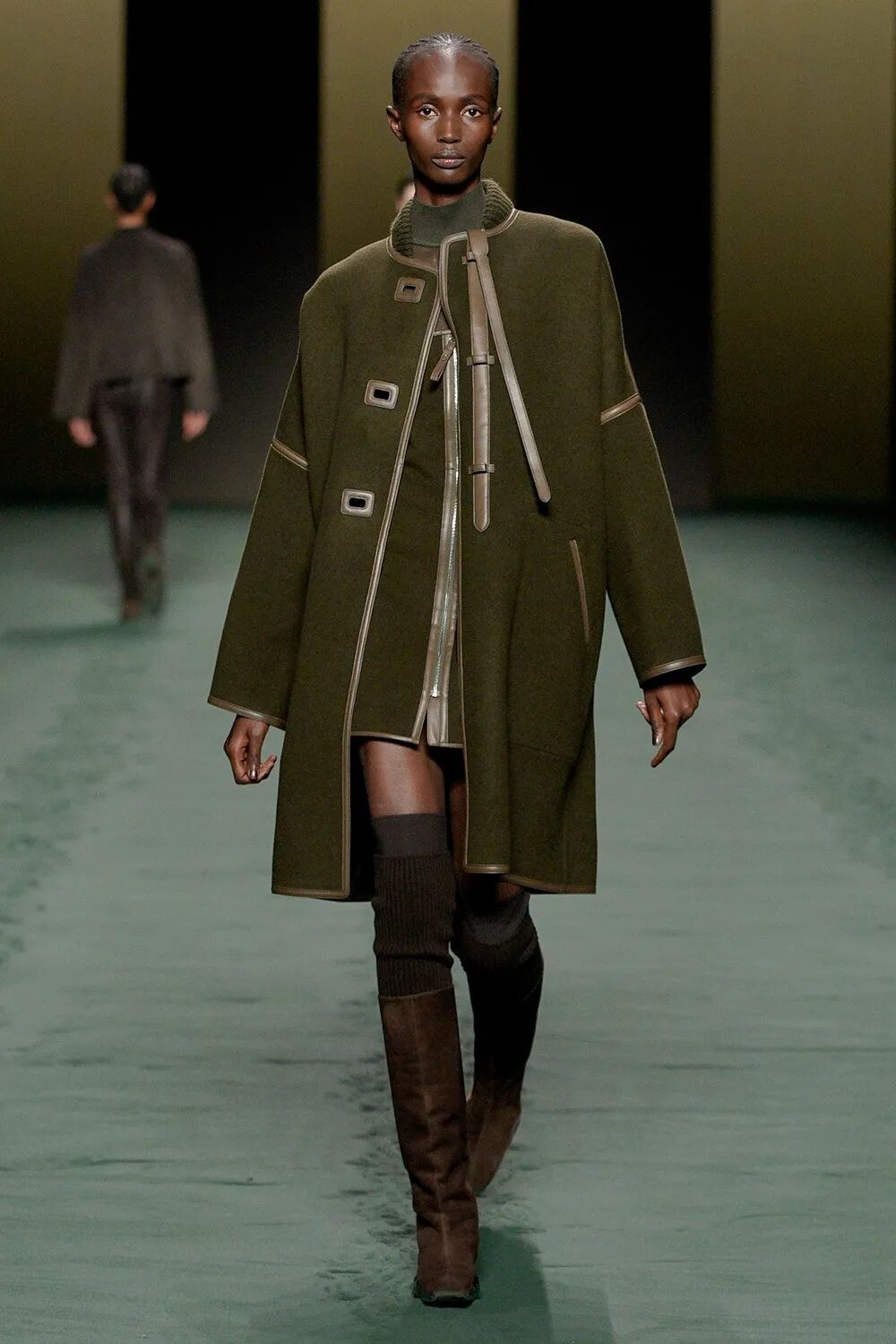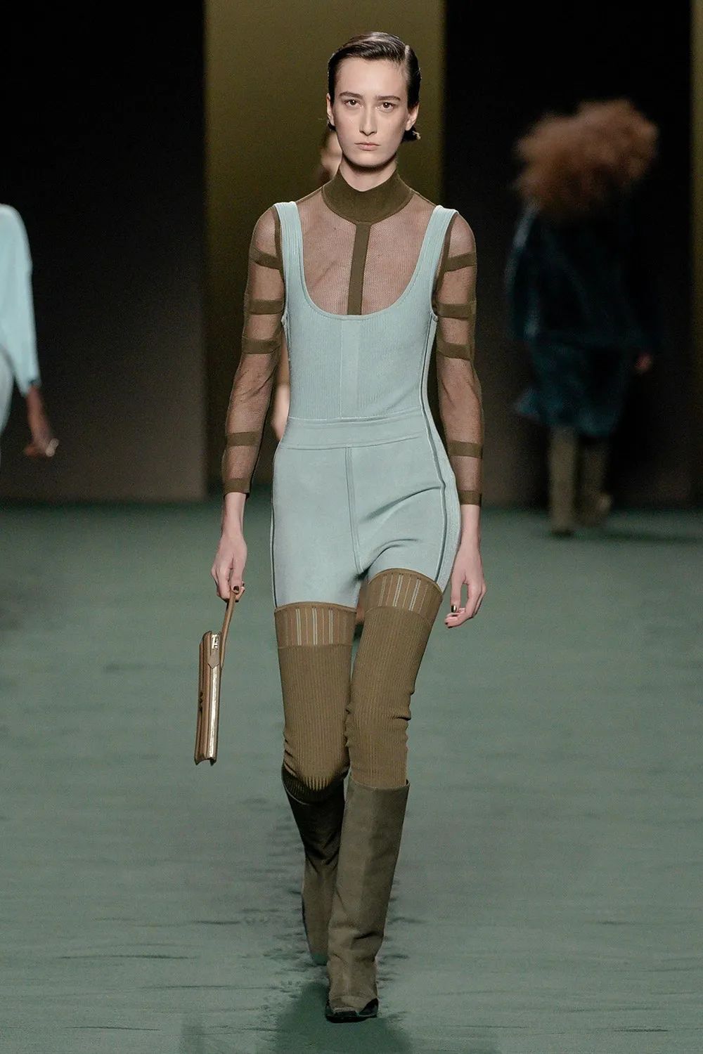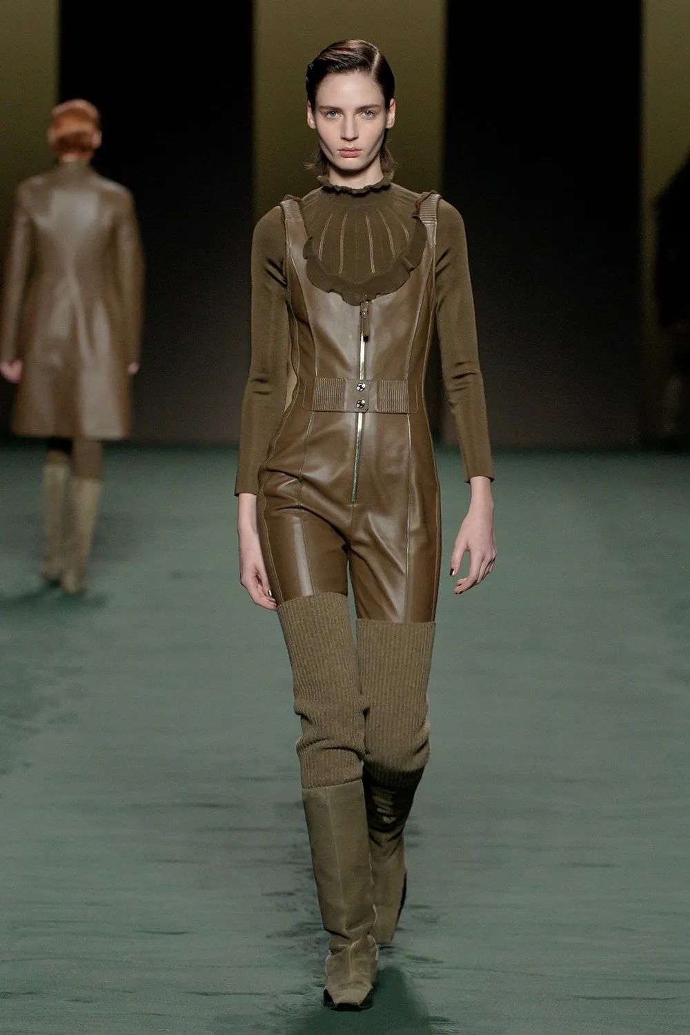 硬朗野性的皮革元素被重新诠释,剪裁更加靠近贴合身形的方向,女性的细腻柔软有了弧度。皮革跟其他材质的拼接也有大量出现,在原本厚重的毛呢大衣和贴肤的网纱里加入皮革元素,空灵感更甚。大胆的透视元素在此系列中多次出现,模特身着神秘的透明肤感针织衫,仿佛20世纪50年代初期出没于巴黎塞纳河左岸地下俱乐部的猫女,不受规则的桎梏,只有无尽的野性和优雅。表达女性内心真实的声音,依旧是爱马仕本季女装强调的时装态度。通过硬挺线条、利落的剪裁来刻画一个都市时髦女性的形象。同时用沉淀的品牌底色告诉观者,衣服最大的意义是“能陪伴你多久”。爱马仕外套的廓形一向值得细品,宽松舒适又明确线条,不会刻意束缚女性,也经得起时间的考验。无论是行走还是站立,都呈现洒脱有型的女性风格。