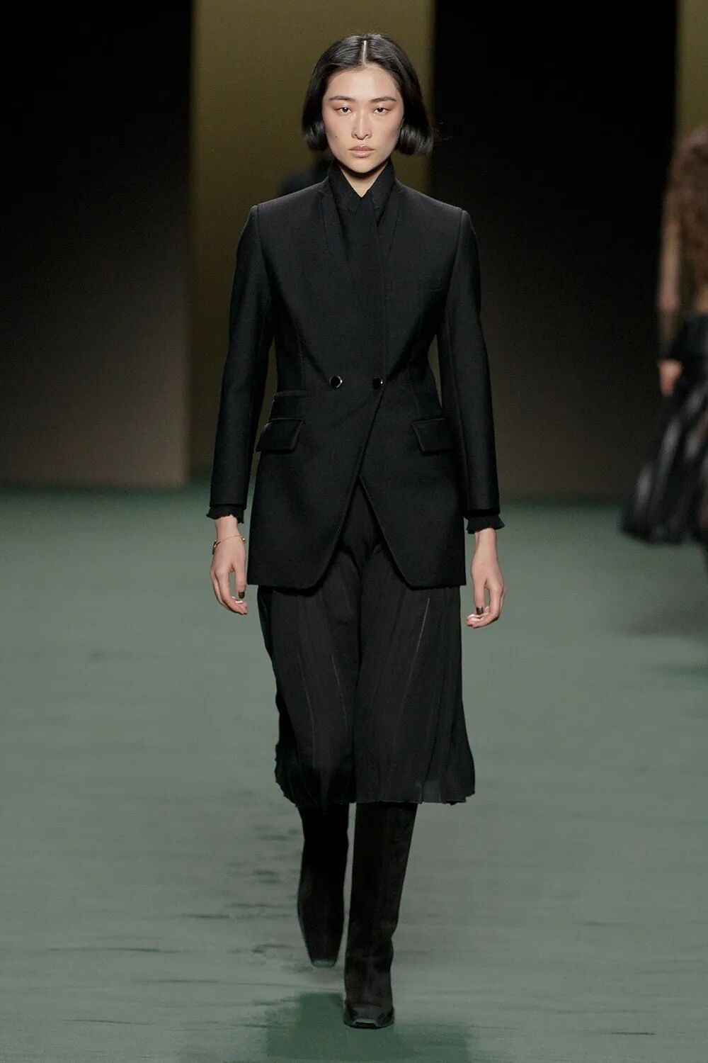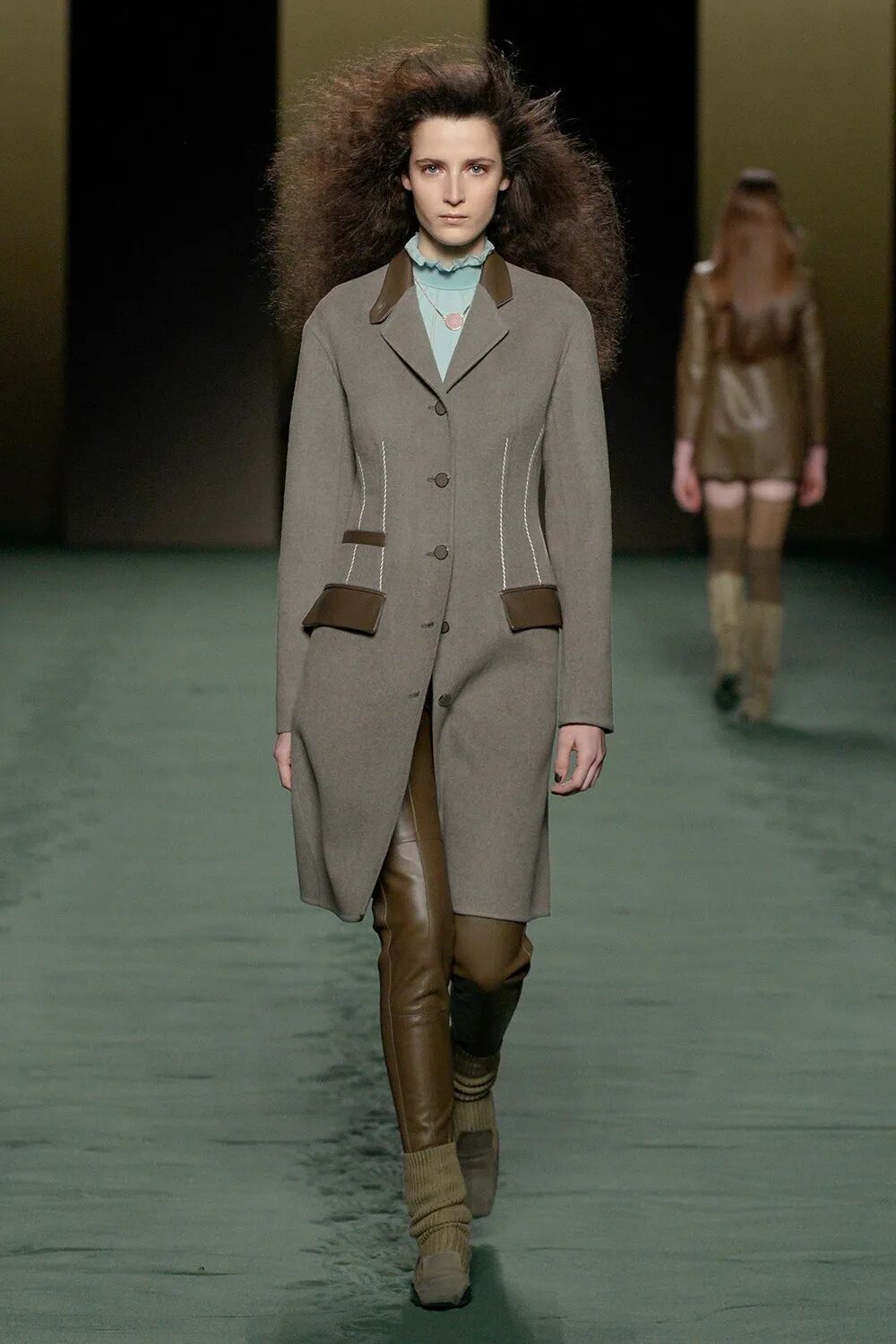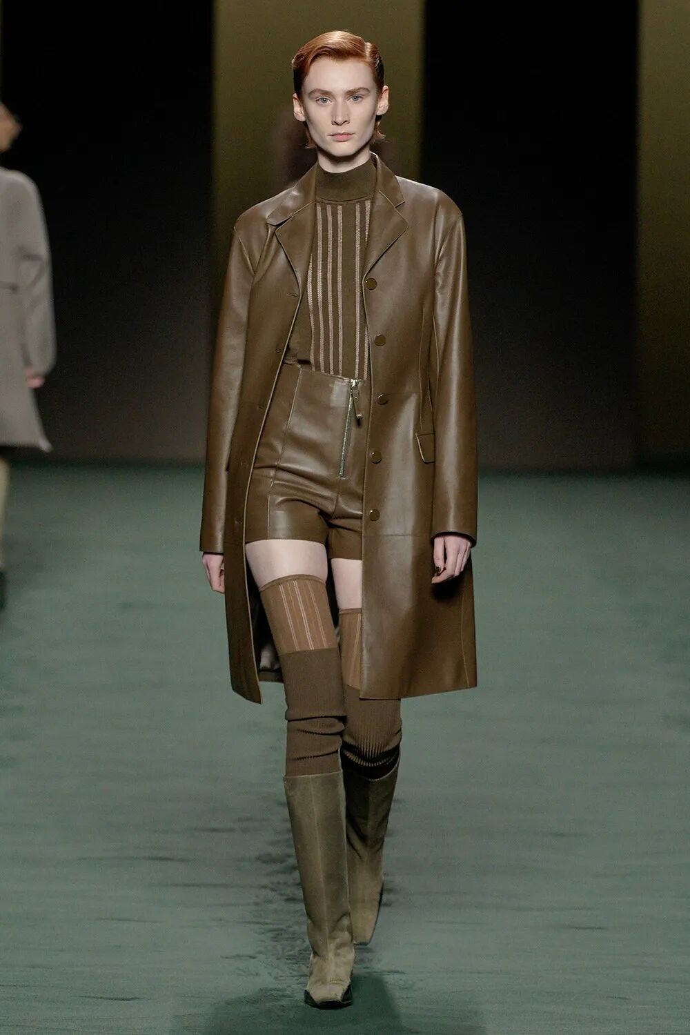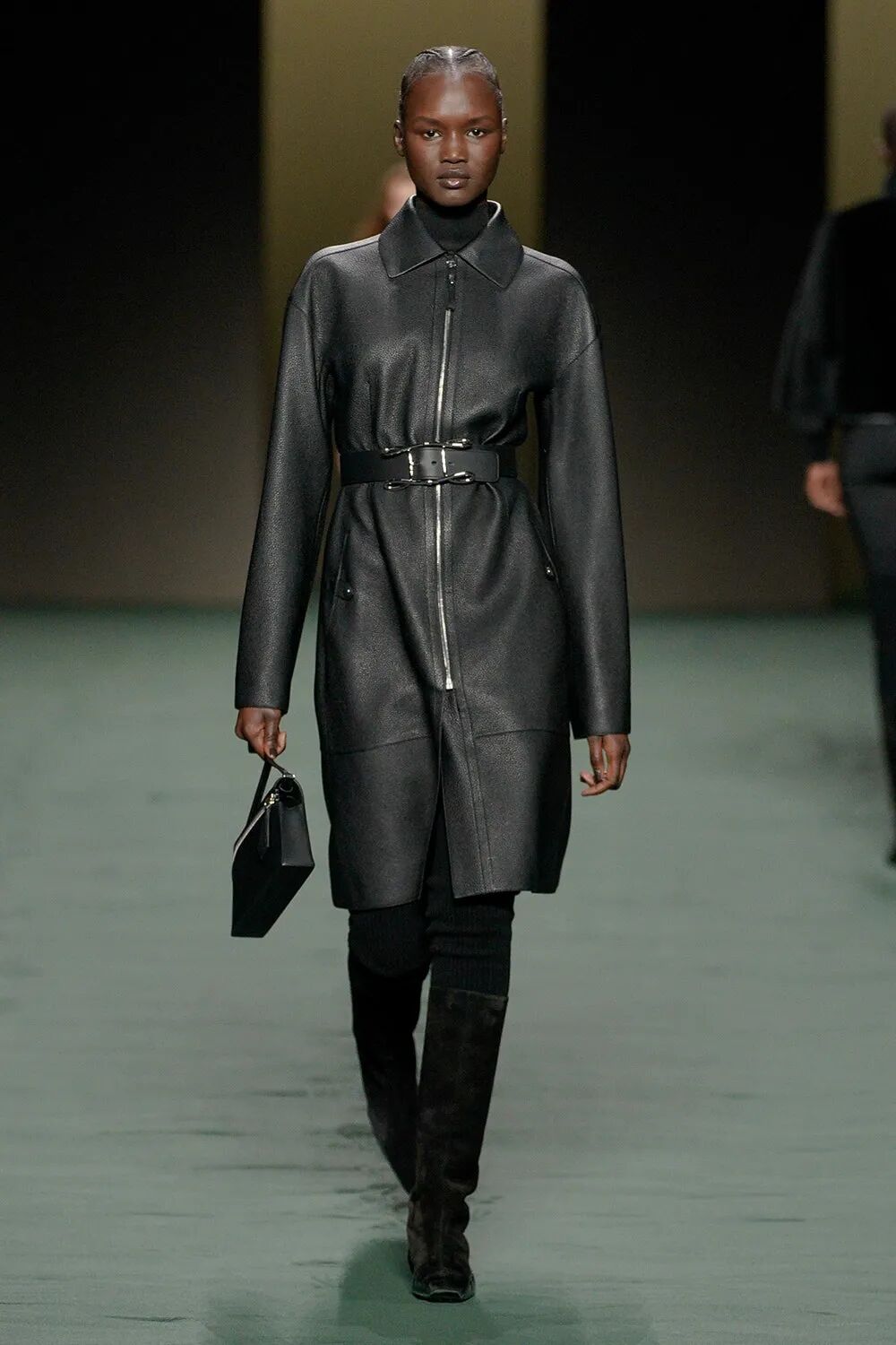 硬朗野性的皮革元素被重新诠释,剪裁更加靠近贴合身形的方向,女性的细腻柔软有了弧度。皮革跟其他材质的拼接也有大量出现,在原本厚重的毛呢大衣和贴肤的网纱里加入皮革元素,空灵感更甚。大胆的透视元素在此系列中多次出现,模特身着神秘的透明肤感针织衫,仿佛20世纪50年代初期出没于巴黎塞纳河左岸地下俱乐部的猫女,不受规则的桎梏,只有无尽的野性和优雅。表达女性内心真实的声音,依旧是爱马仕本季女装强调的时装态度。通过硬挺线条、利落的剪裁来刻画一个都市时髦女性的形象。同时用沉淀的品牌底色告诉观者,衣服最大的意义是“能陪伴你多久”。爱马仕外套的廓形一向值得细品,宽松舒适又明确线条,不会刻意束缚女性,也经得起时间的考验。无论是行走还是站立,都呈现洒脱有型的女性风格。