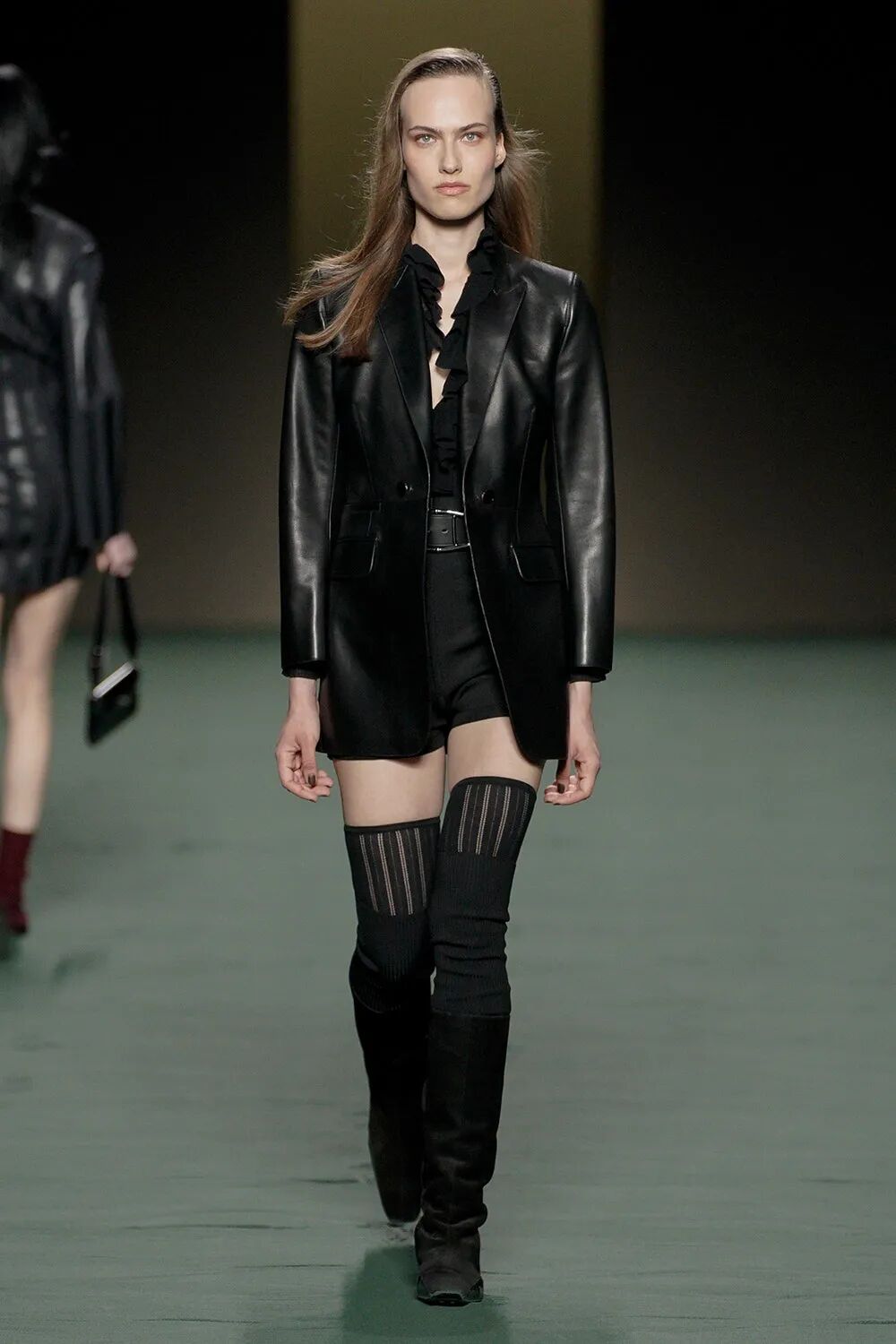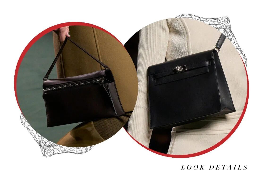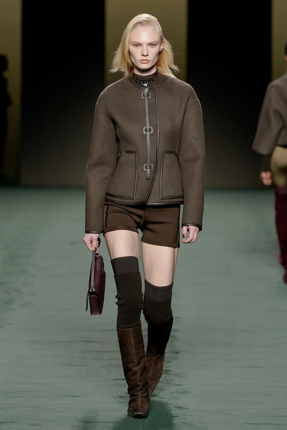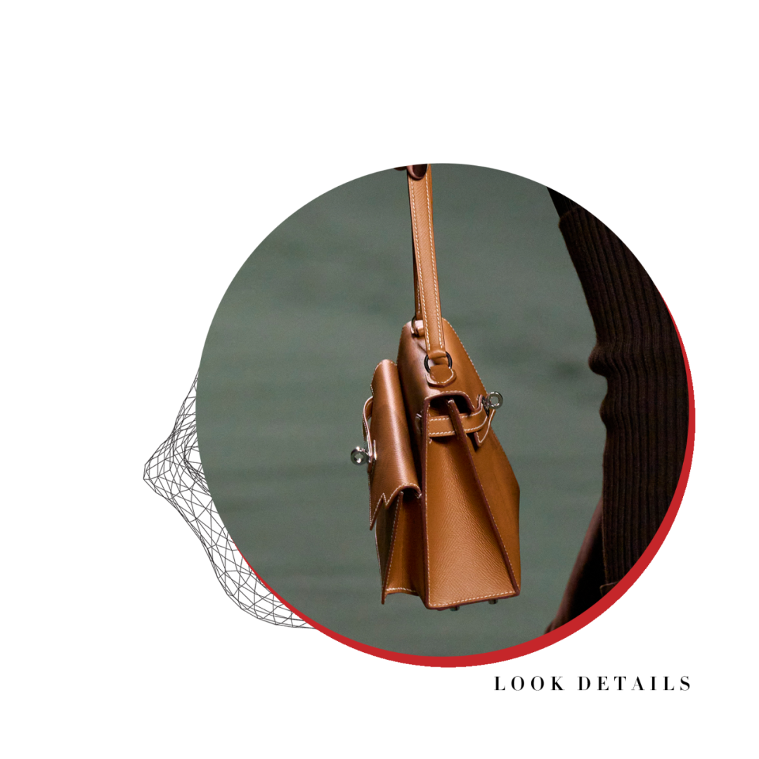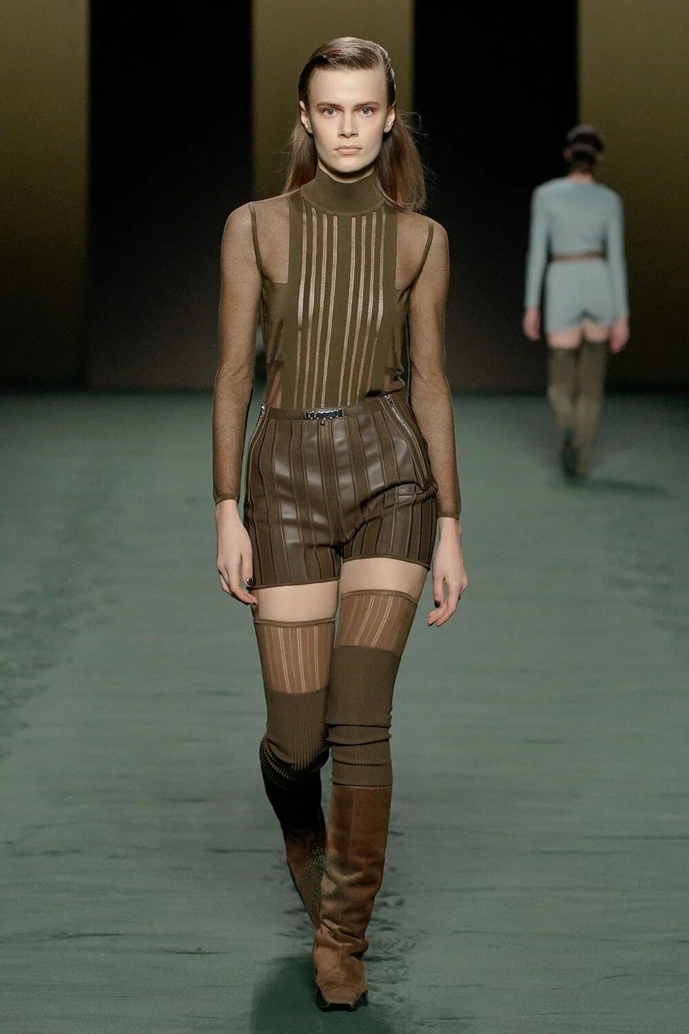 硬朗野性的皮革元素被重新诠释,剪裁更加靠近贴合身形的方向,女性的细腻柔软有了弧度。皮革跟其他材质的拼接也有大量出现,在原本厚重的毛呢大衣和贴肤的网纱里加入皮革元素,空灵感更甚。大胆的透视元素在此系列中多次出现,模特身着神秘的透明肤感针织衫,仿佛20世纪50年代初期出没于巴黎塞纳河左岸地下俱乐部的猫女,不受规则的桎梏,只有无尽的野性和优雅。表达女性内心真实的声音,依旧是爱马仕本季女装强调的时装态度。通过硬挺线条、利落的剪裁来刻画一个都市时髦女性的形象。同时用沉淀的品牌底色告诉观者,衣服最大的意义是“能陪伴你多久”。爱马仕外套的廓形一向值得细品,宽松舒适又明确线条,不会刻意束缚女性,也经得起时间的考验。无论是行走还是站立,都呈现洒脱有型的女性风格。