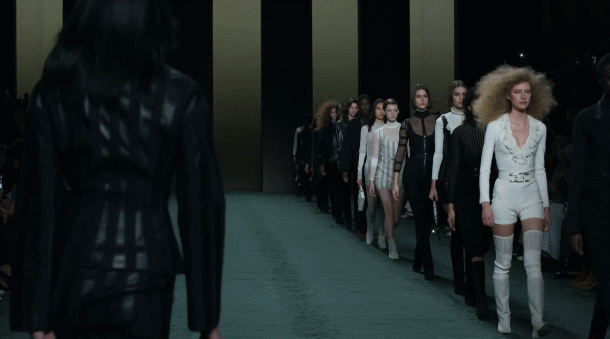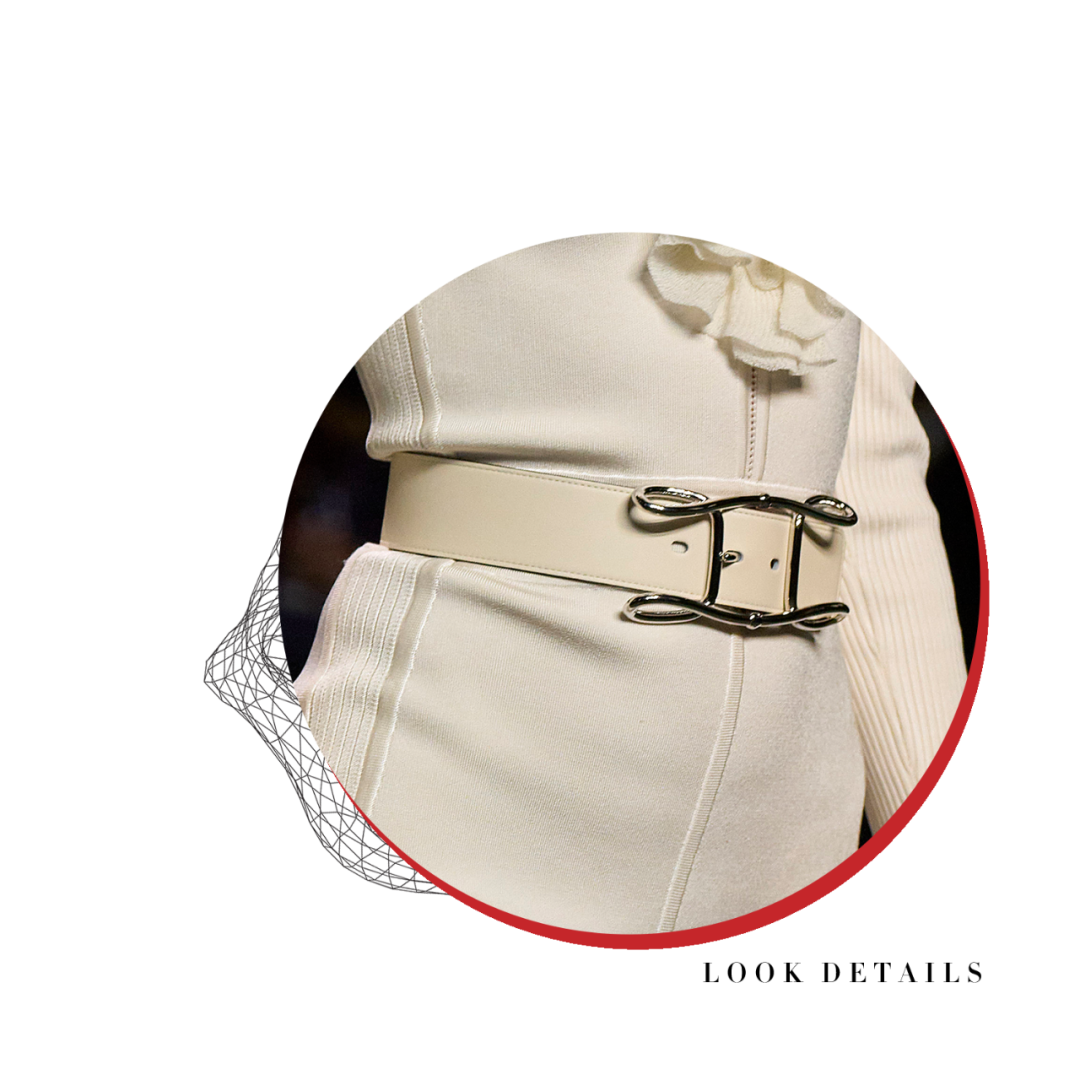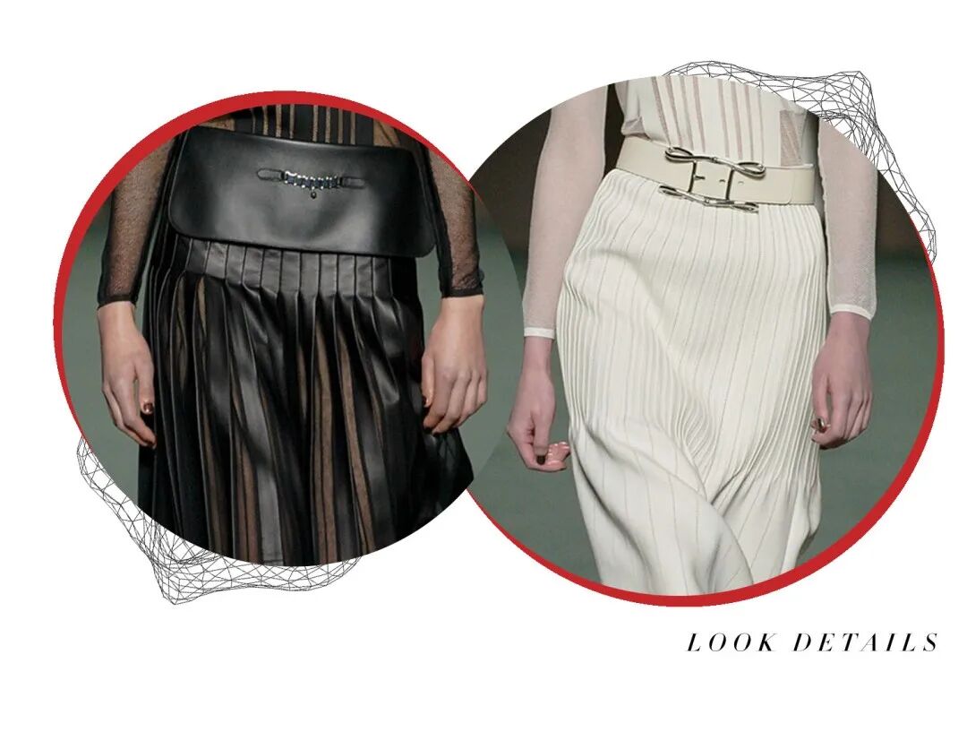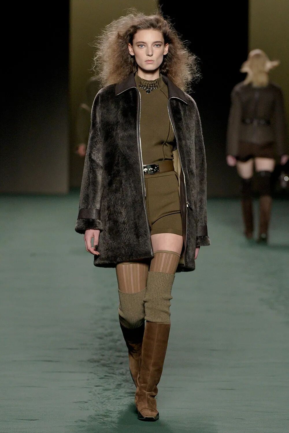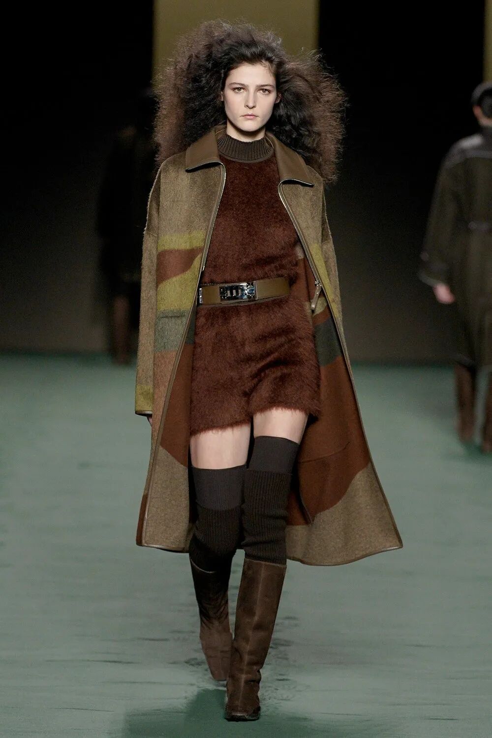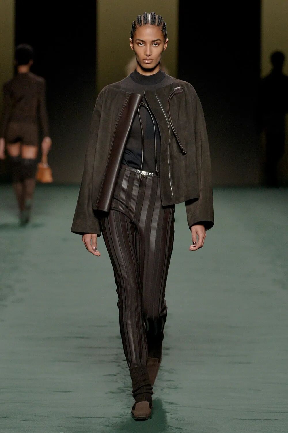 硬朗野性的皮革元素被重新诠释,剪裁更加靠近贴合身形的方向,女性的细腻柔软有了弧度。皮革跟其他材质的拼接也有大量出现,在原本厚重的毛呢大衣和贴肤的网纱里加入皮革元素,空灵感更甚。大胆的透视元素在此系列中多次出现,模特身着神秘的透明肤感针织衫,仿佛20世纪50年代初期出没于巴黎塞纳河左岸地下俱乐部的猫女,不受规则的桎梏,只有无尽的野性和优雅。表达女性内心真实的声音,依旧是爱马仕本季女装强调的时装态度。通过硬挺线条、利落的剪裁来刻画一个都市时髦女性的形象。同时用沉淀的品牌底色告诉观者,衣服最大的意义是“能陪伴你多久”。爱马仕外套的廓形一向值得细品,宽松舒适又明确线条,不会刻意束缚女性,也经得起时间的考验。无论是行走还是站立,都呈现洒脱有型的女性风格。