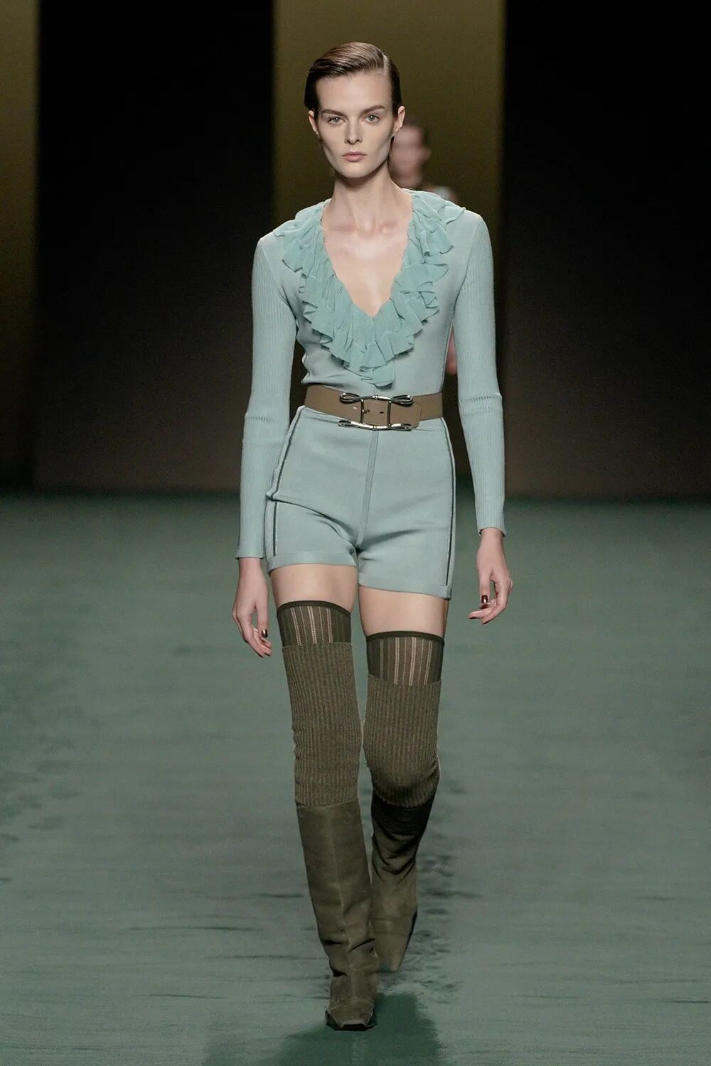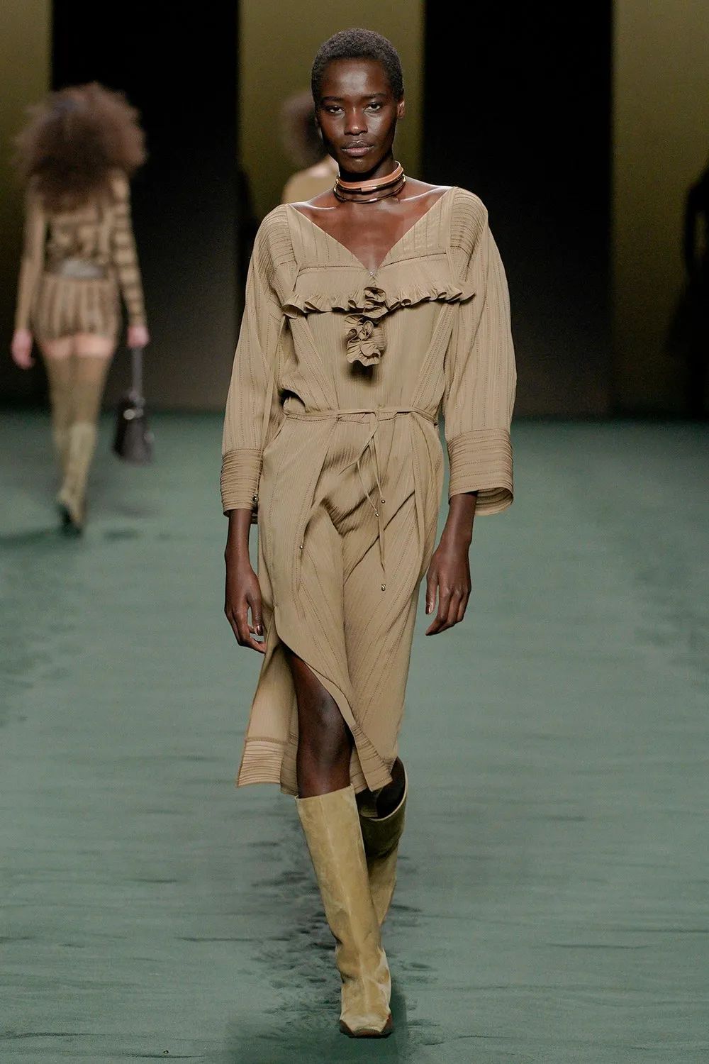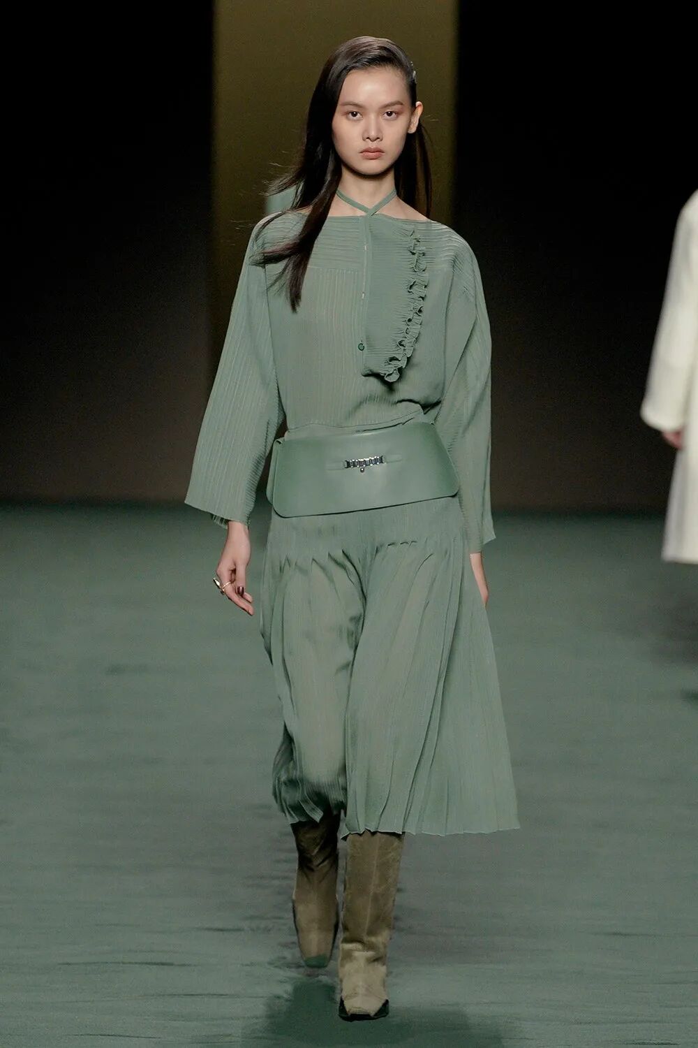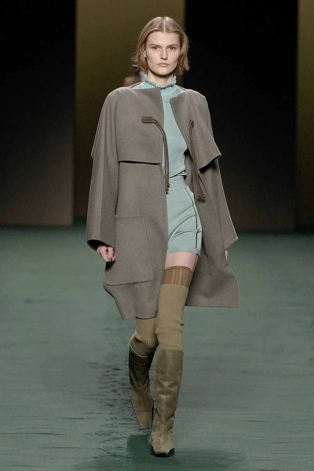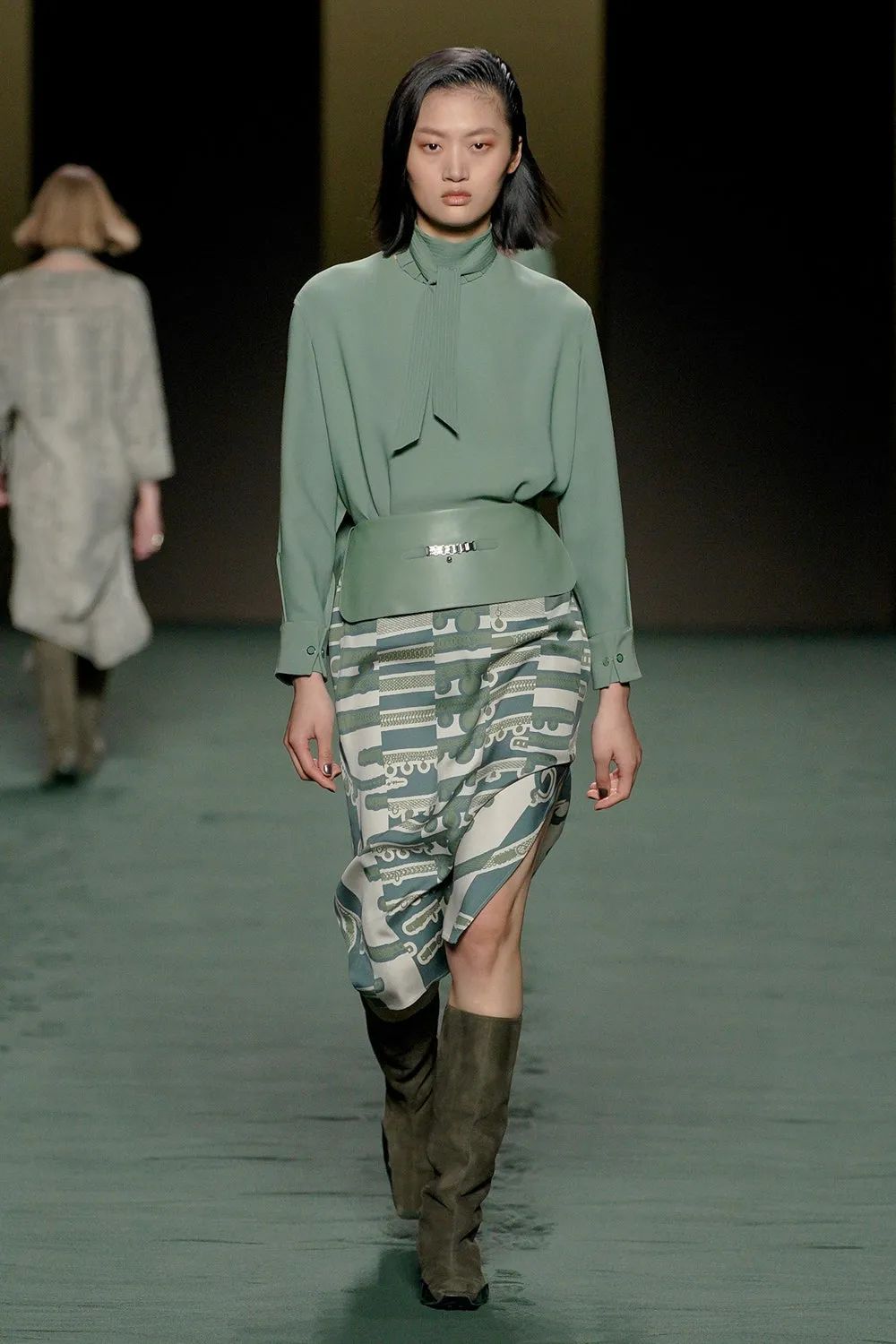基础色系和低饱和色彩贯穿全场,灵动的陶瓷蓝、鲜活的松石绿、沉稳的赭石色搭配出现,更靠近自然的柔和色彩低调中透露出强大的自信,这种永恒的色彩更加令人沉迷。女性的柔美被写进层叠的荷叶边领里,柔软的布料泛着微微的光泽,随着模特的走动,释放出随心所欲的自在感。本季在爱马仕传统的H形剪裁中,增加了收腰设计,更加注重女性的曲线美。留白也是一种重点表达手法,在长靴和下装之间的空隙,裸露出小段腿部线条,优雅又令人遐想;开衩的裙摆也若隐若现地露出部分肌肤,轻盈的主题被进一步强调。