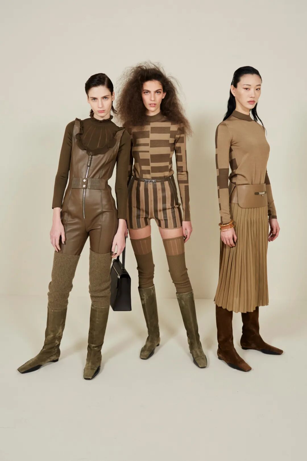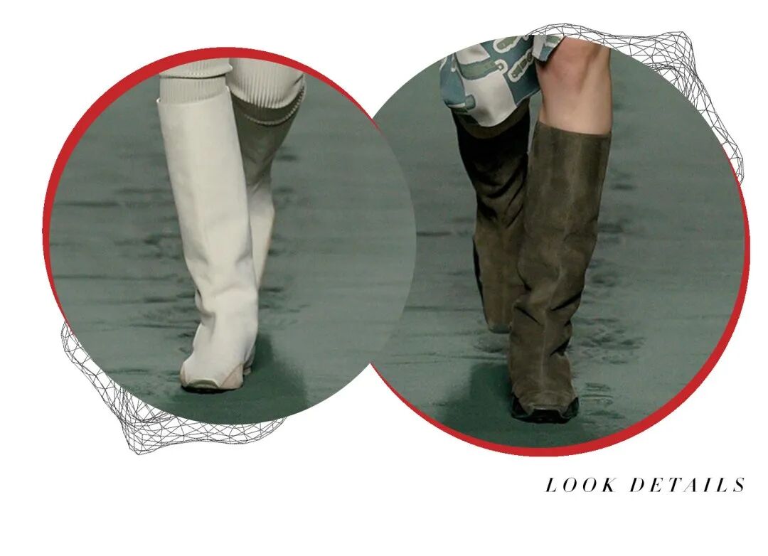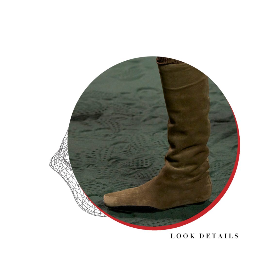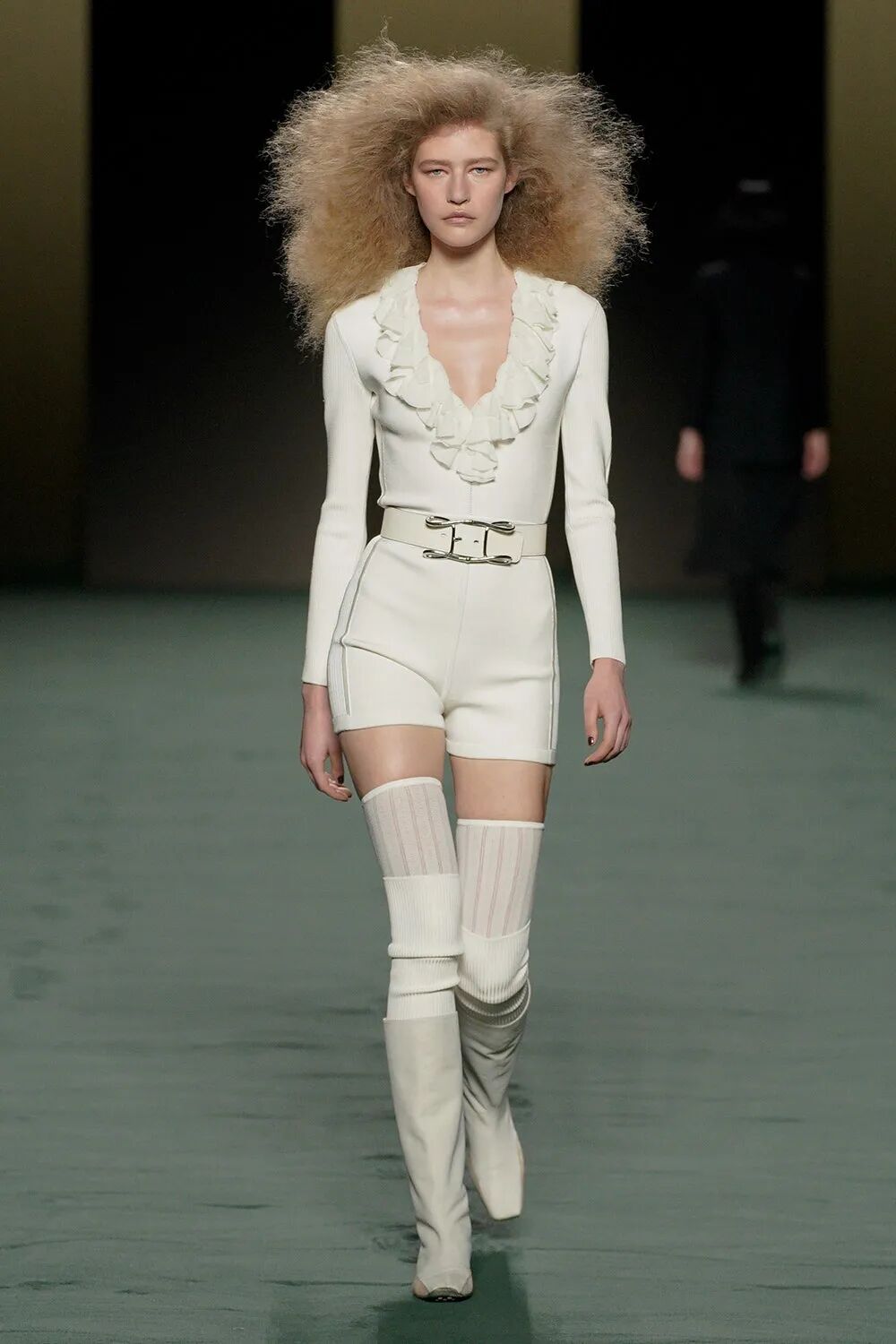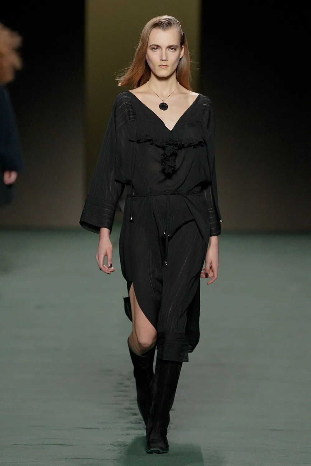 基础色系和低饱和色彩贯穿全场,灵动的陶瓷蓝、鲜活的松石绿、沉稳的赭石色搭配出现,更靠近自然的柔和色彩低调中透露出强大的自信,这种永恒的色彩更加令人沉迷。女性的柔美被写进层叠的荷叶边领里,柔软的布料泛着微微的光泽,随着模特的走动,释放出随心所欲的自在感。本季在爱马仕传统的H形剪裁中,增加了收腰设计,更加注重女性的曲线美。留白也是一种重点表达手法,在长靴和下装之间的空隙,裸露出小段腿部线条,优雅又令人遐想;开衩的裙摆也若隐若现地露出部分肌肤,轻盈的主题被进一步强调。