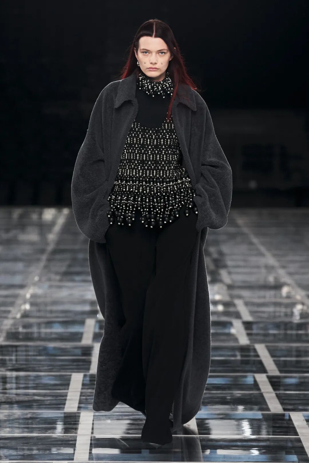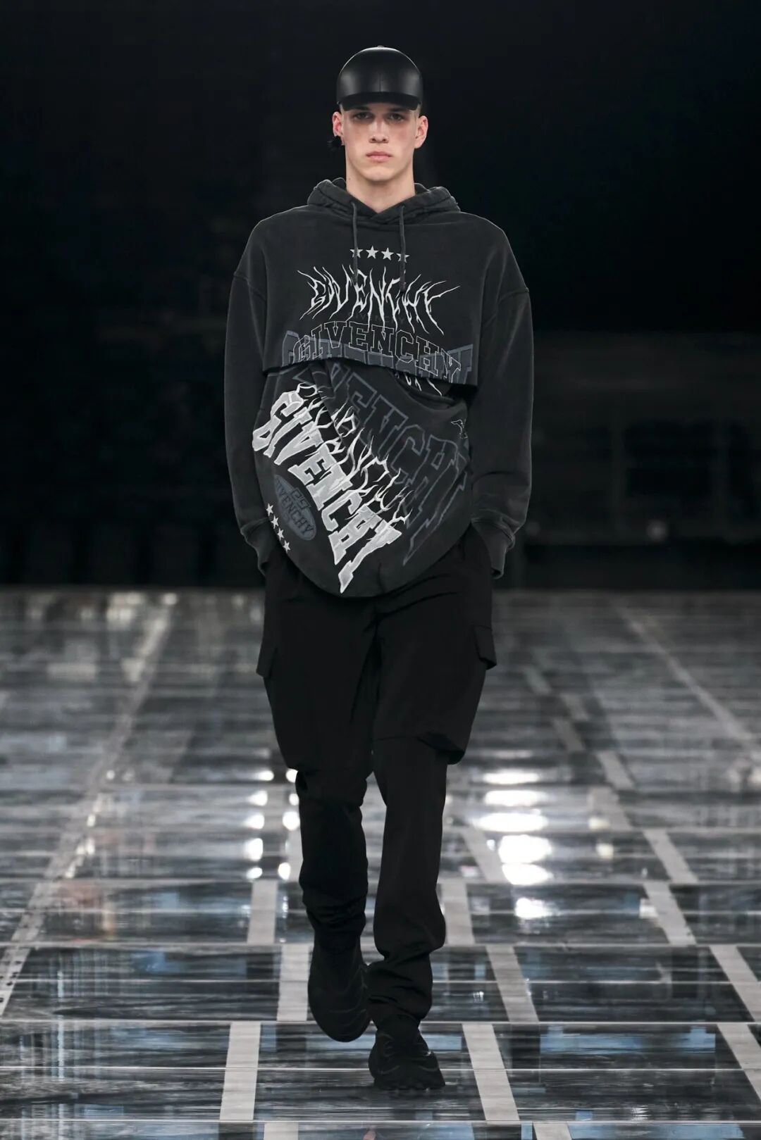 这是专属于Givenchy的浪漫,Matthew M. Williams以标志性风格将人们对于服装类别的定义引向暧昧的边缘地带,将成衣制作纳入高级定制语境,向Hubert de Givenchy先生兼具实用与观赏性的理念致敬。街头风与古典元素在此刻达成了和谐统一,休闲的丹宁元素与珍珠亮片并存,这无疑又是一次对时尚语言的突破性表达。细节处的巧思首先体现在层次感的运用上,宽松T恤以分层解构造型完美映衬了品牌近些年一以贯之的街头风格。中性化的设计打破了服装的性别边界,在主色调黑色的映照下以实验性印花与4D印花刺绣呈现出多元化的肌理感与疏密差异。服装的叠穿在另一维度诠释着本季休闲装的标志性风格,衣长及地的廓形大衣与暗色内搭相得益彰,在强烈的冲突对比中呈现出丰盈流畅的层次感。