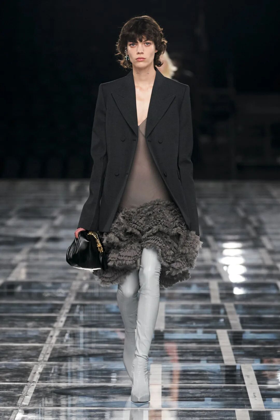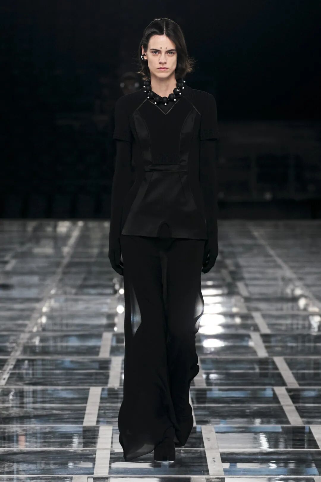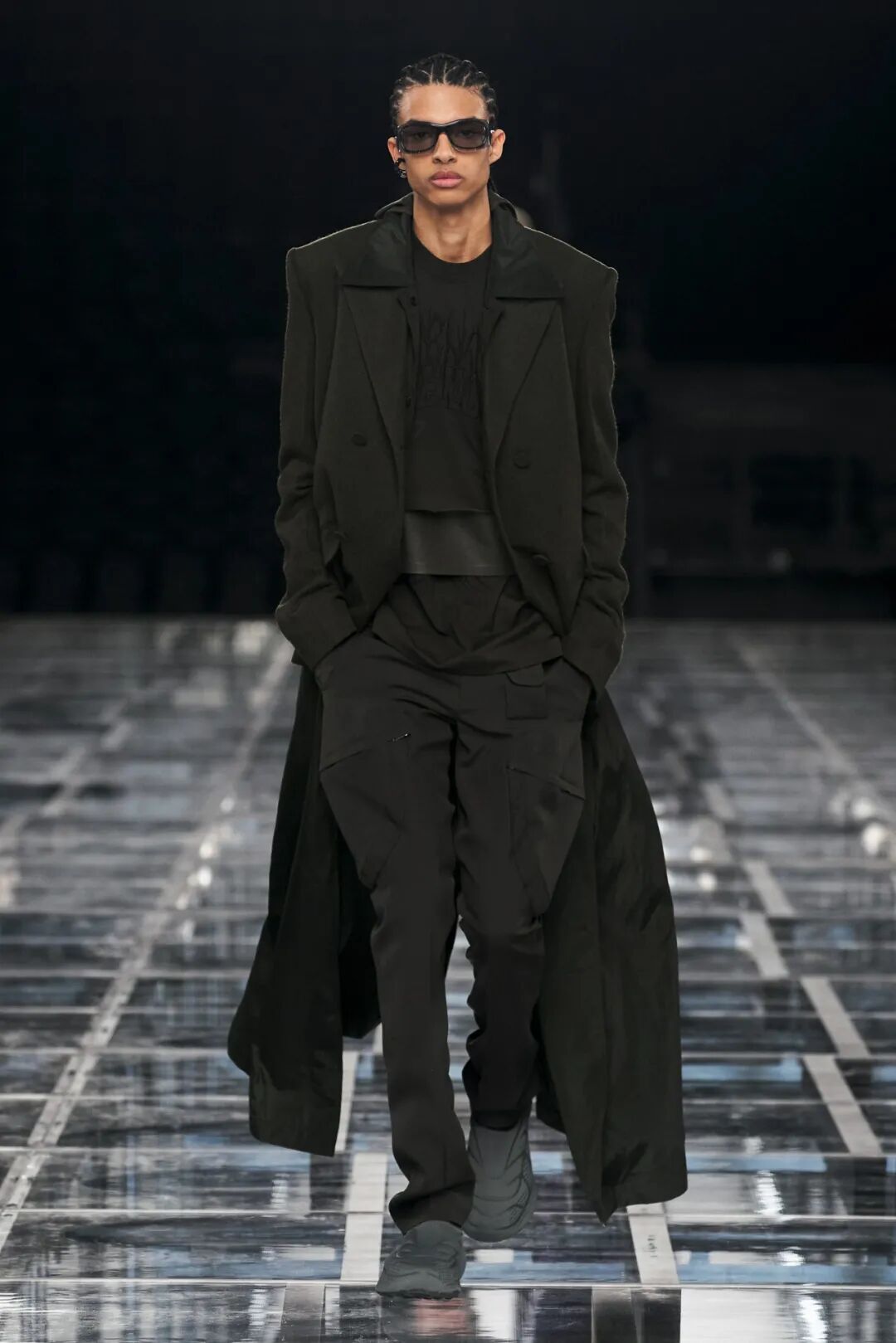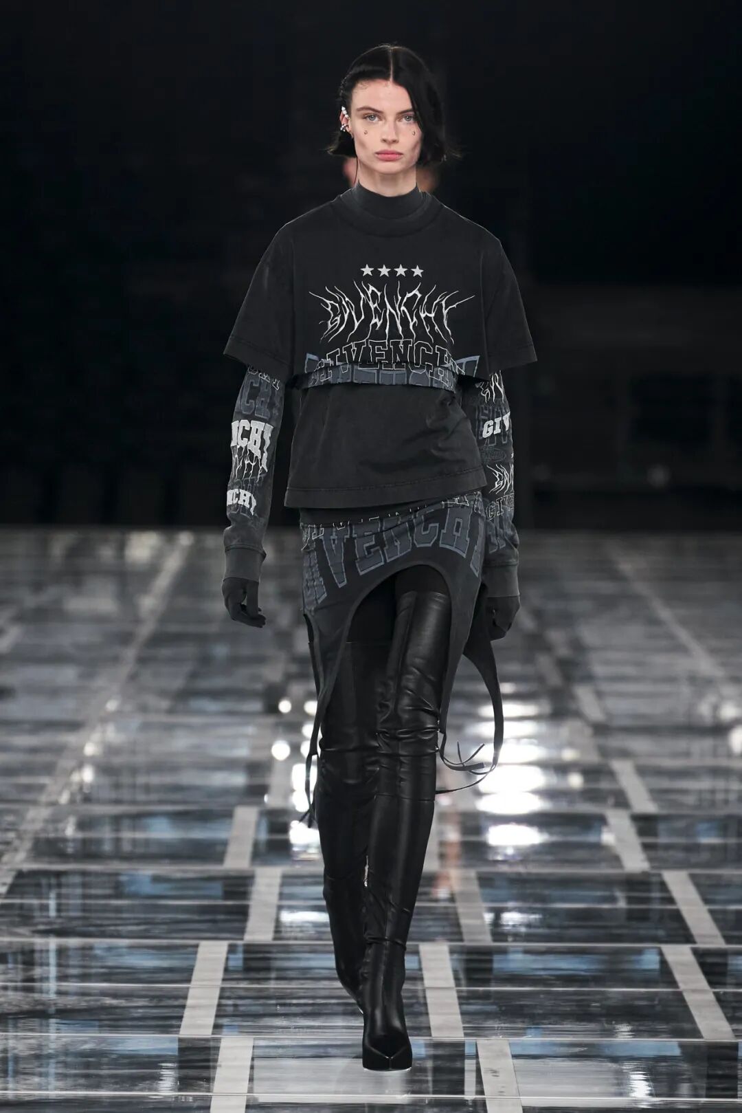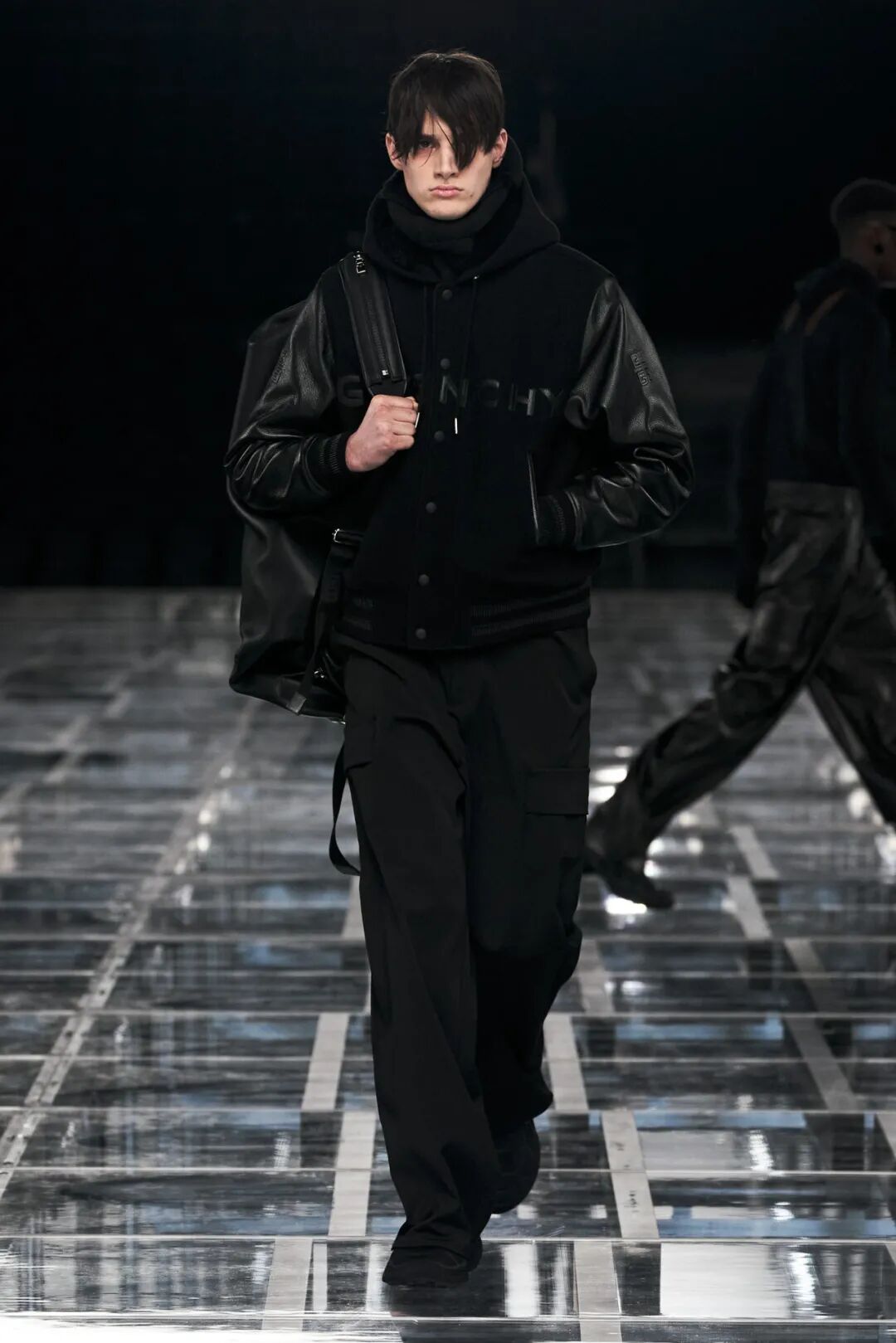 “我非常想创造出结合力量感与精致女性感,融合美式与法式风格,兼具运动感与工艺感的女性形象。同时打造出现代并且时髦冷静的男性形象。这两种形象都在秀场上以充满现实感的方式得以呈现。”创意总监Matthew M. Williams曾这样概括本季设计。于是,埋藏在品牌档案馆中的高级定制元素与手工艺在当代语境中重拾生机,一切仿佛对立的风格皆被容纳于日常造型的表达中,简约或张扬,松弛或正式,实用性或美观性,在Matthew M. Williams的设计语言中,不存在选择题,这是一场激动人心的风格拼图游戏。当音乐响起,模特们穿梭于腾空架起的十字形玻璃栈道上,轮廓处坚硬的黑色支架棱角分明,隐约透露出底部匆匆略过的人影,身穿Givenchy华服的男男女女在聚光灯下将华丽与实用流畅串联,顷刻间仿若将观众代入虚拟世界。