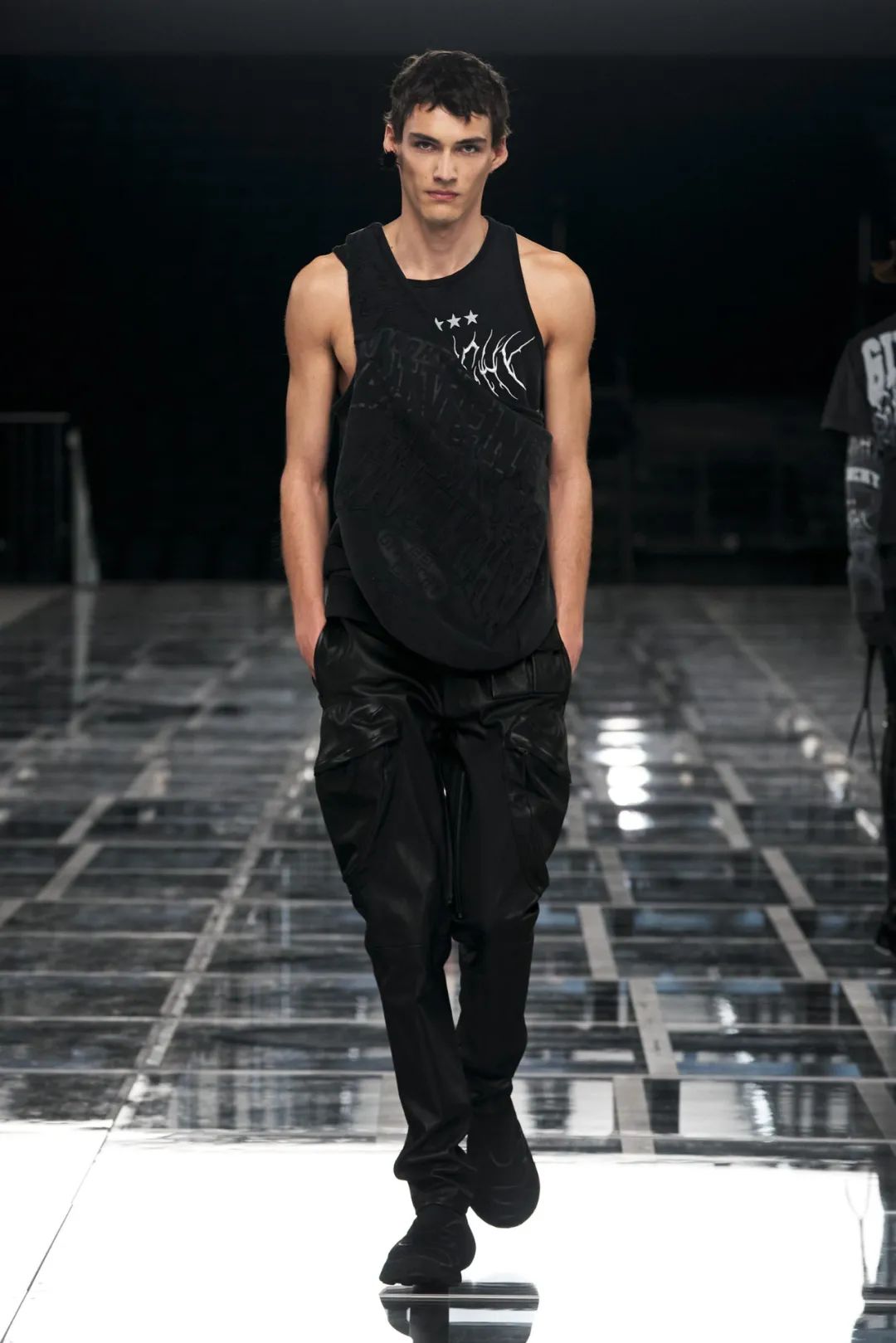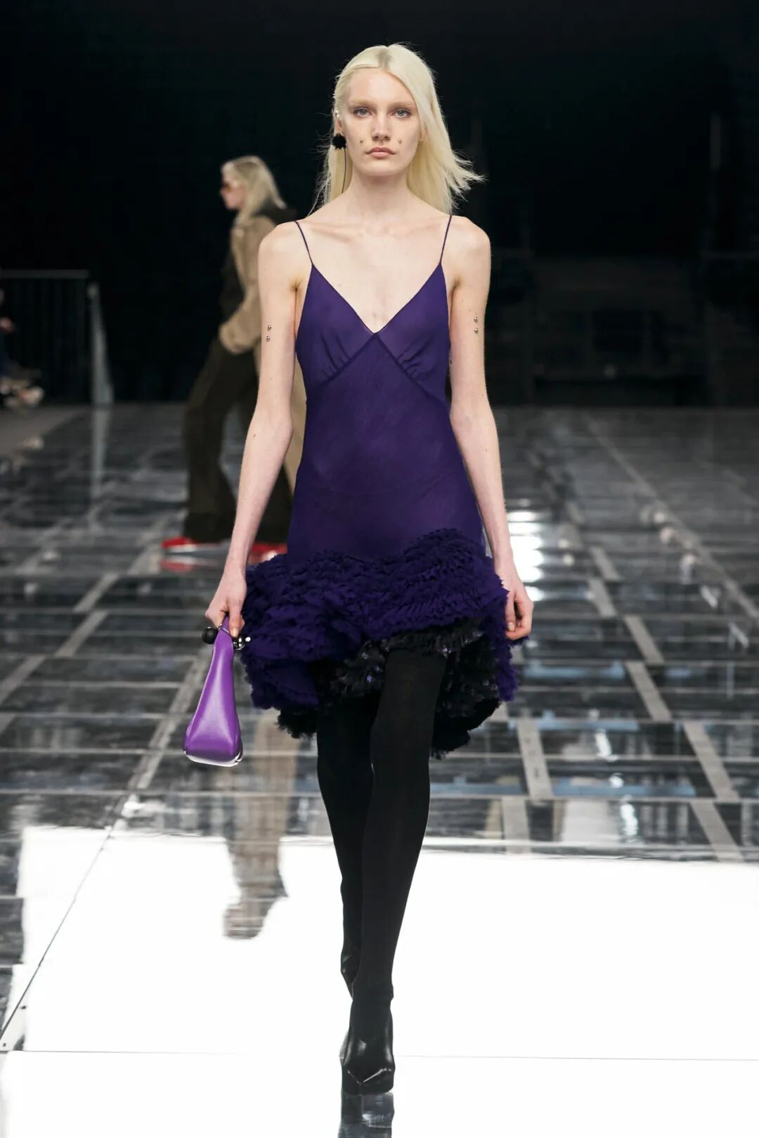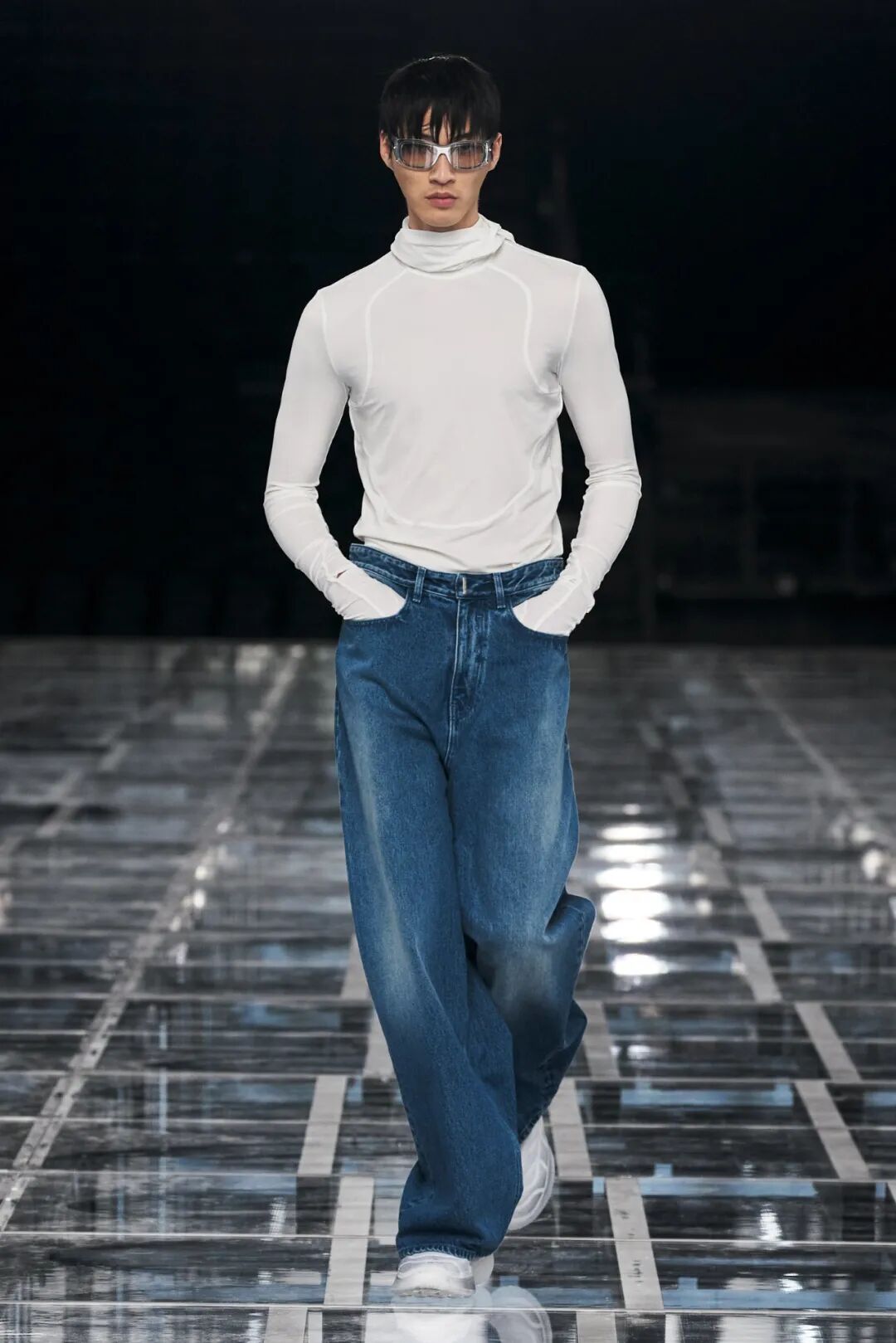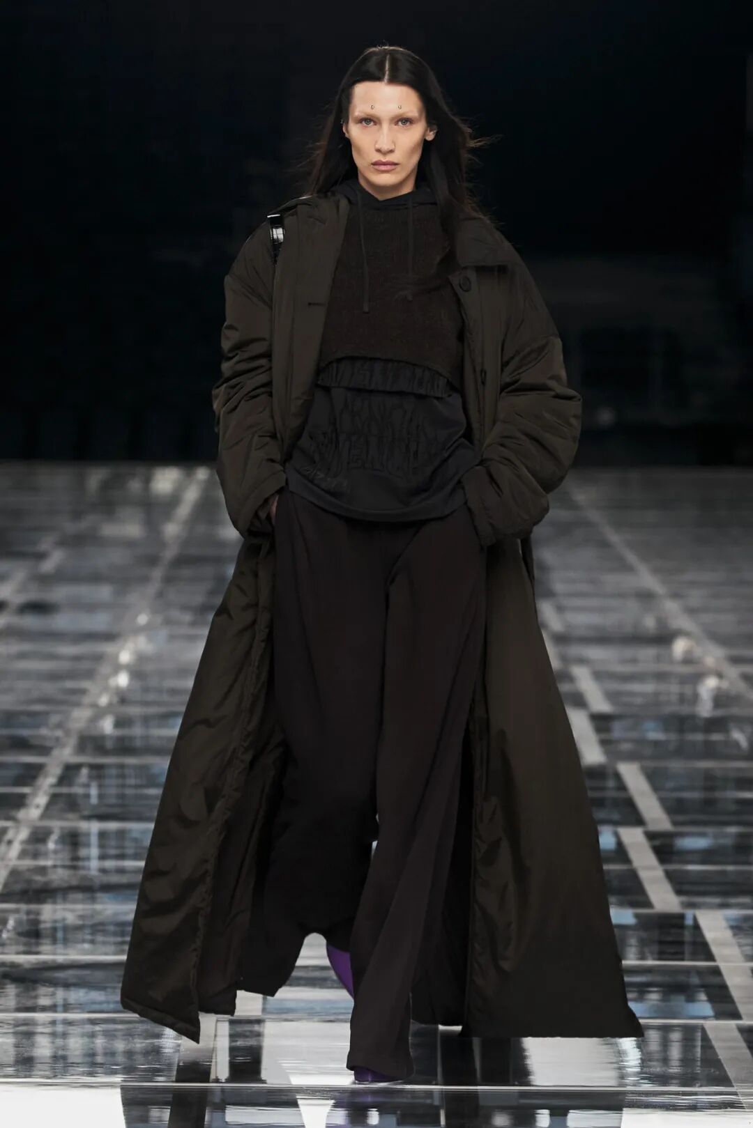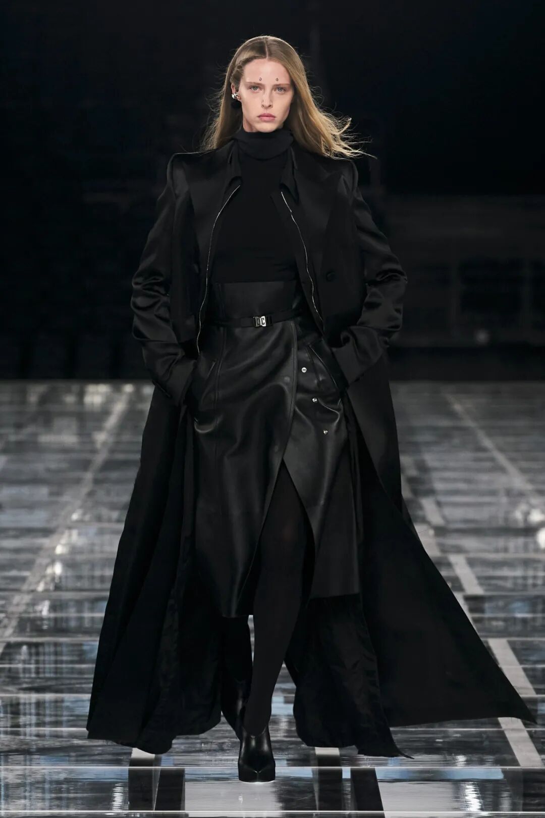 “我非常想创造出结合力量感与精致女性感,融合美式与法式风格,兼具运动感与工艺感的女性形象。同时打造出现代并且时髦冷静的男性形象。这两种形象都在秀场上以充满现实感的方式得以呈现。”创意总监Matthew M. Williams曾这样概括本季设计。于是,埋藏在品牌档案馆中的高级定制元素与手工艺在当代语境中重拾生机,一切仿佛对立的风格皆被容纳于日常造型的表达中,简约或张扬,松弛或正式,实用性或美观性,在Matthew M. Williams的设计语言中,不存在选择题,这是一场激动人心的风格拼图游戏。当音乐响起,模特们穿梭于腾空架起的十字形玻璃栈道上,轮廓处坚硬的黑色支架棱角分明,隐约透露出底部匆匆略过的人影,身穿Givenchy华服的男男女女在聚光灯下将华丽与实用流畅串联,顷刻间仿若将观众代入虚拟世界。