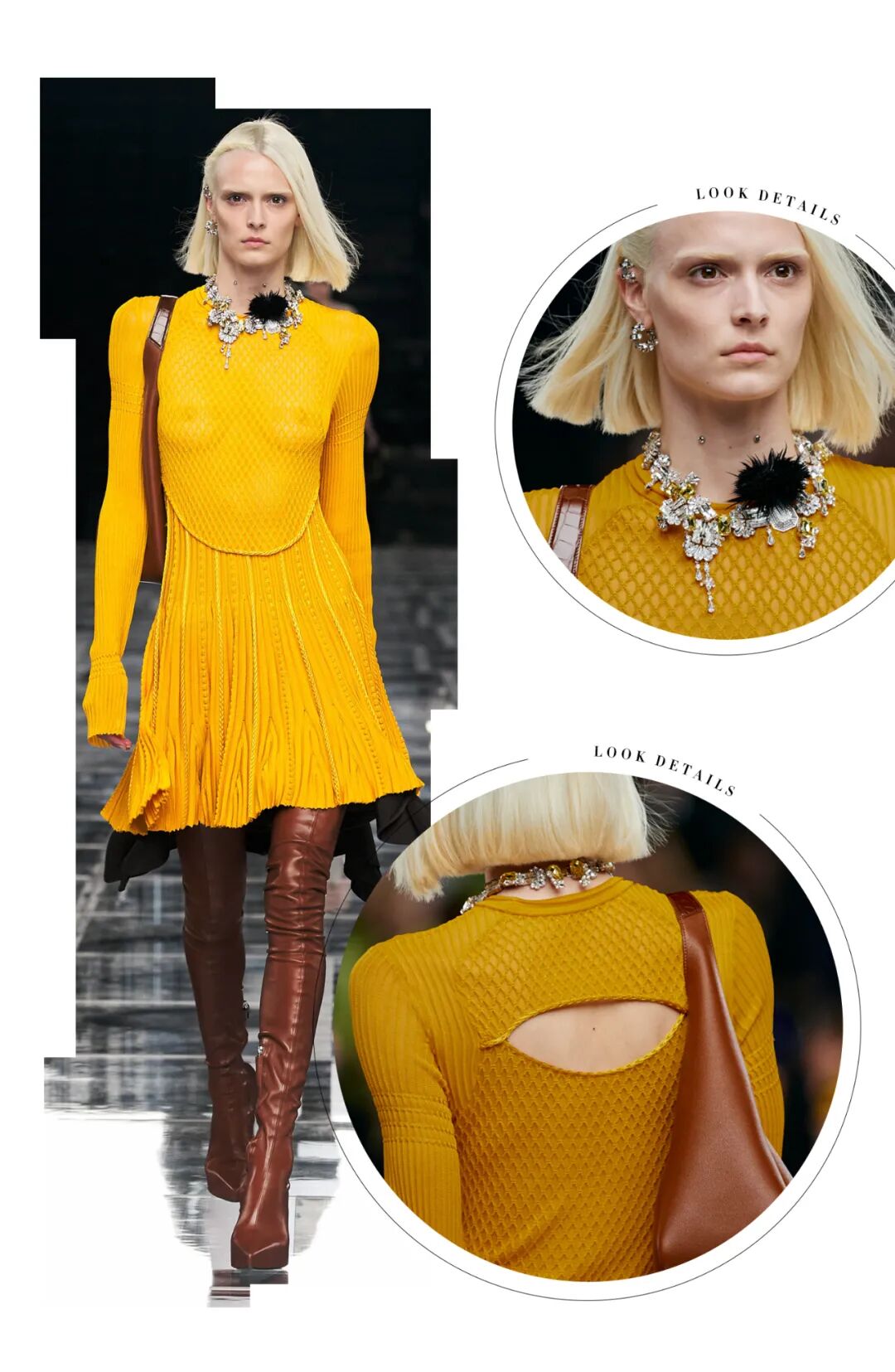 令人惊喜的是,赫本式的优雅在Matthew M. Williams玩味不羁的表达中仍然有迹可循。独属于小黑裙的极简式设计被注入本季裙装、上衣及裤装中,在一丝不苟的轮廓中装点含蓄的细节亮点,仿佛安静诉说着一则古老的童话。这朵小巧精致的淡紫色花朵是本季的主题,它取材自品牌档案馆中1955年的经典印花,名为刺芹花。除了以现代轮廓装点于硬朗外套上,其还以更加动人的形式呈现在裙装中,由鹅毛全手工打造而成的立体刺绣刺芹花展现了Givenchy的独到匠心。背部细节是很容易令人忽略的亮点,明快色彩映衬下的裙装无须过多繁复装饰,仅凭借一个镂空设计便可令人过目不忘。