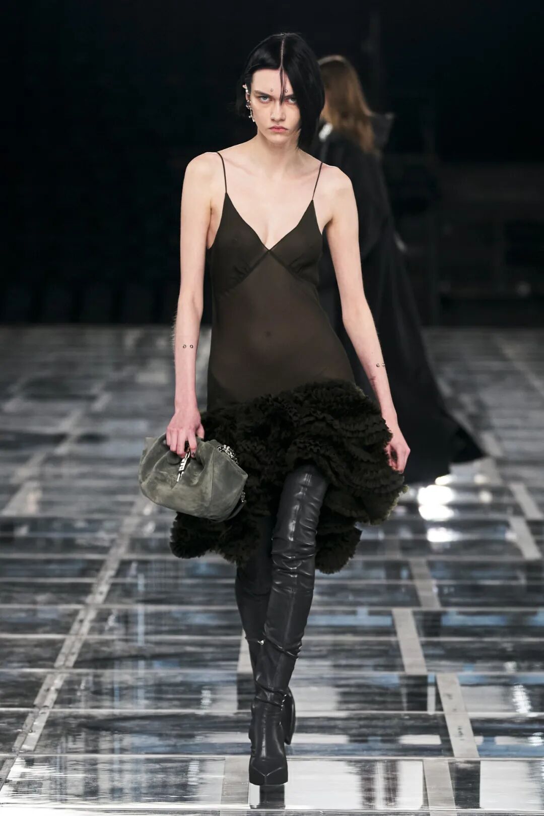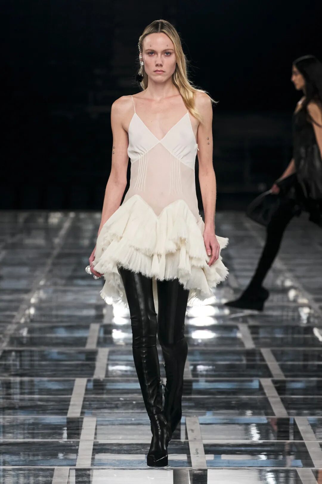 没有什么比繁复的荷叶边短裙更能搏得女孩儿欢心了,如果不够,那就再配上一双长靴。这一经典造型曾多次出现在Givenchy秀场上,而本季更是纳入了一条纯白色抹胸蛋糕裙,为女孩儿们提供了更多选择空间。