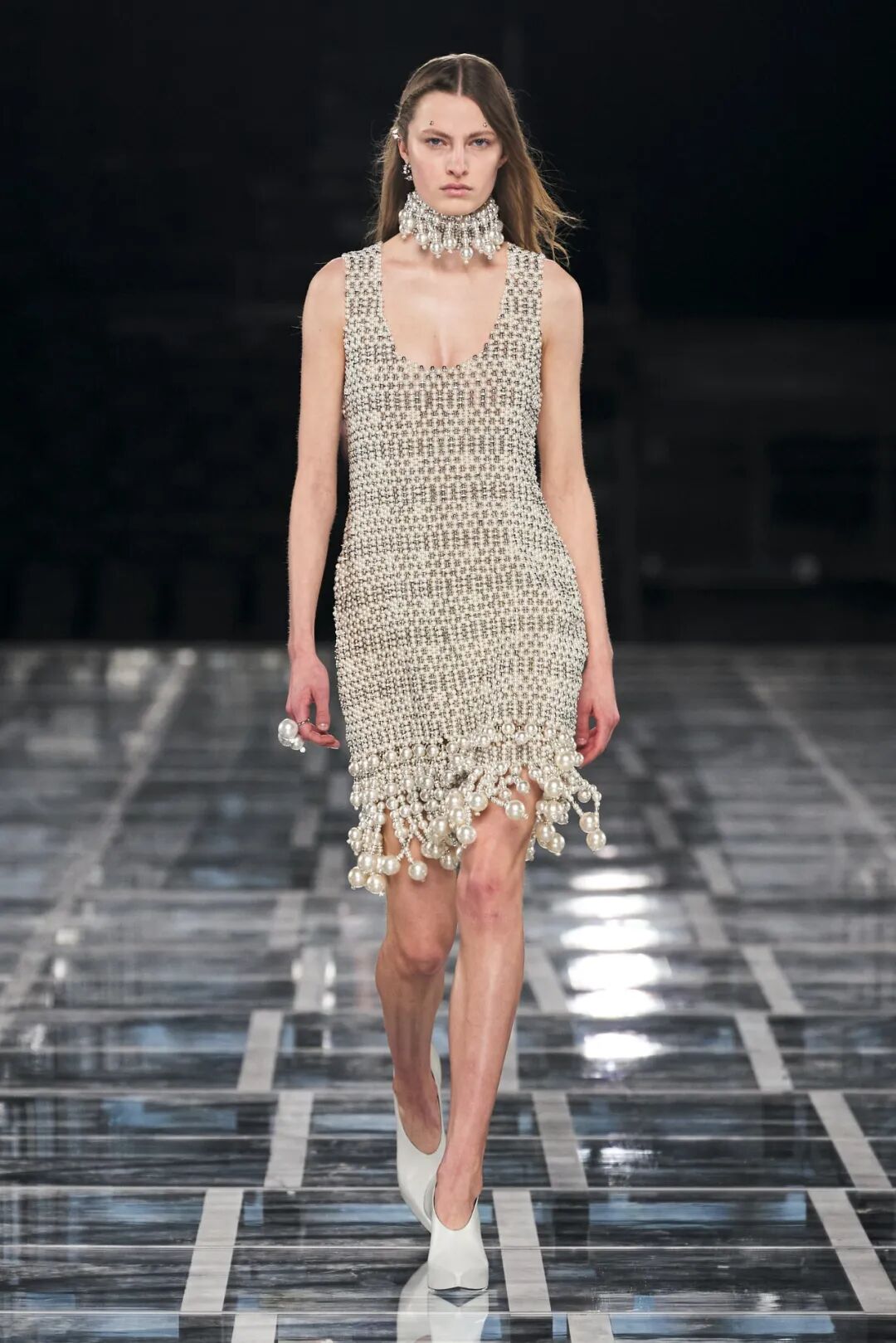 谁说牛仔便是休闲装的代名词?它若是精致起来,说是高定也不为过。本季牛仔裤装被赋予了如公爵夫人缎面般的垂坠柔顺质感,加之犹如繁星般铺陈在上的珍珠装饰,仿若为古典油画中走出的优雅少女披上了一层叛逆不羁的外衣。同样的珍珠亮片元素也被运用到了连衣裙的表达中,无论是极致优雅的原色珍珠,抑或魅力十足的金属色及纯黑珠片,都被高级定制工艺蒙上了一层古典外衣。手工钉珠以铆钉形式铺陈于日常单品上,在实用性与美观性之间搭起了一座桥梁。