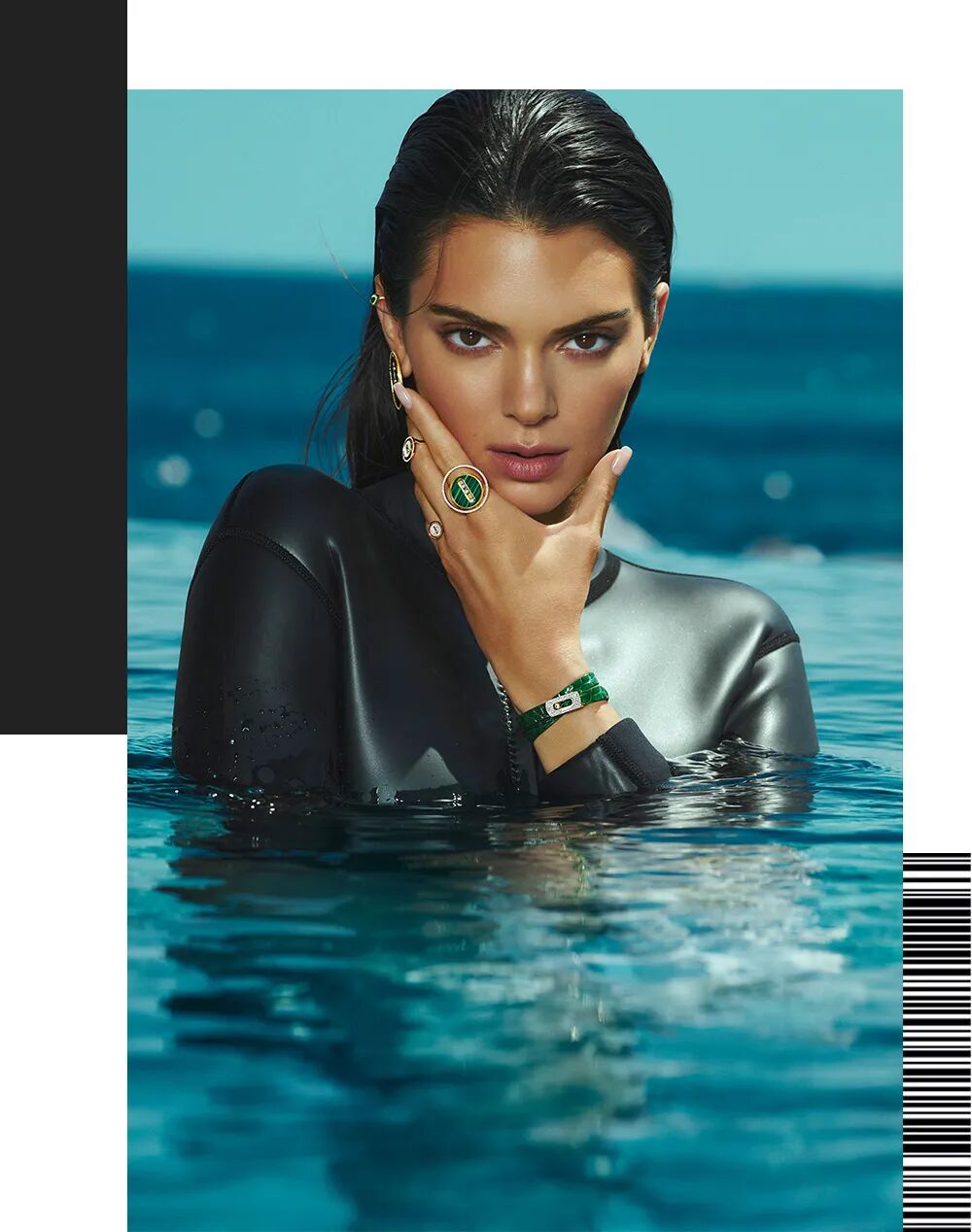 Kendall等一众明星都钟爱的GLAM’AZONE系列,则更多了一丝干练的气场,让力量、女性之美与时尚神秘在这里碰撞。该系列珠宝,以亚马逊的箭与弓弦为参照,一条纤细的直线顶端点缀一颗椭圆切割的钻石,周围则环绕着小颗钻石,形如盾牌一般,象征着力量与生命力。Kendall经常佩戴的GLAM’AZONE系列的密镶钻石双截戒指,独特的可拆卸链,让它既能作为单截戒指每天佩戴也可以叠戴,十分百搭。
