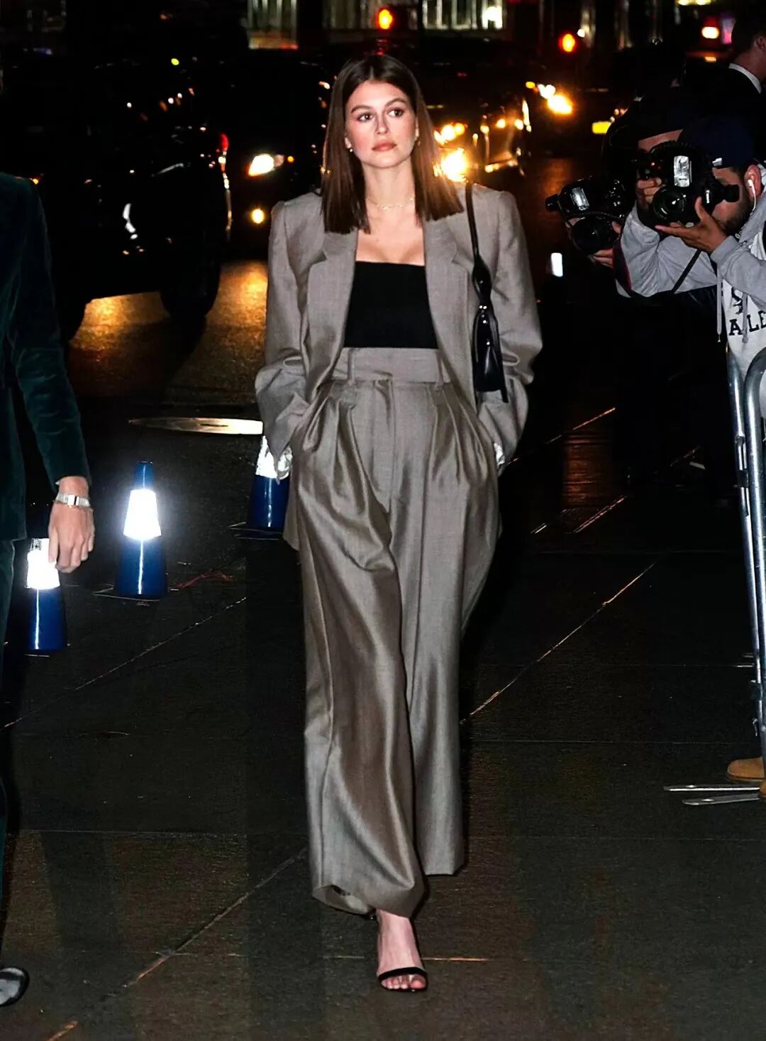 而Kaia Gerber的这一身灰色西装与阔腿西装裤的搭配更是直接把质感拉满,三处黑色点缀精而巧,足以让她成为聚光灯焦点的同时还似乎只是闲庭信步般自得。