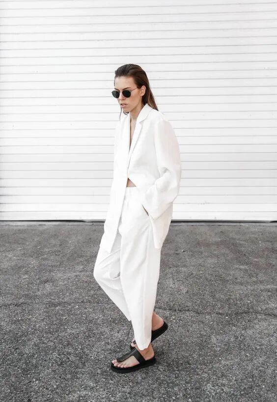 如果想要削弱一点“生人勿近”的气场,稍微挽起西装袖口,踩上一双运动鞋或人字拖,就能极大地降低距离感,显得清爽随性又有腔调。