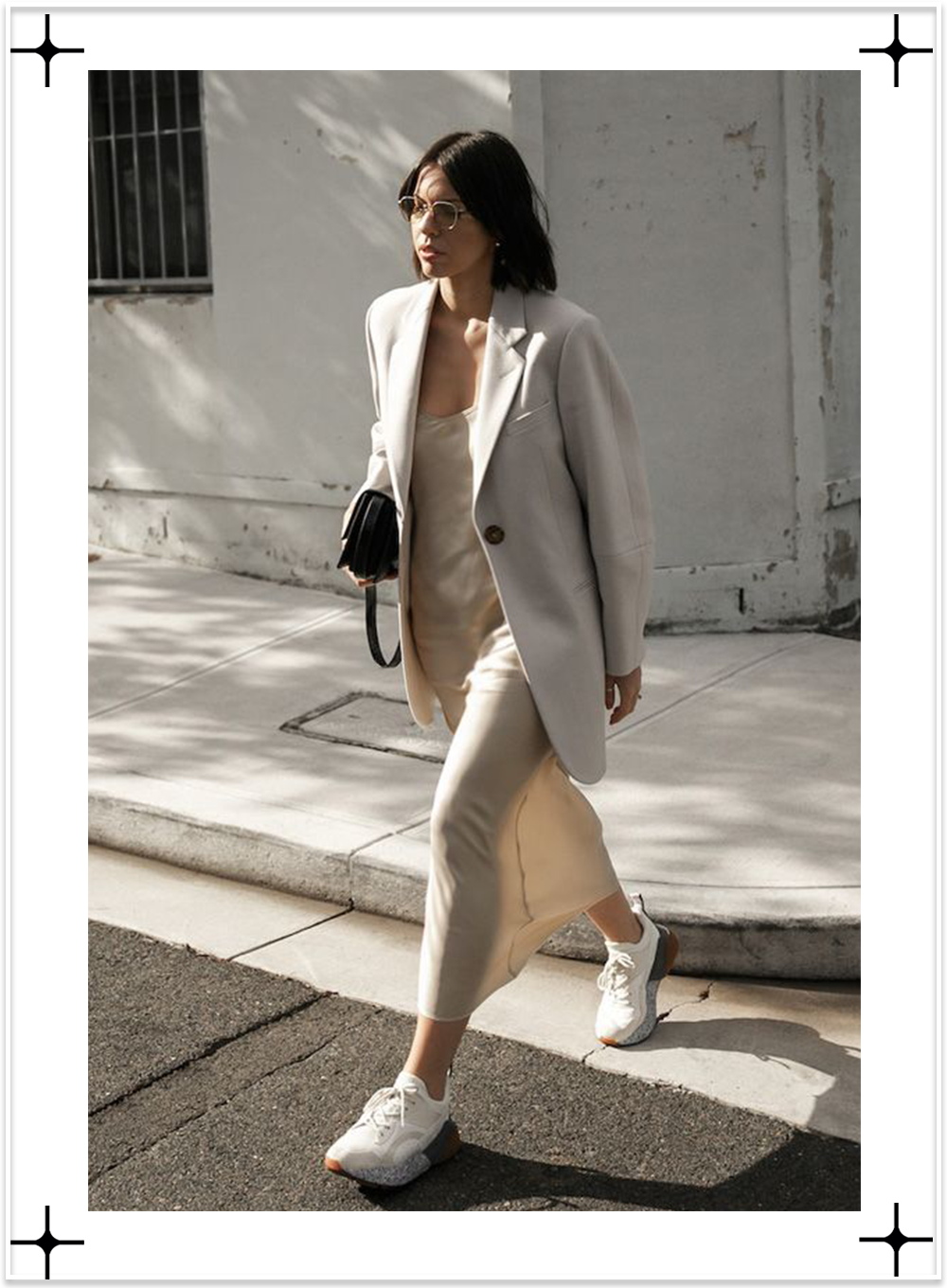 西装加缎面slip dress的搭配轻易实现中性风平衡,而且也正适合四月微凉的季节。