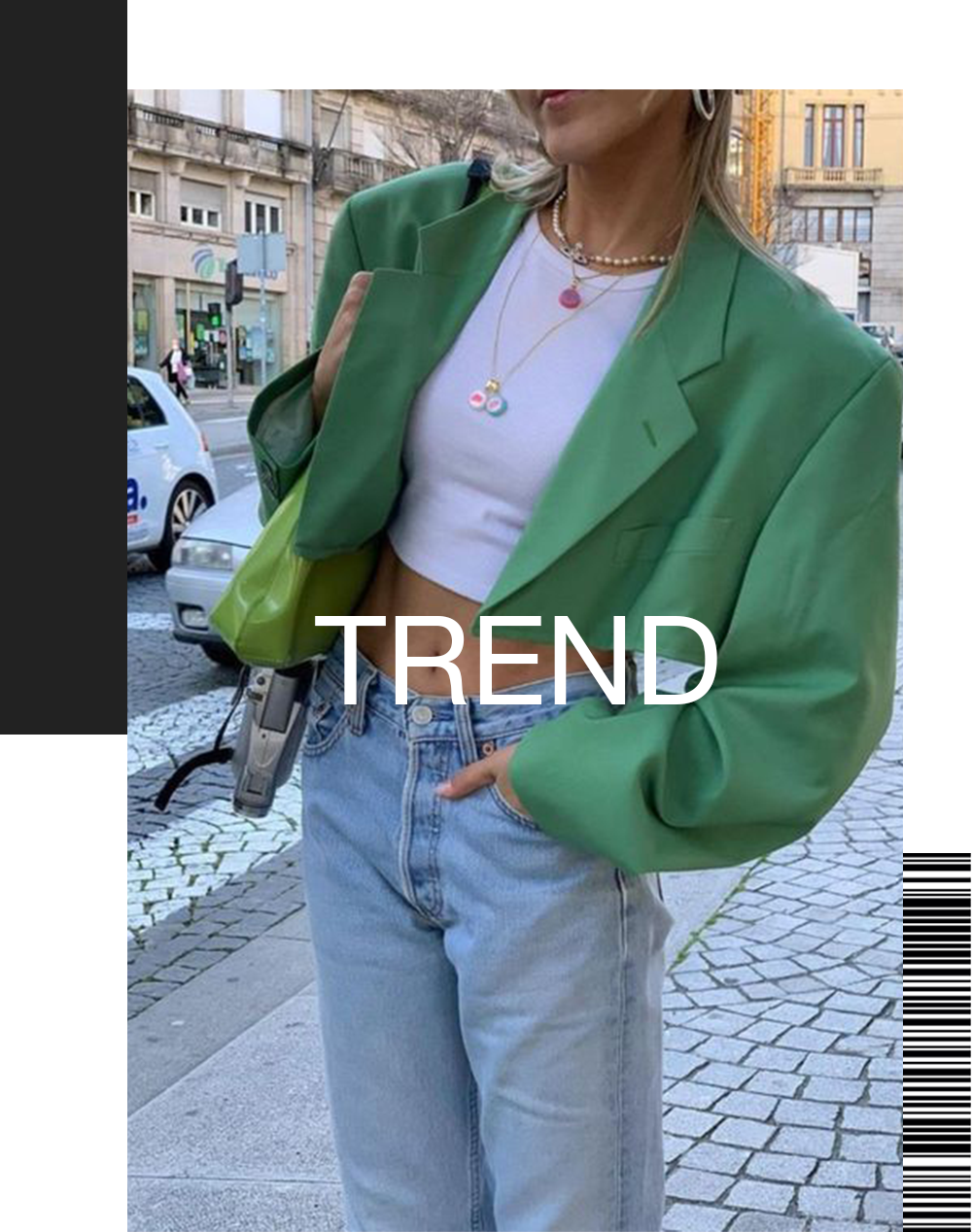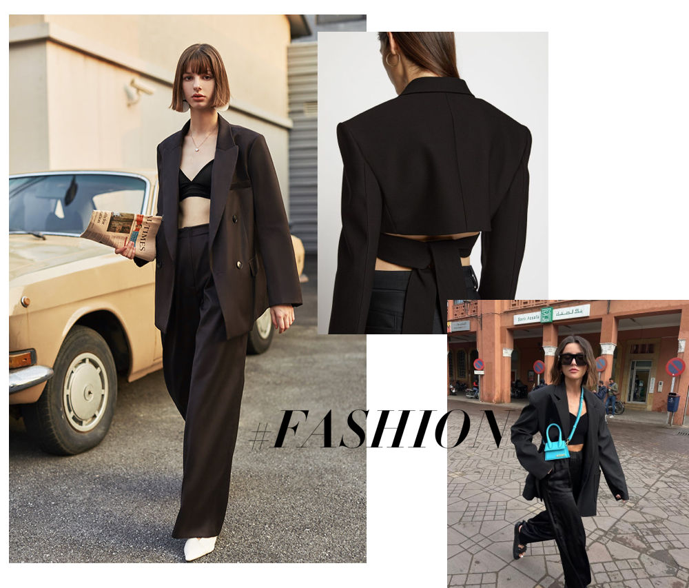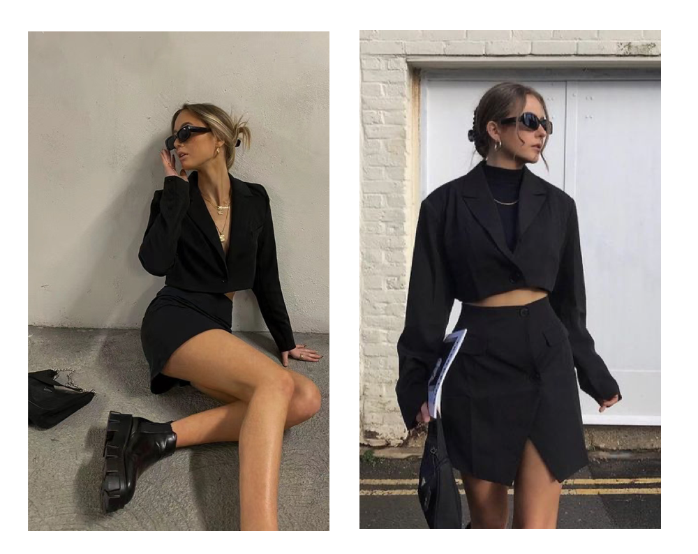有梨形身材烦恼的女生不妨尝试短及腰线以上的Crop西装,堪称显腿长“神器”,穿上后下半身比例立马得到有效拉伸。配上成套的短裙,最适合即将到来的热辣夏天!