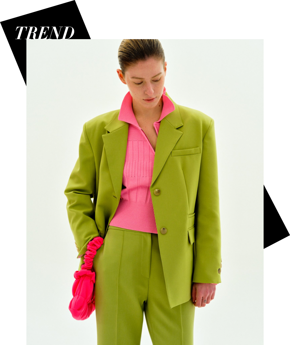 高阶的弄潮儿们更是将高明度撞色进行到底,色块之间的碰撞却赋予了西装别样的魅力。只要搭配得当,就算是看似棘手的“死亡芭比粉”,也能在不经意间变得时髦又优雅。