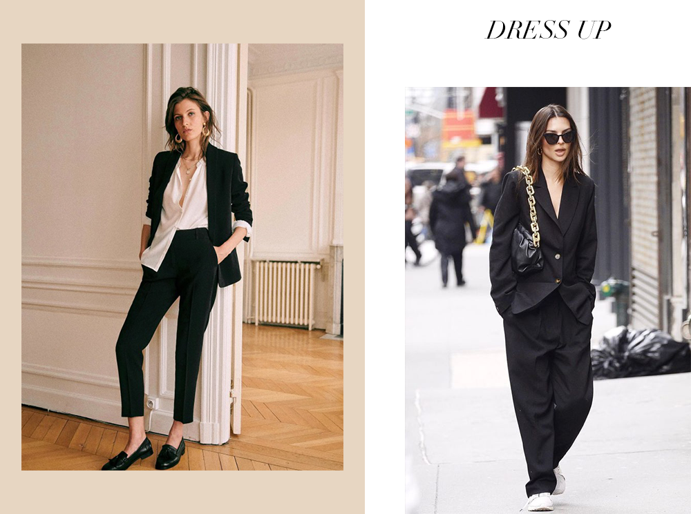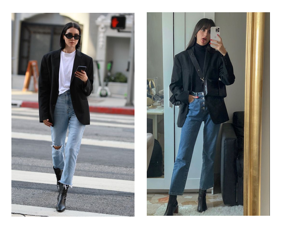 牛仔裤作为另外一个时尚圈万能单品,两者结合自然有1+1>2的效果。丹宁青春不羁的气质能很好地中和黑色西装的成熟感,直筒裤和踝靴的搭配非常适合大家作为日常通勤的最优选择,休闲不失干练。