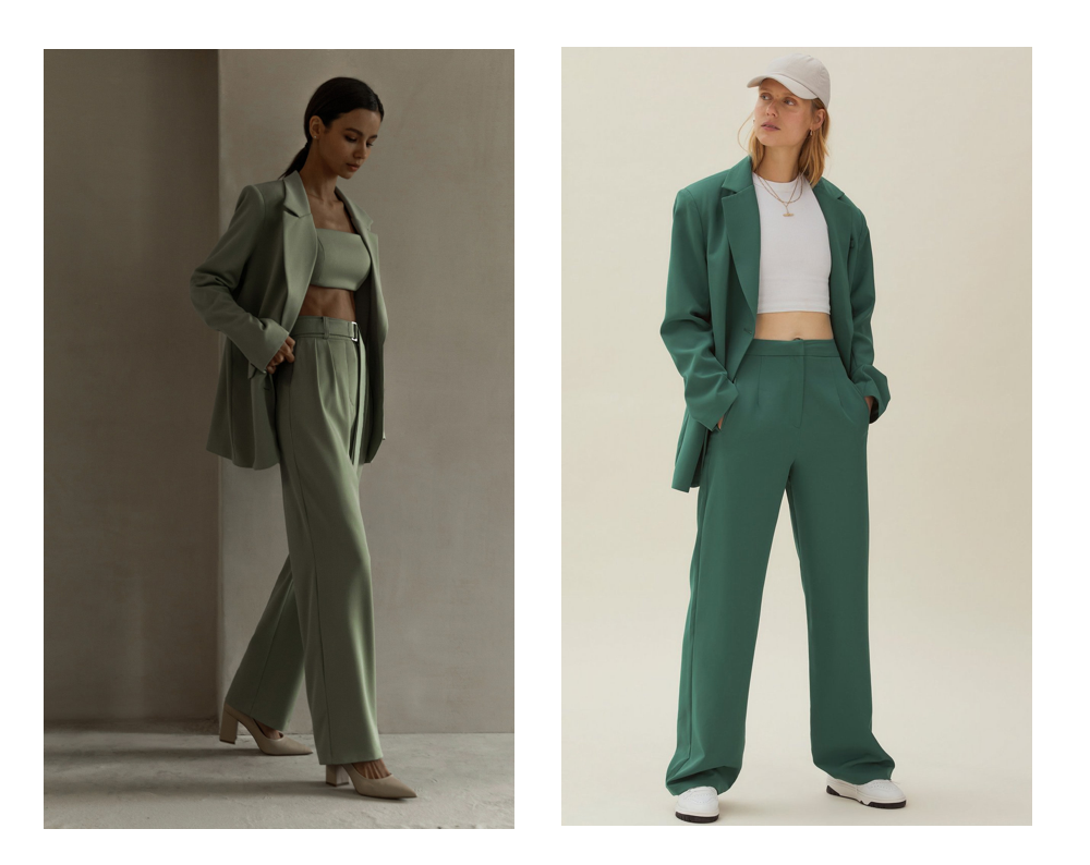 担心饱和度太高不好驾驭,也可以从选择较为柔和的豆绿开始上手。再配上浅色水洗牛仔裤,这样就算是面对彩色西装也能轻松消化。