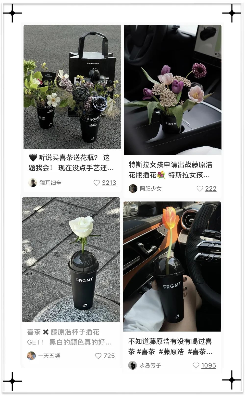 最近很火的藤原浩与喜茶联名的桑葚系列产品,在小红书上刮起了一股“黑化”风。