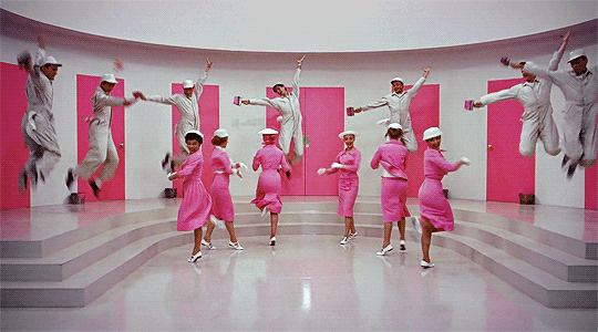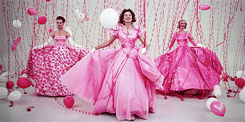 1957年电影《甜姐儿》里一首Think Pink,创造了电影史中的粉色名场面。鲜为人知的是,而电影本意是要讽刺当时粉色对于社会的影响。“Banish the black, Burn the blue, and forget the beige. Now on, go pink!”50年代的fashion icon杰奎琳·肯尼迪作为美国第一夫人期间,就多次穿着粉红色衣服亮相,经典的pink suit也成为她的标志性look。